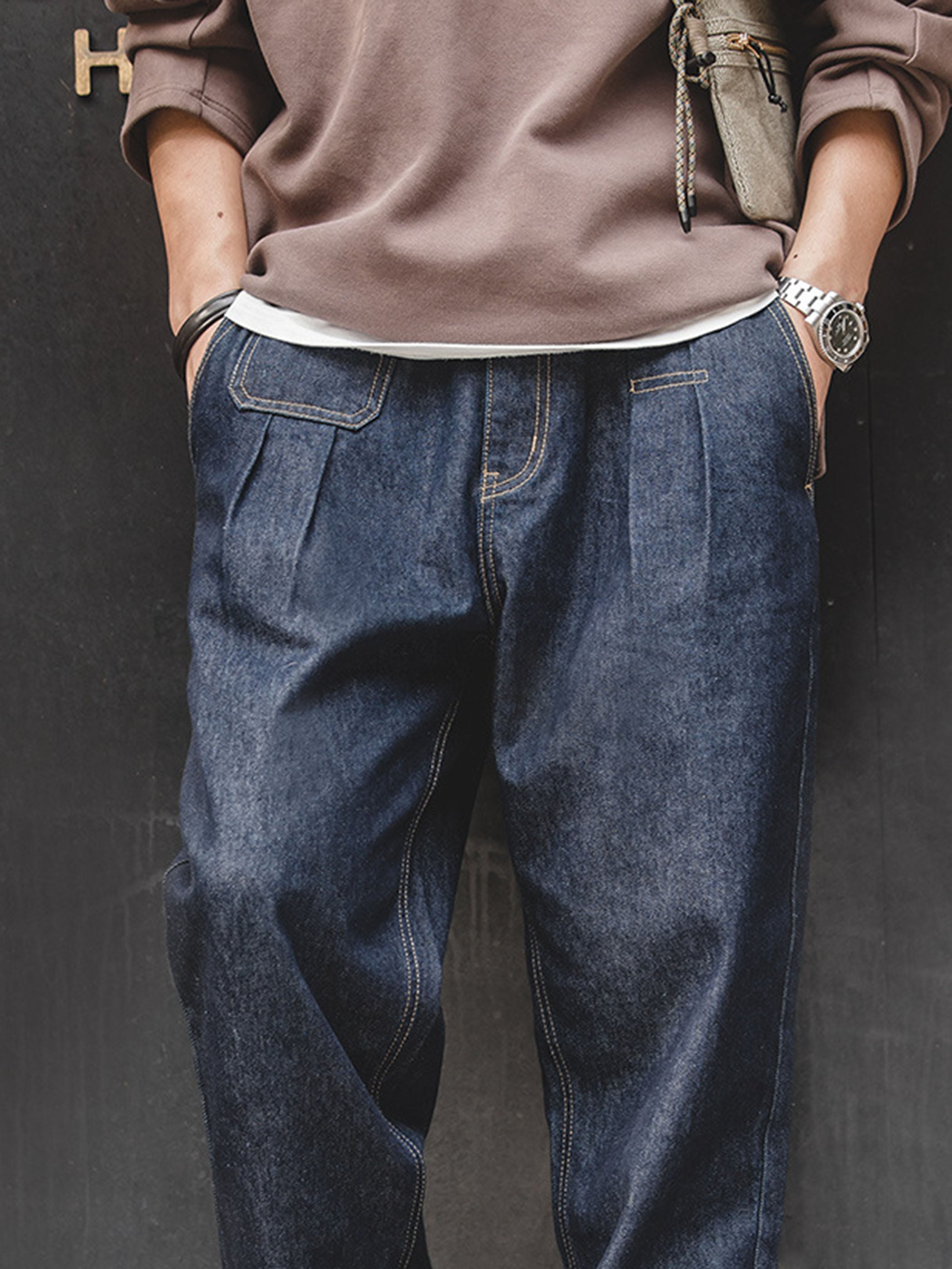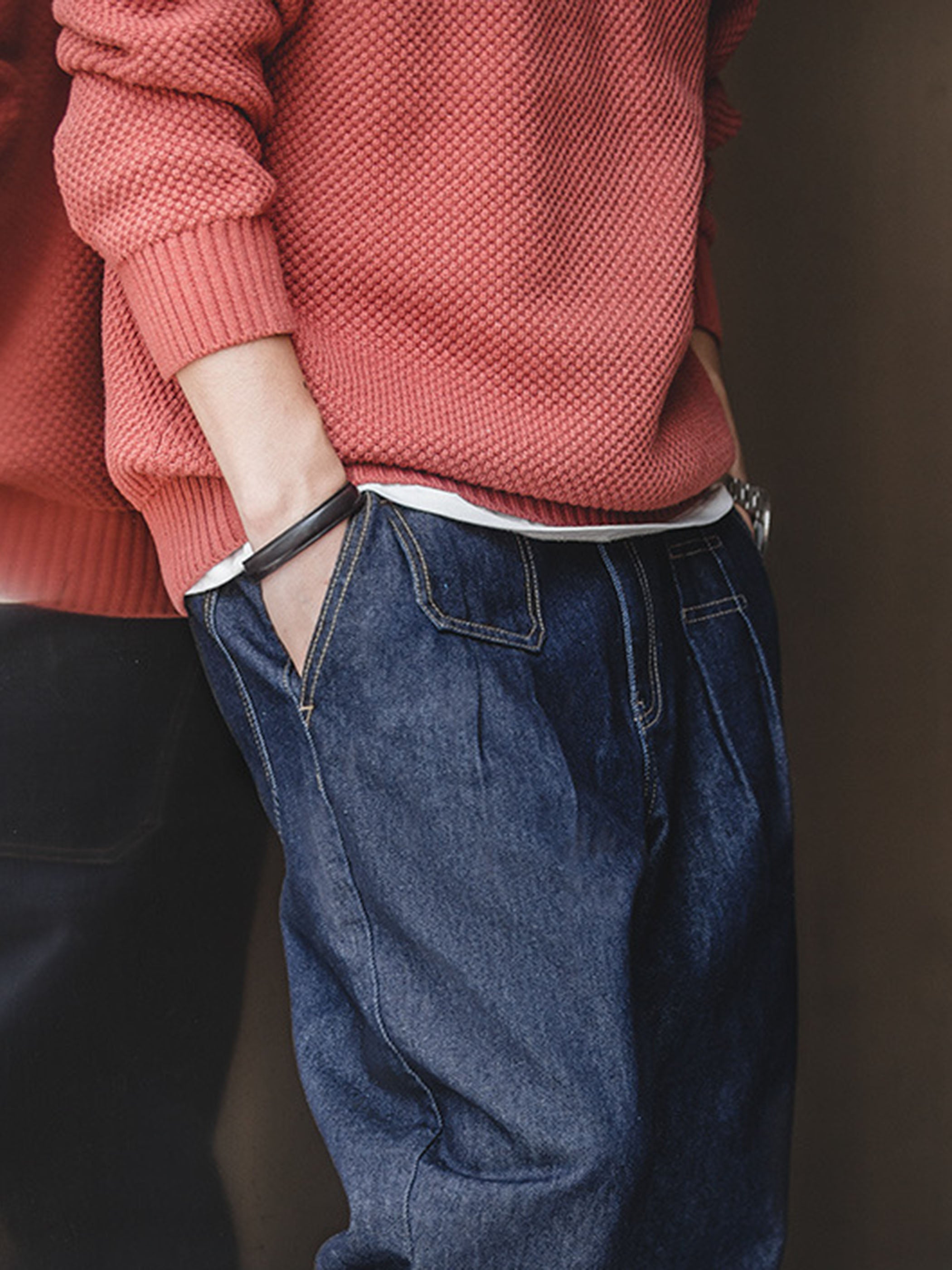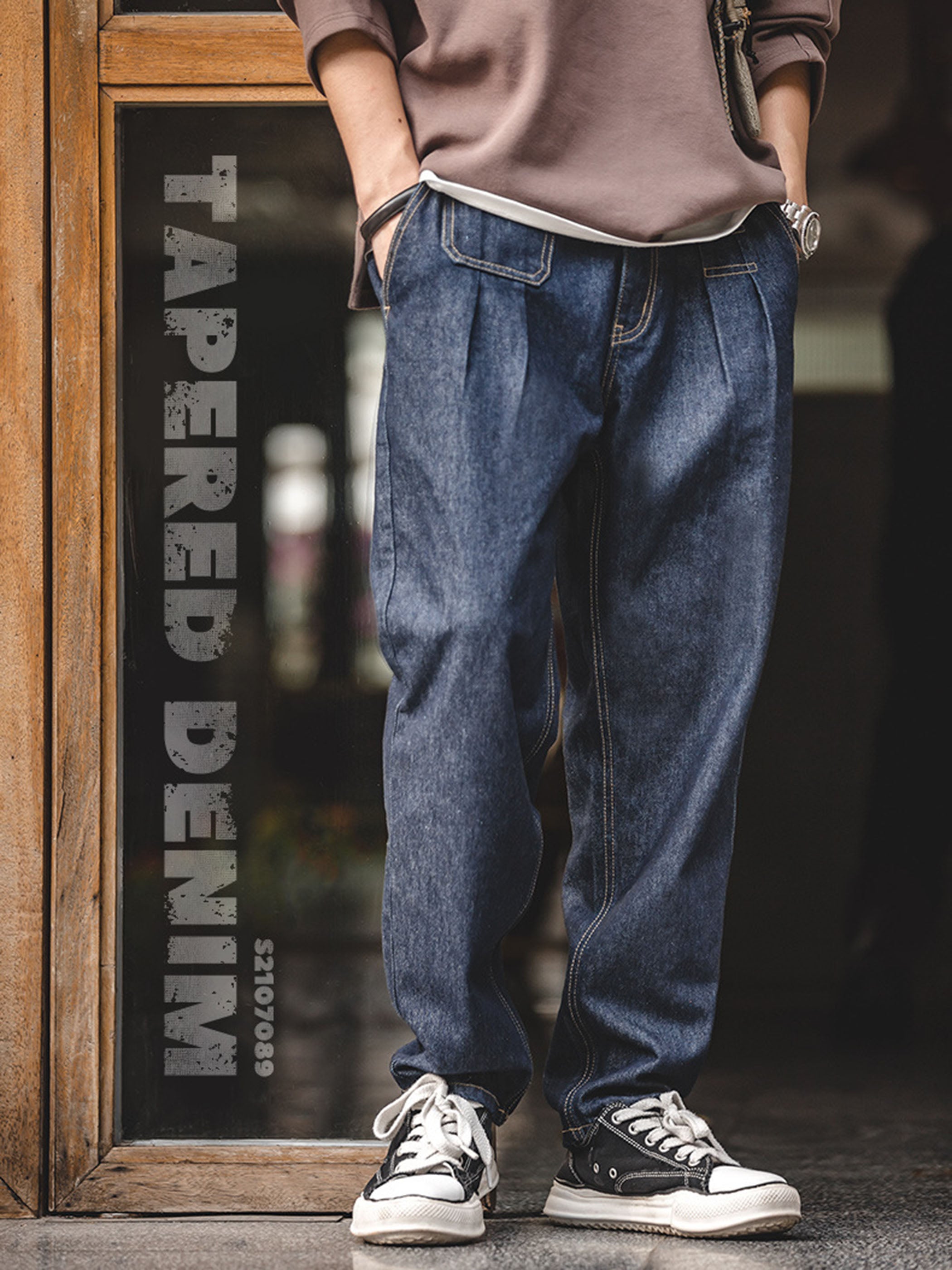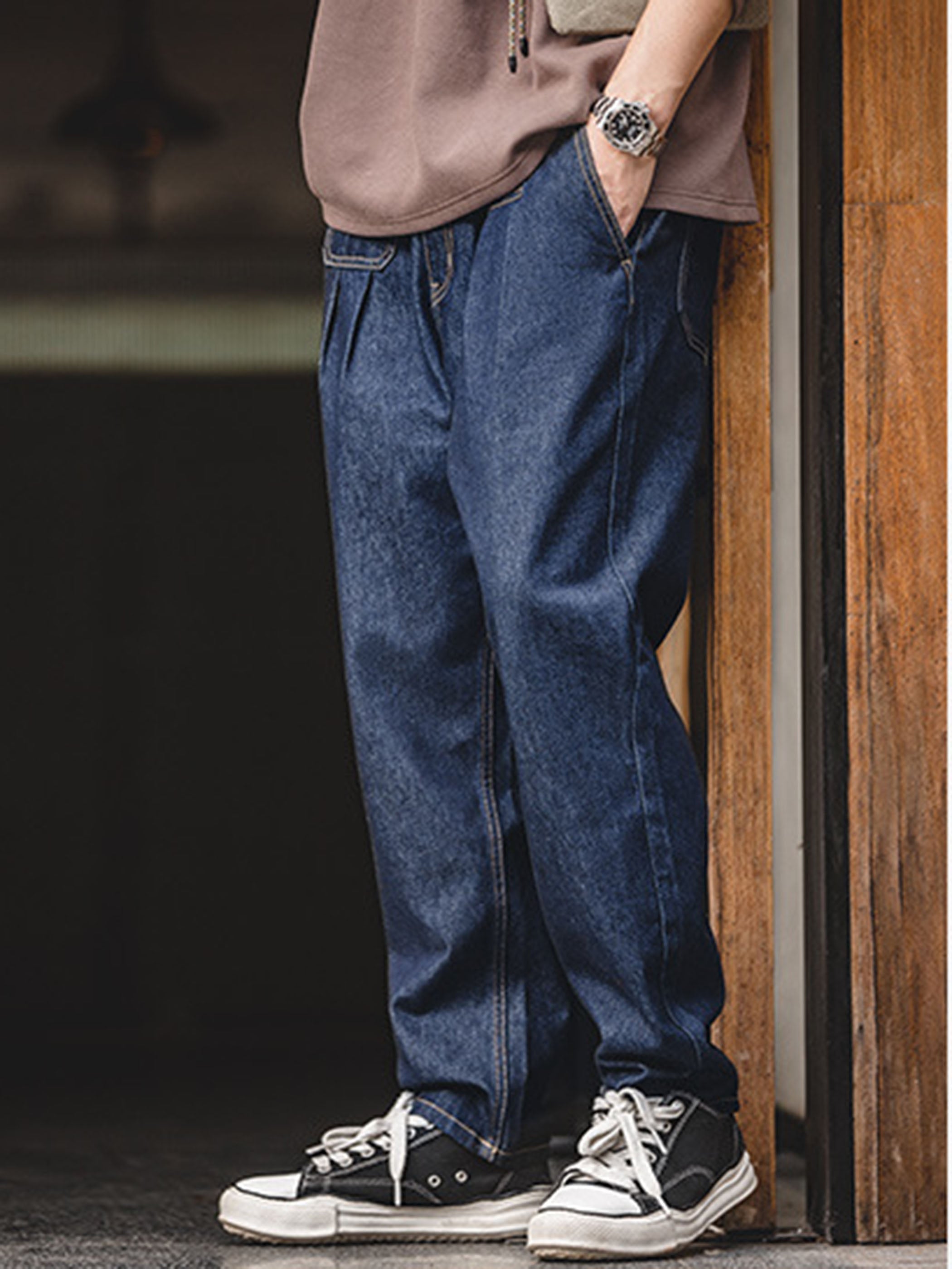 テーパードシルエットにツープリーツを施し、立体感を演出。すっきりとしたフォルムで脚長効果を生み出すデザイン。12.8ozのコットン×ポリエステル混紡デニムを採用し、ウォッシュ加工とカラー定着処理を施すことで、色落ちしにくく、ヴィンテージの風合いを長く楽しめる仕様に仕上げました。