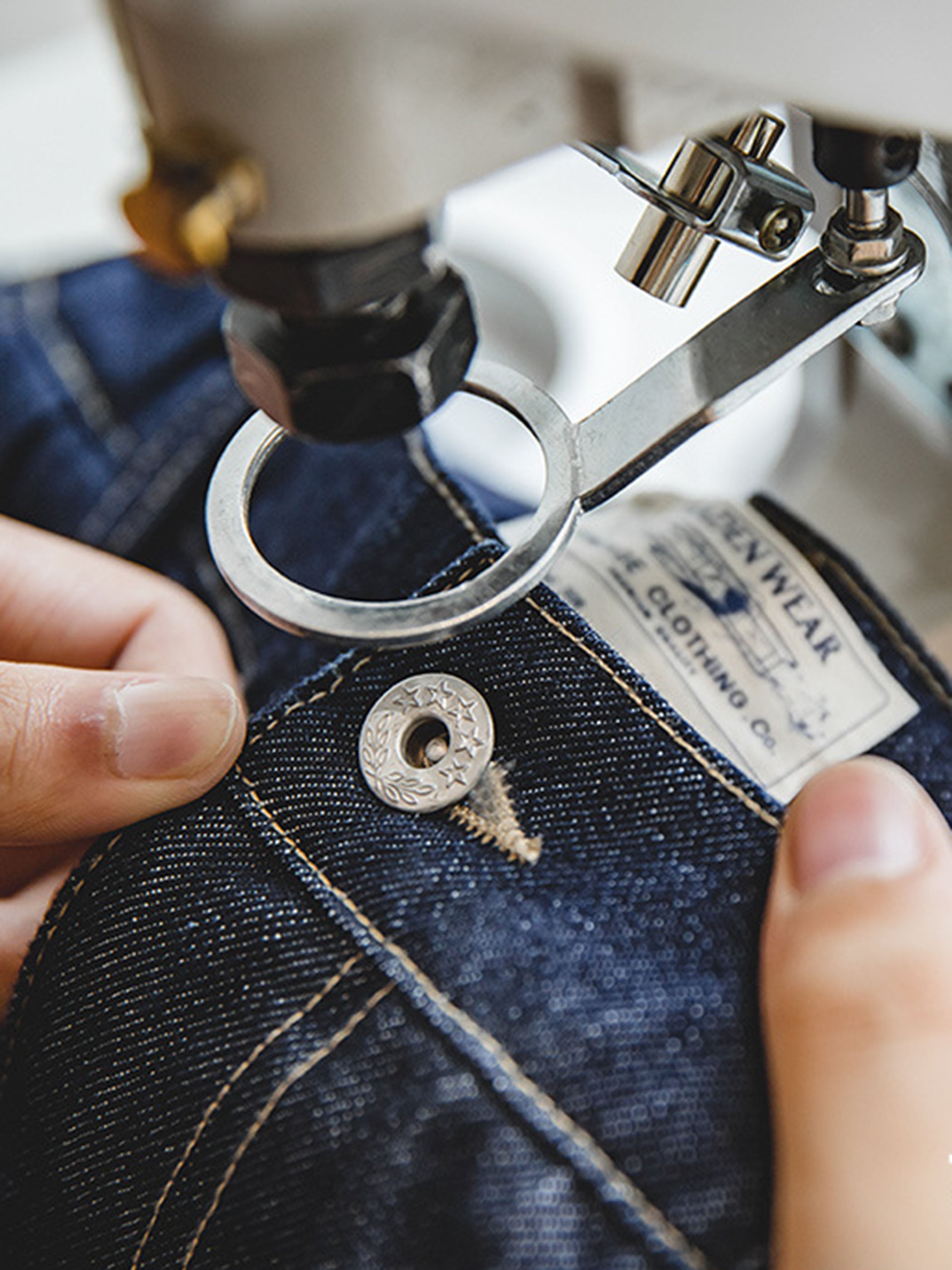 両サイドにはウエストゴムを配置し、ストレスフリーな履き心地を実現。バックにはアシンメトリーデザインのポケットを採用し、細部までこだわったクラシックなディテールをプラス。さらに、シグネチャーデザインのムーンバックルとヴィンテージコットンラベルがアクセントとなり、デザイン性を強調。