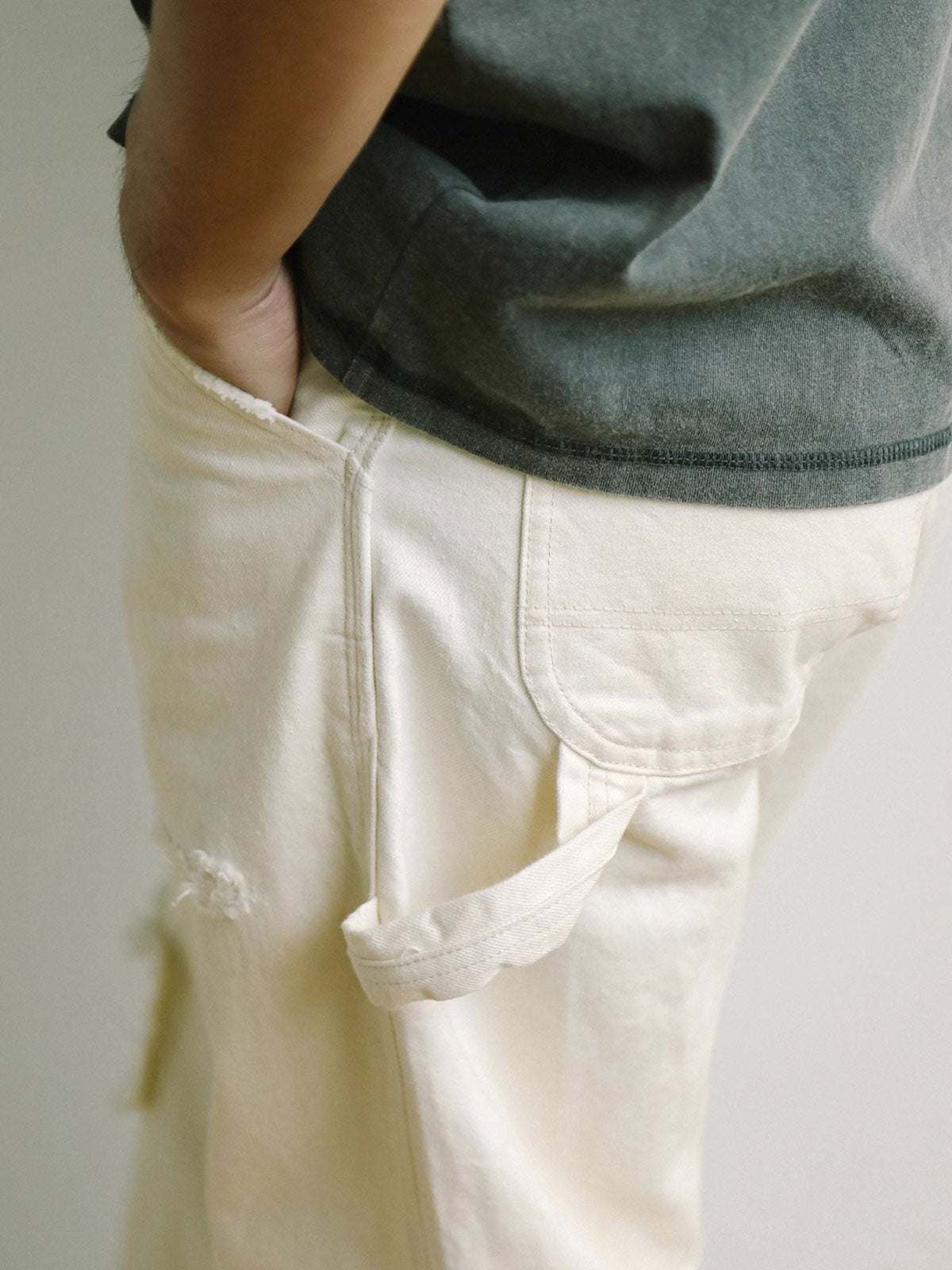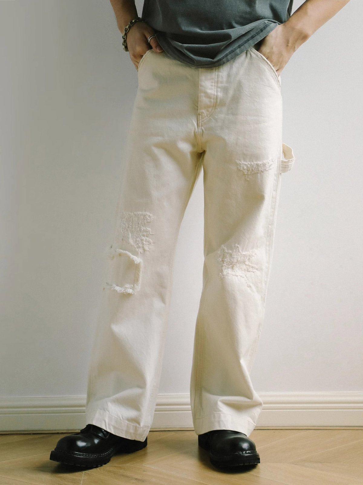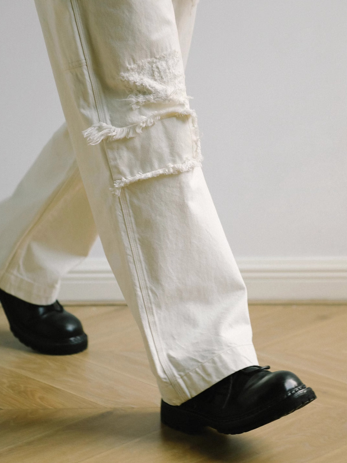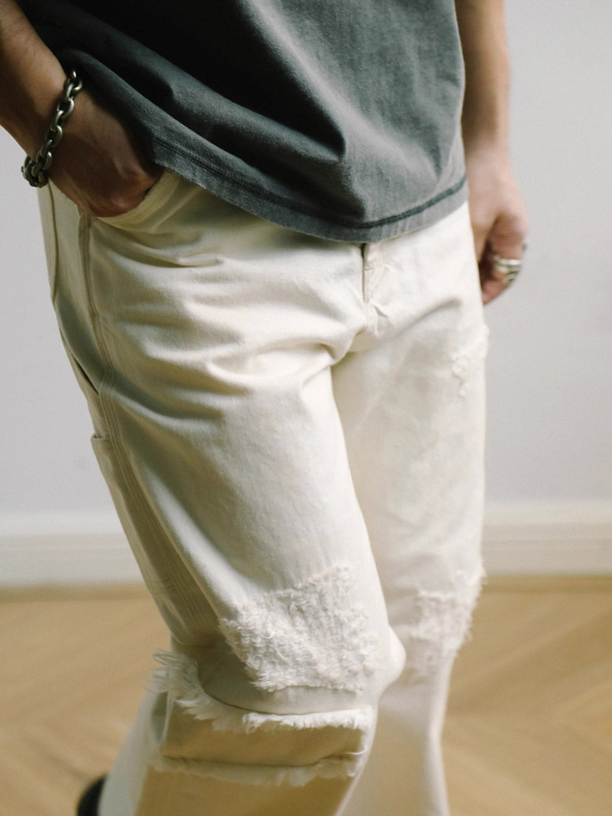 このジーンズは、14.70オンスのアンティーク織機で織られたブルーセルビッジデニムを使用し、高品質なセロスパン紡績技術で作られています。生地の密度は75*46で、高い強度と耐久性を持ち、手触りは滑らかで快適です。全体に施された大きな破れ刺繍加工が、ヴィンテージ感を引き立て、製品洗浄と染色によって古びた黄ばみ効果が現れます。前後のウエストラインを調整し、ウエストとヒップにぴったりフィットさせることで、お腹を目立たせず、ヒップラインをすっきりと見せます。膝と裾はワイドレッグデザインで、洗練されたシルエットを実現しています。裏地にはポリエステルとコットンの混紡素材を使用し、肌に貼り付かず、耐久性も高いです。全体にYKKのカスタムメイドのボタンやリベットを使用し、高密度のステッチでしっかりと仕上げられています。原綿の色合いで、微細なコットンシェルを含み、手触りは滑らかで高級感があります。