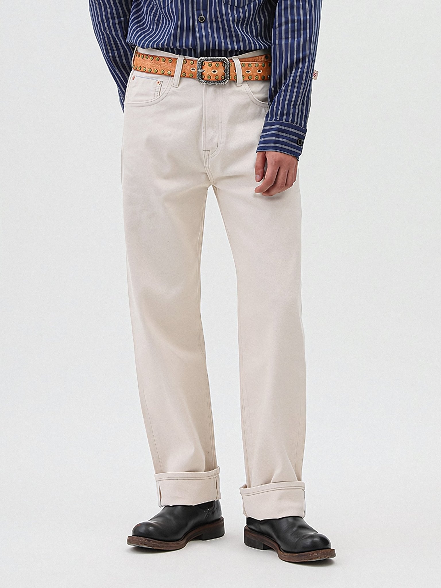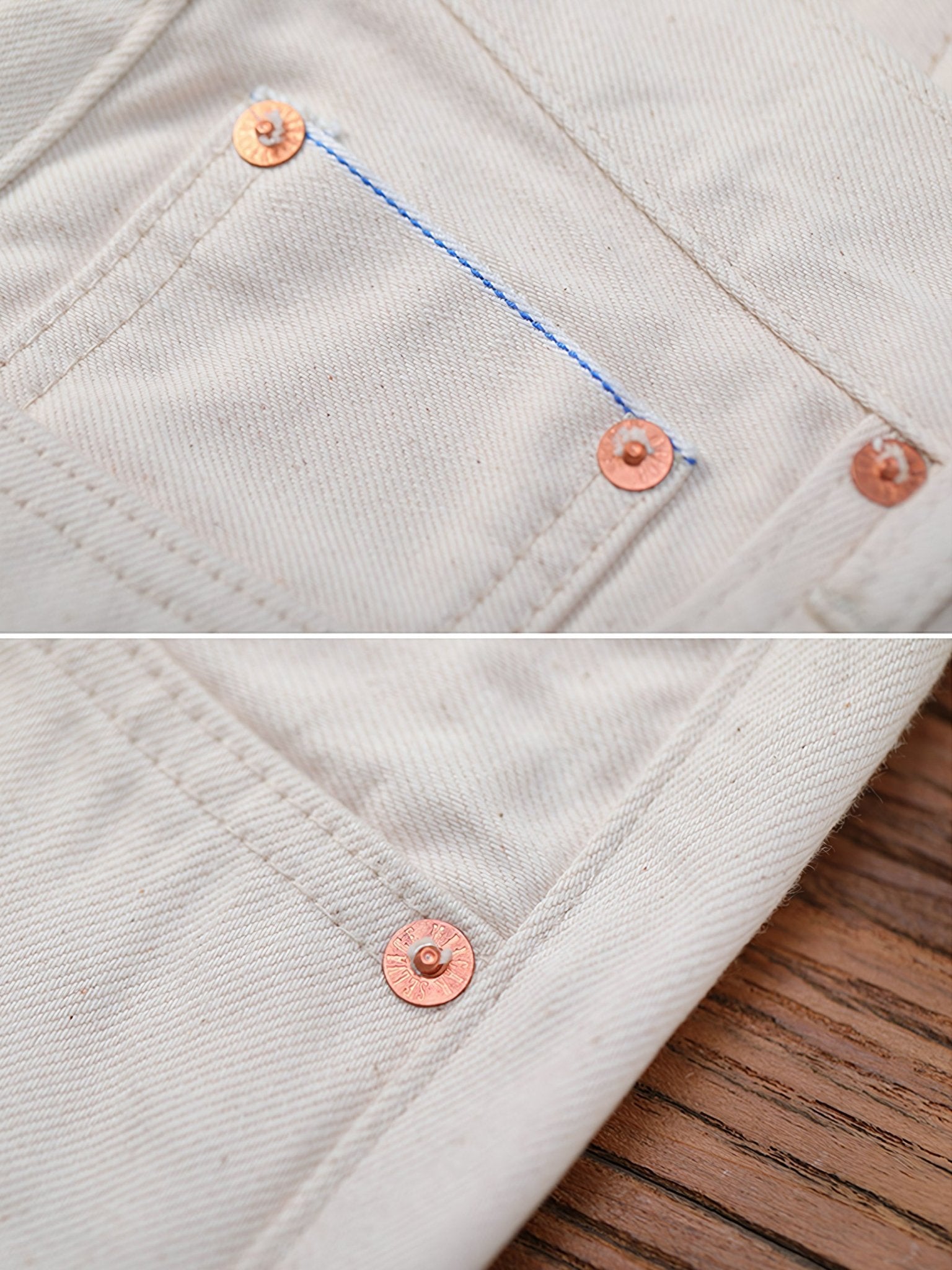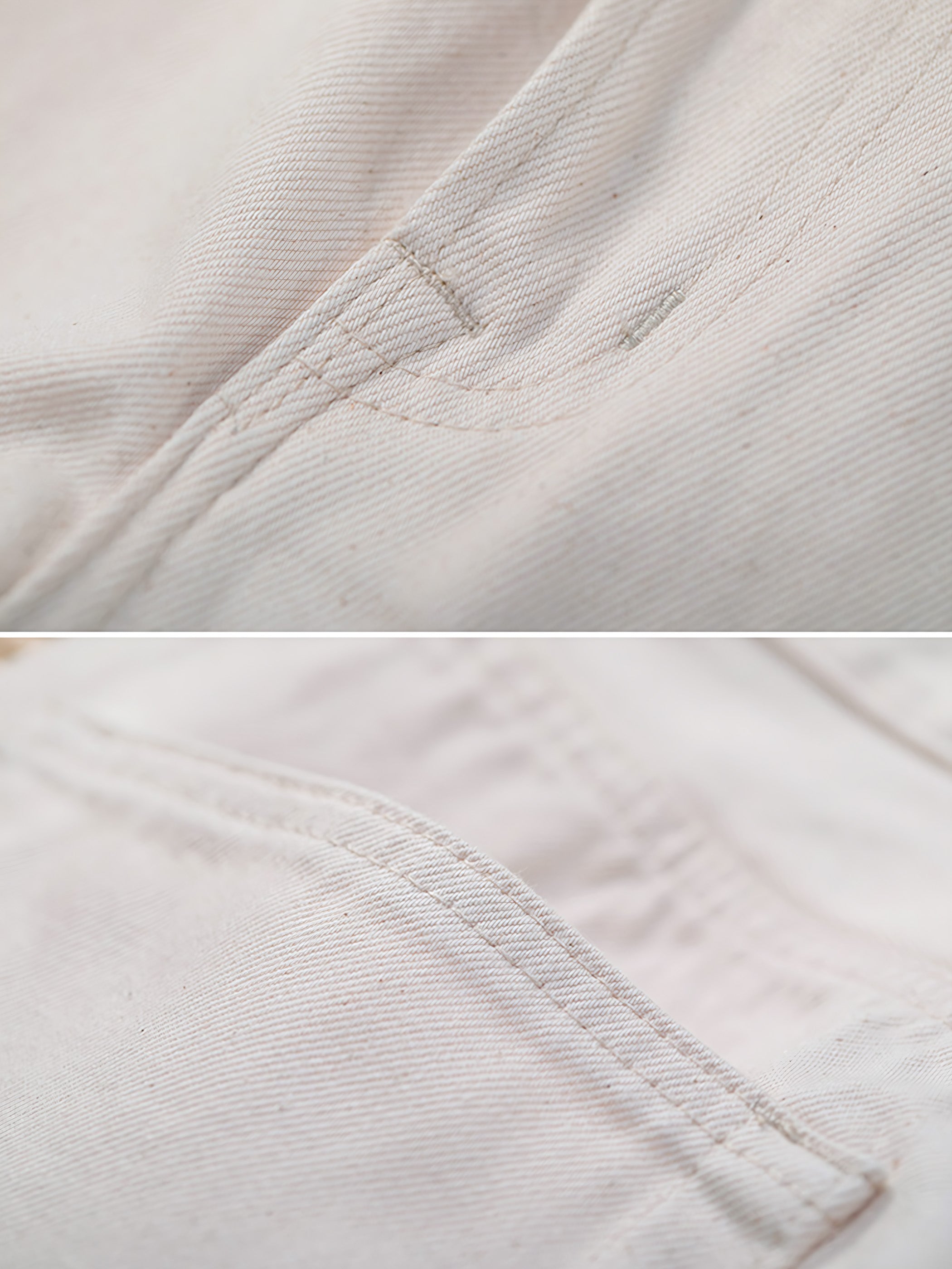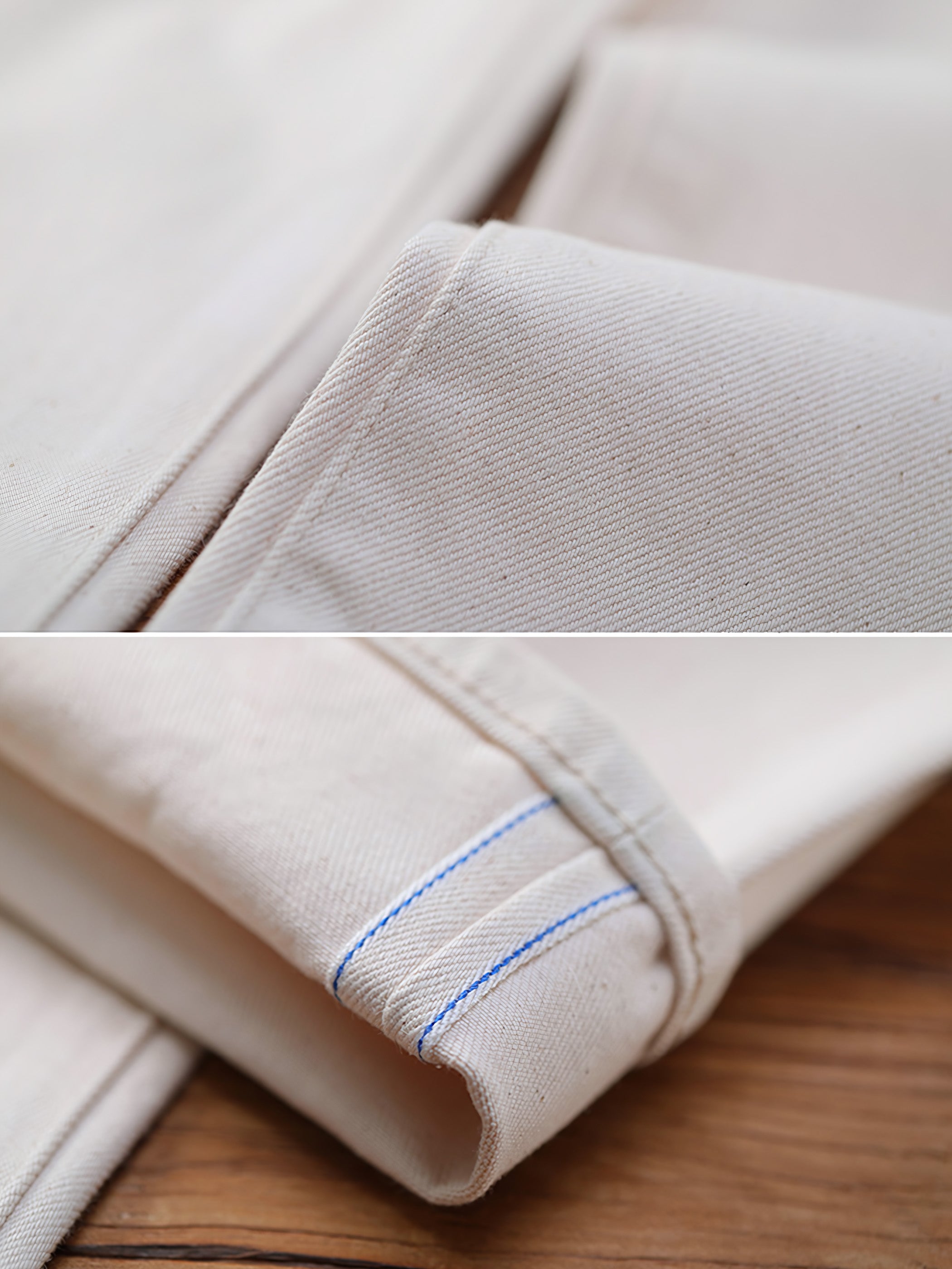 縦糸と横糸に太いムラのある糸を使用した12オンスの赤耳デニムは、耐久性がありながら柔らかな履き心地を提供します。オフホワイトの色合いがビンテージな雰囲気を醸し出し、独自のスタイルを演出します。