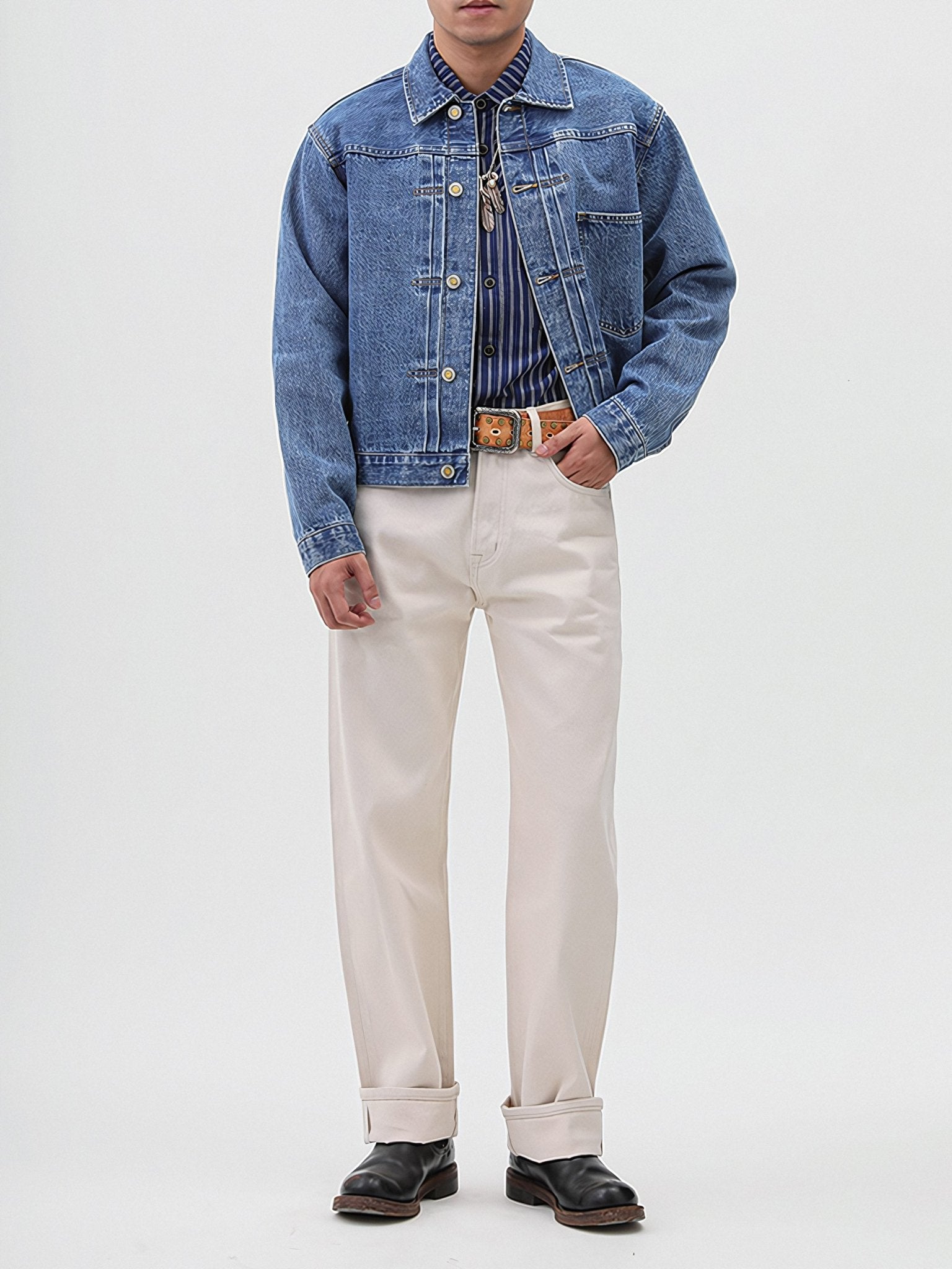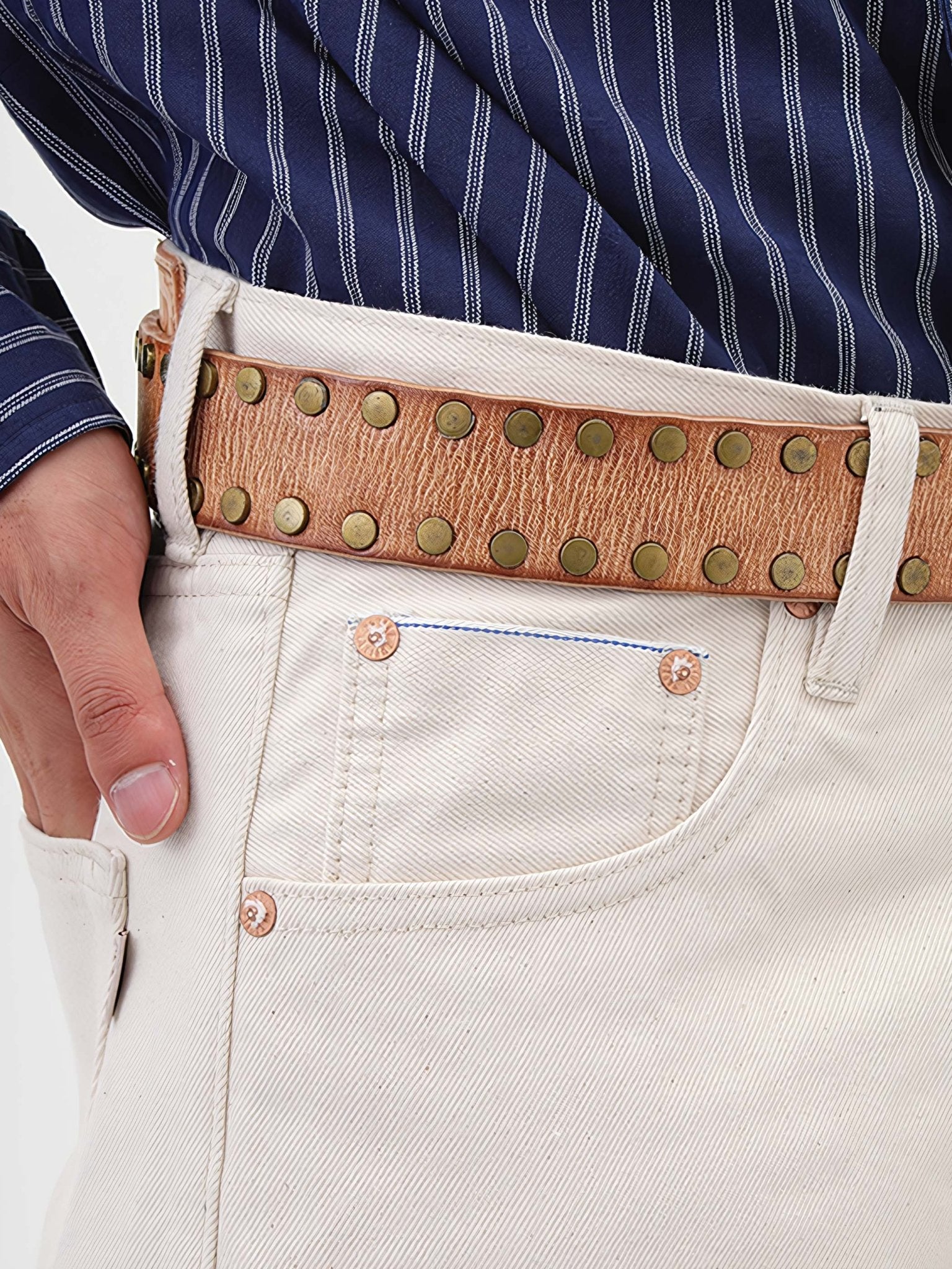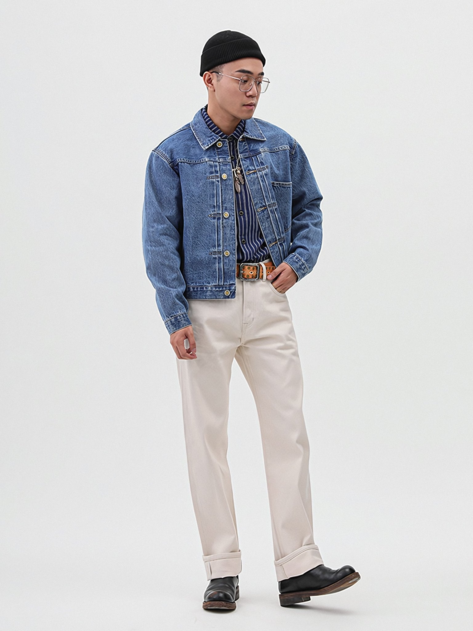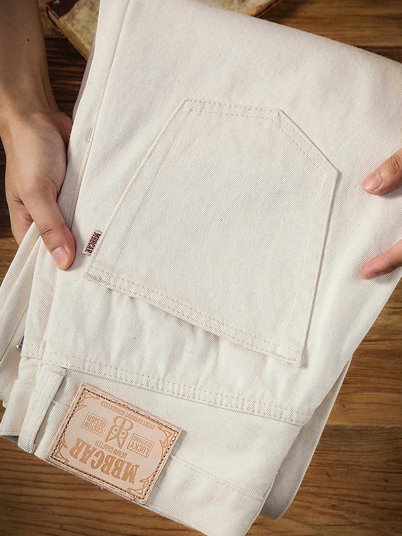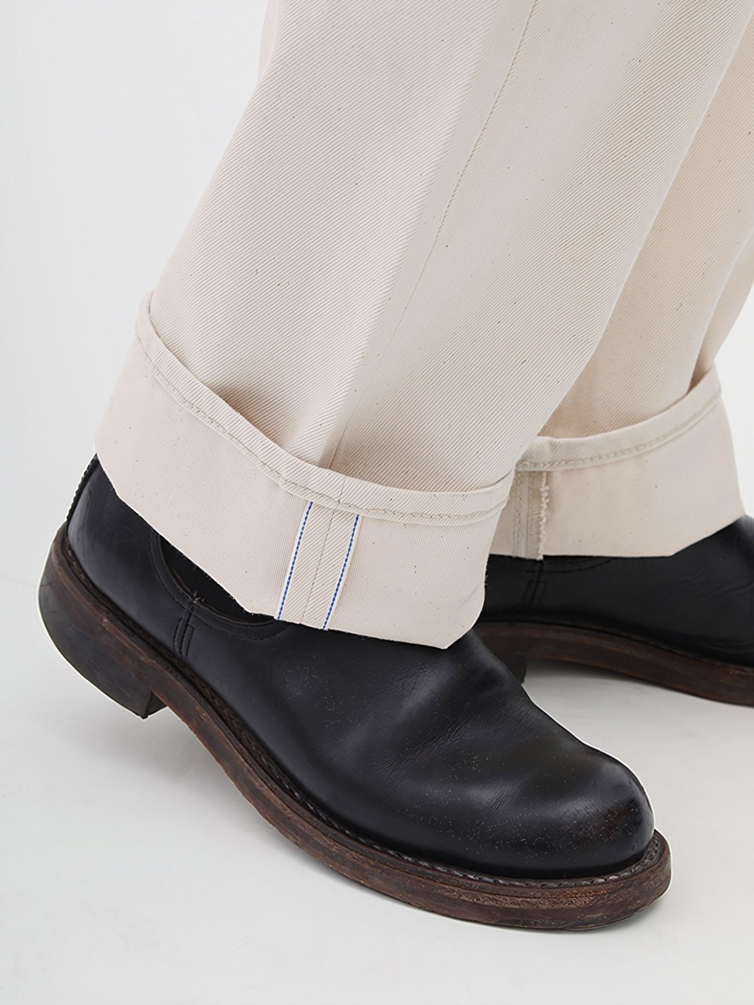 縦糸と横糸に太いムラのある糸を使用した12オンスの赤耳デニムは、耐久性がありながら柔らかな履き心地を提供します。オフホワイトの色合いがビンテージな雰囲気を醸し出し、独自のスタイルを演出します。