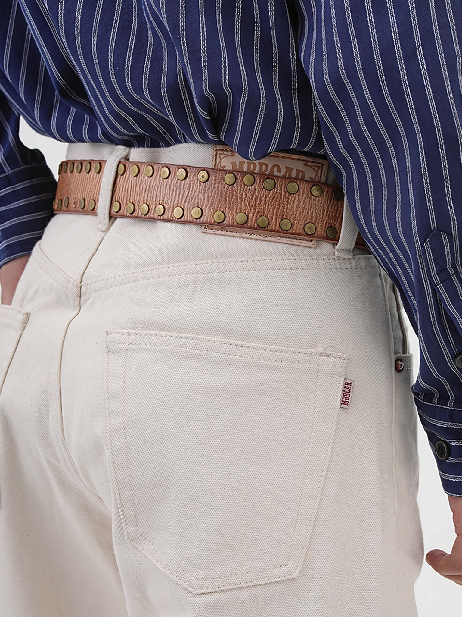オフホワイトの12オンス赤耳デニムは、コットンの殻や綿実が残った状態で表現されており、絶妙なビンテージ感を醸し出しています。フロントには2つの大きなポケットが配置され、背面には2つのパッチポケットがあり、機能性が豊富です。また、植物タンニン鞣しのレザーパッチはブランドの歴史を象徴しています。