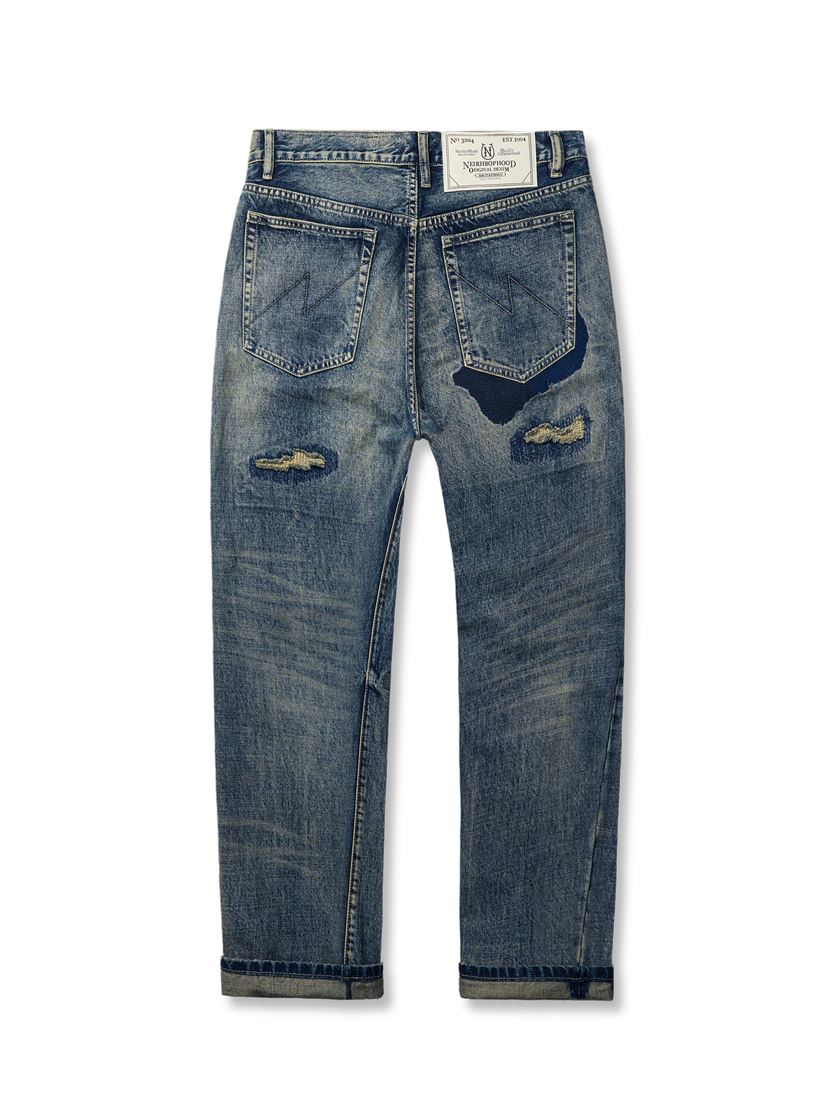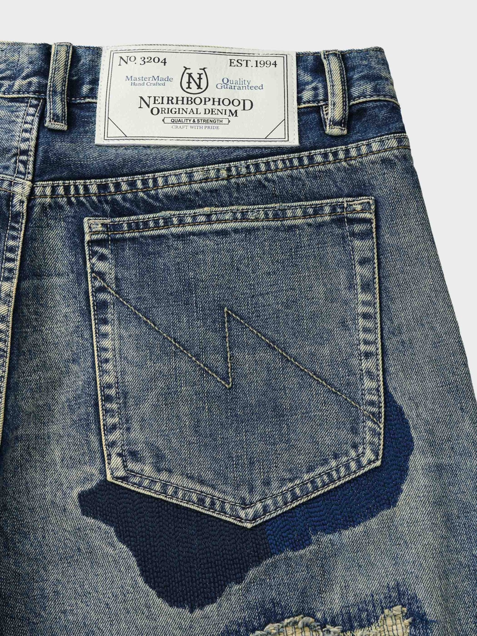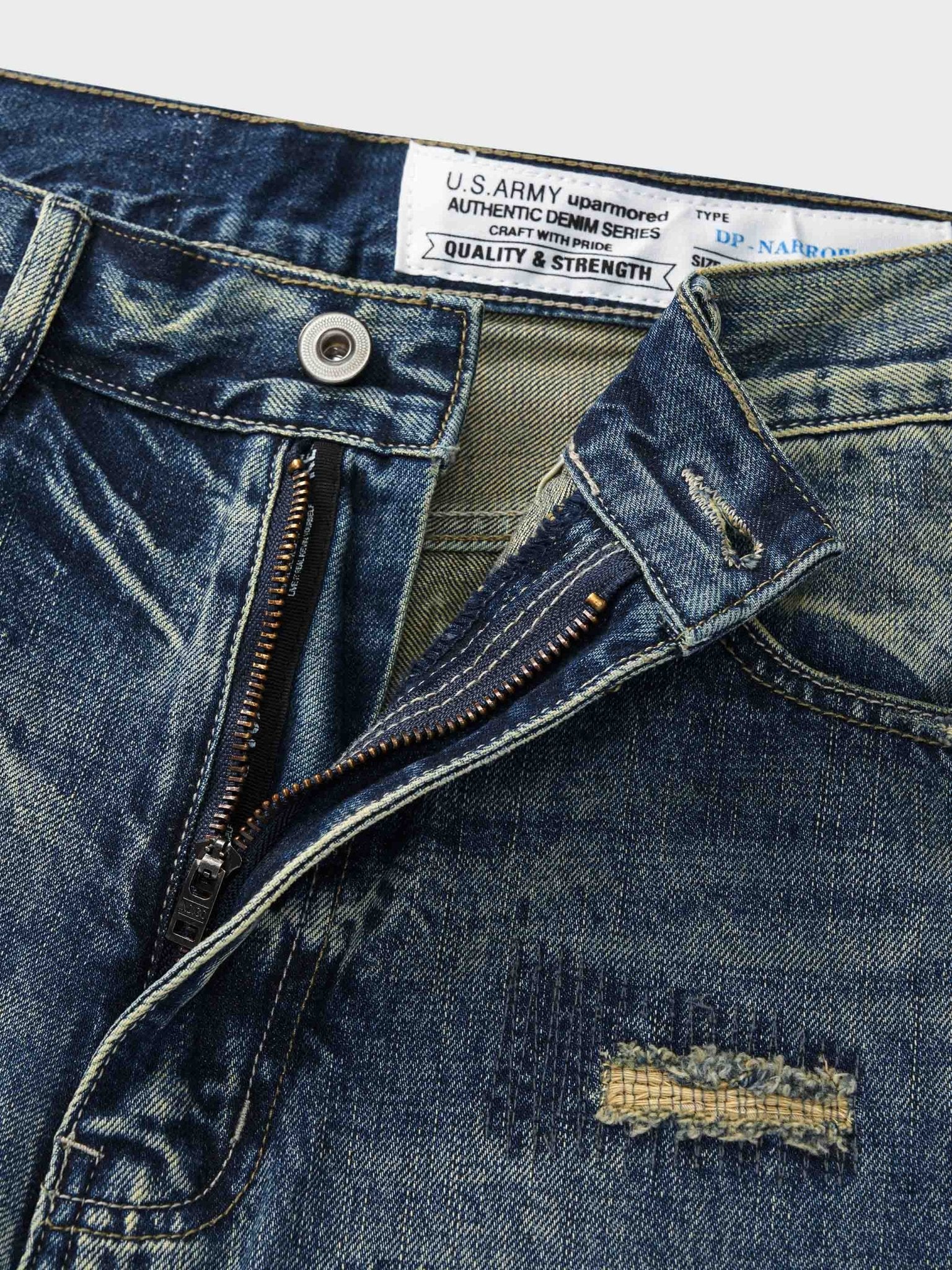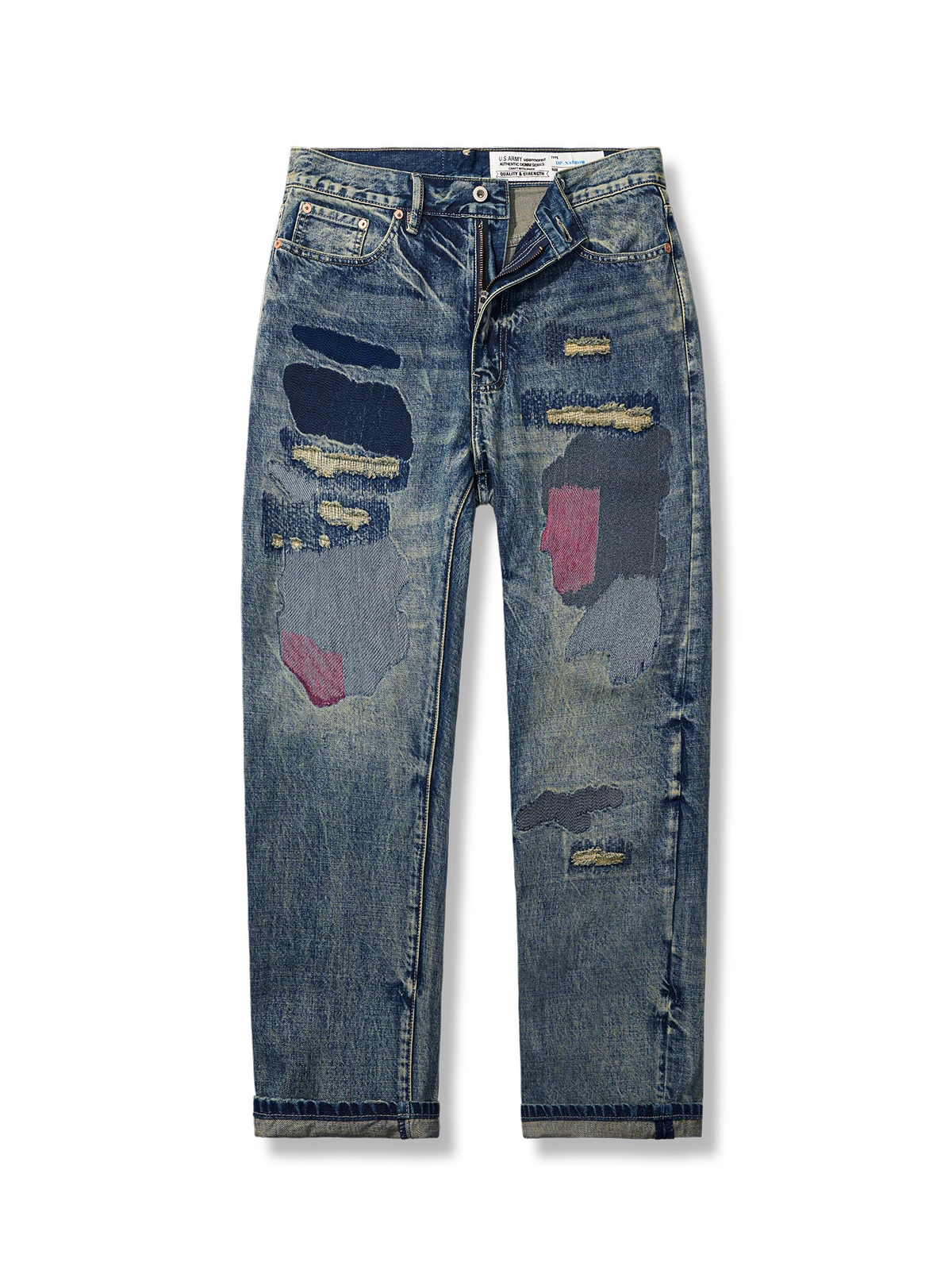 ヴィンテージ加工する事により、見た目の違う生地でパッチワークをし、アメカジ古着テイストを盛り込んだデニムパンツ。