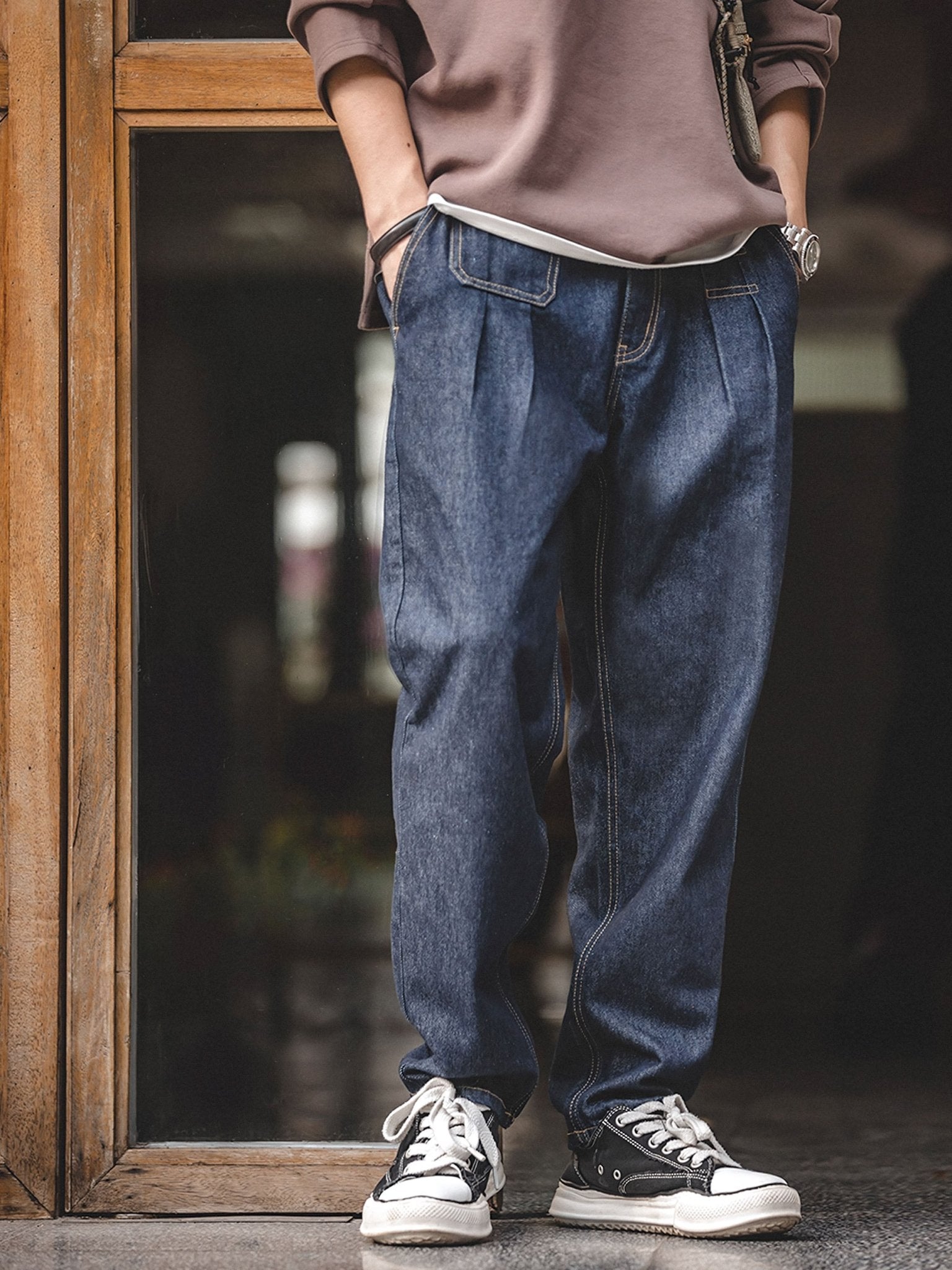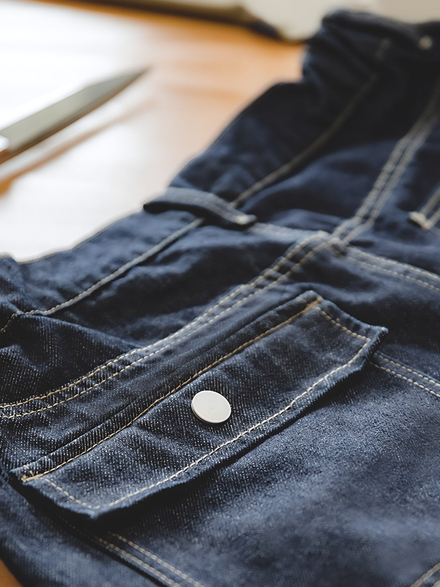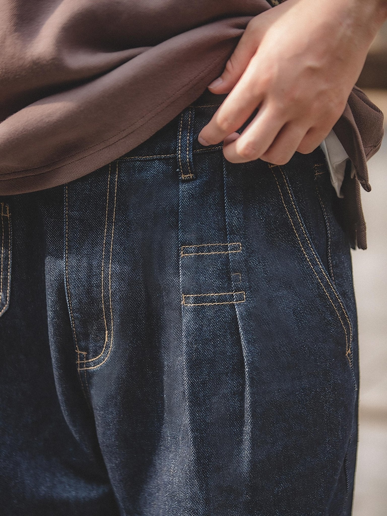 生地はウォッシュ加工が施されており、パンツは快適な手触りと質感を持つ特徴を持っています。デニム生地の使用は、パンツに独特の質感と視覚的効果をもたらしています。