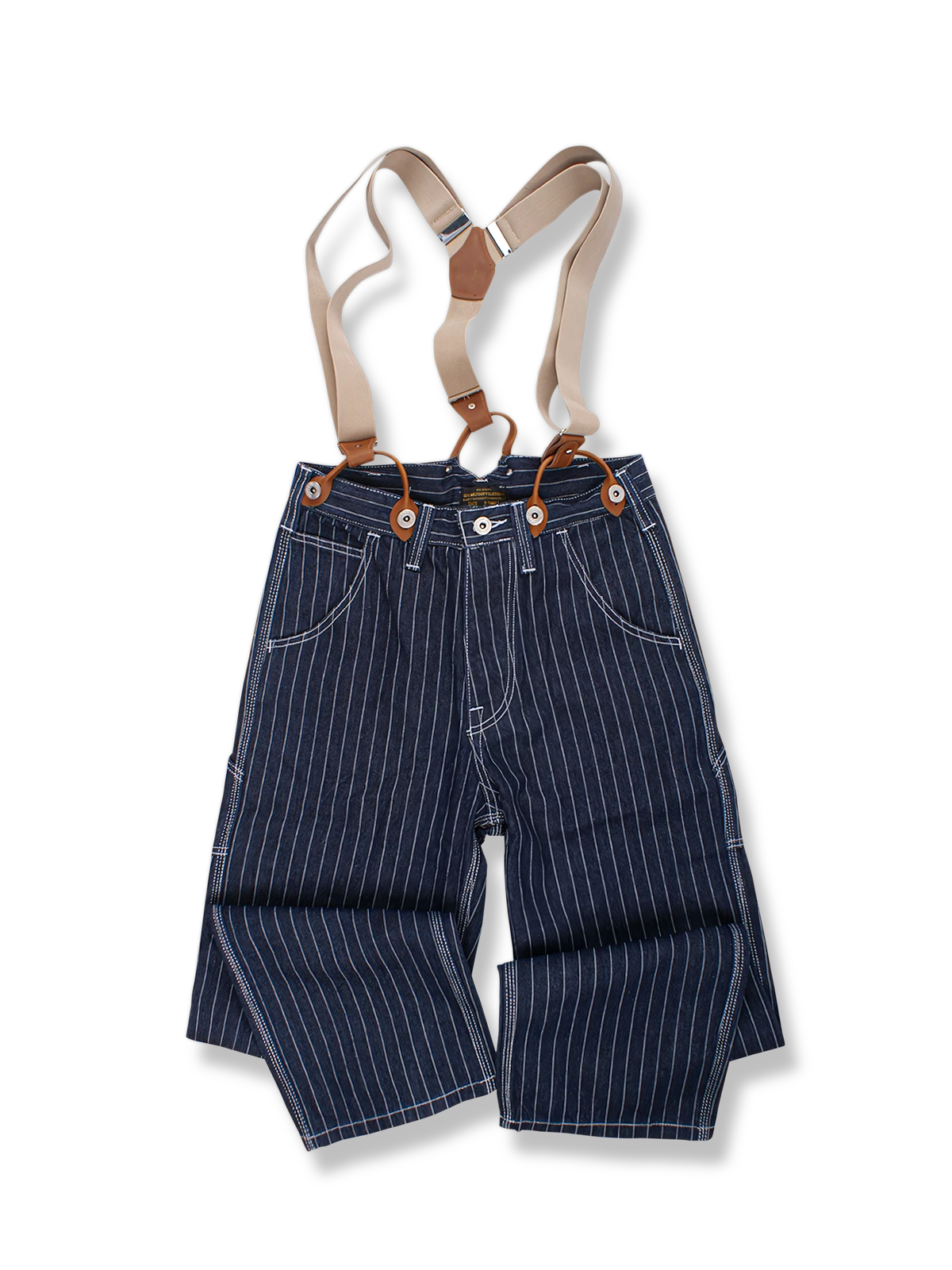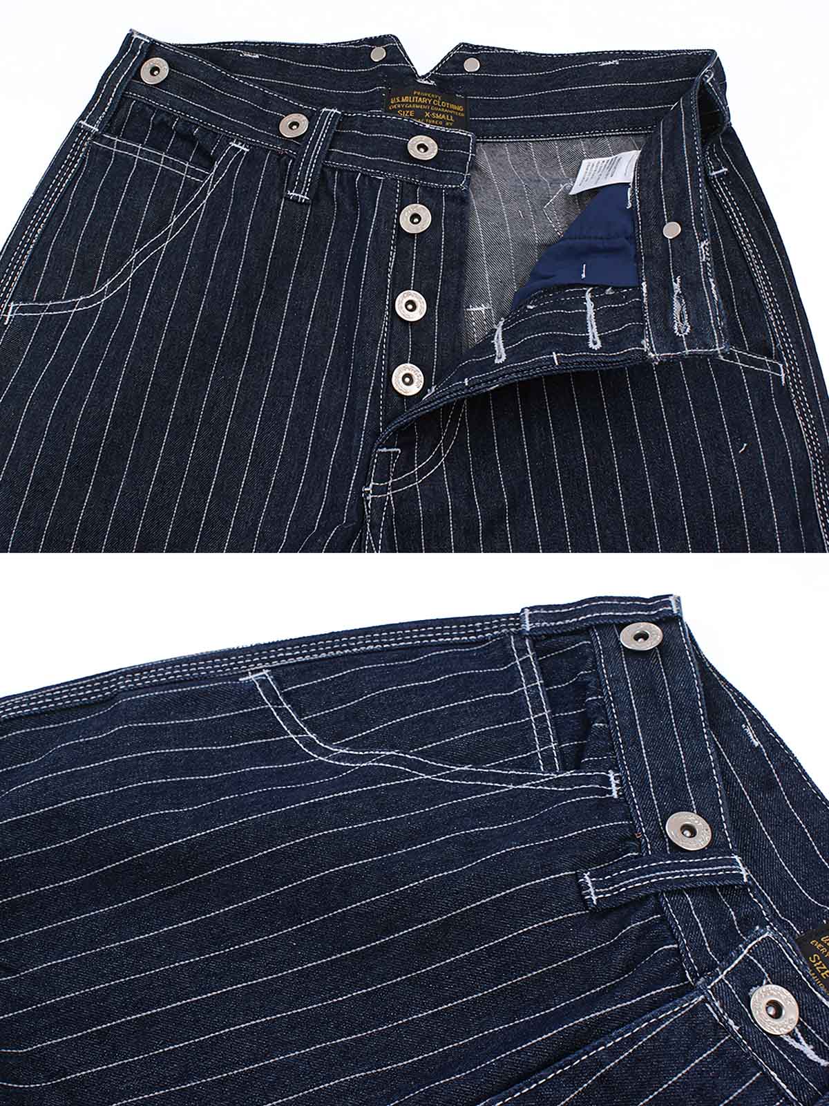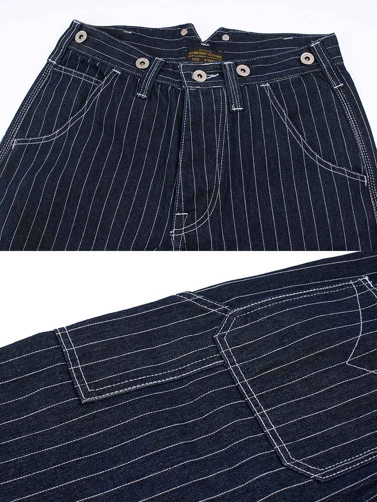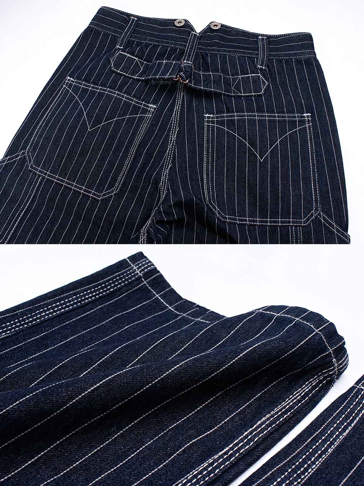 高密度のデニム生地を使用し、耐摩耗性と長寿命を確保しています。ストライプのパターンは視覚的な効果を高め、同時にレトロなスタイルを象徴しています。