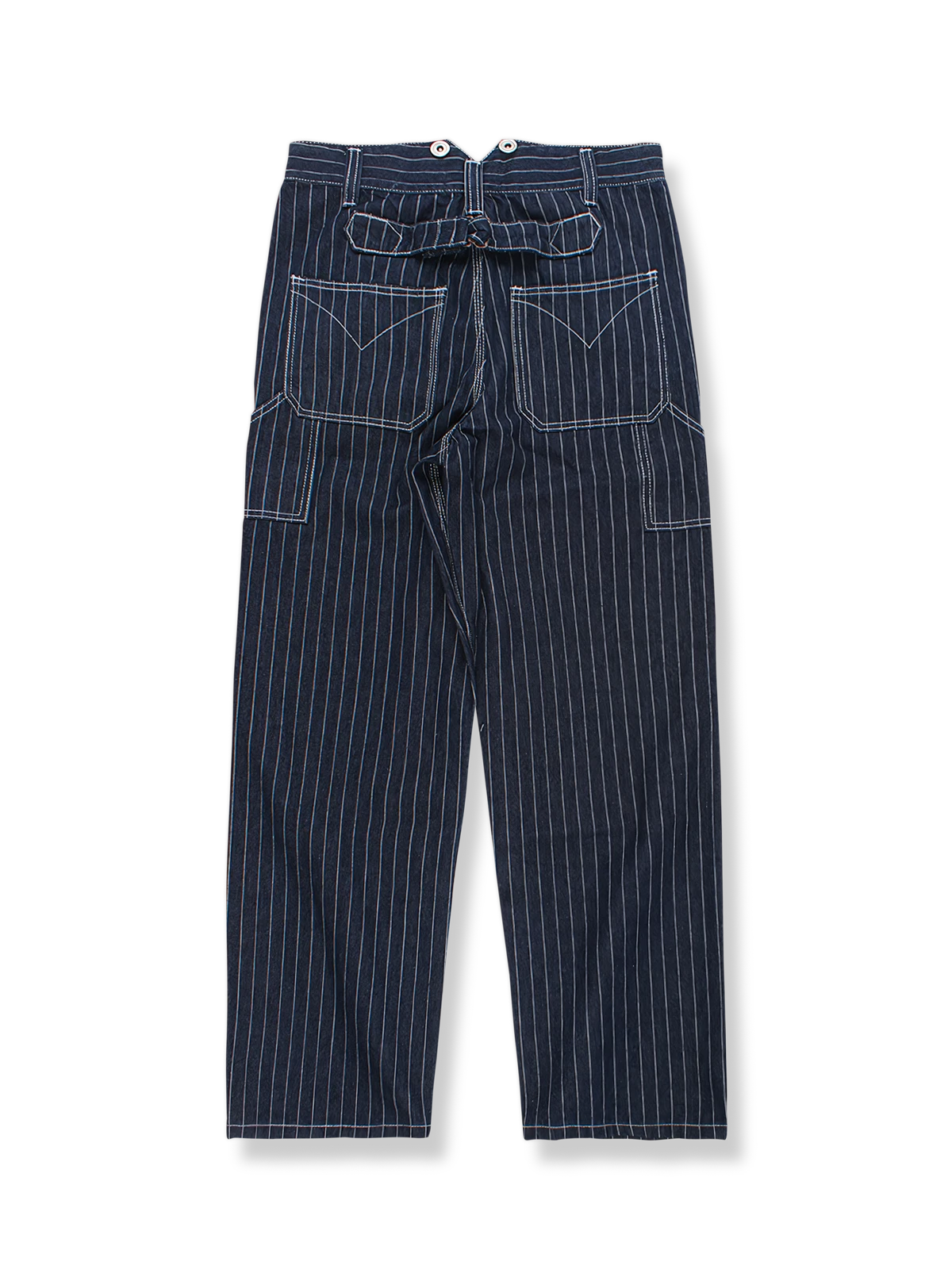 このワイドストライプデニムパンツは、アメカジスタイルのデザインコンセプトを取り入れ、ストライプのパターンとワイドレッグのカットがレトロなワークウェアのスタイルを反映しています。鉄道労働者のズボンやオーバーオールのデザイン要素が、このパンツに現代的に復活し、20世紀初頭のワークウェアの実用性と耐久性を表現しています。