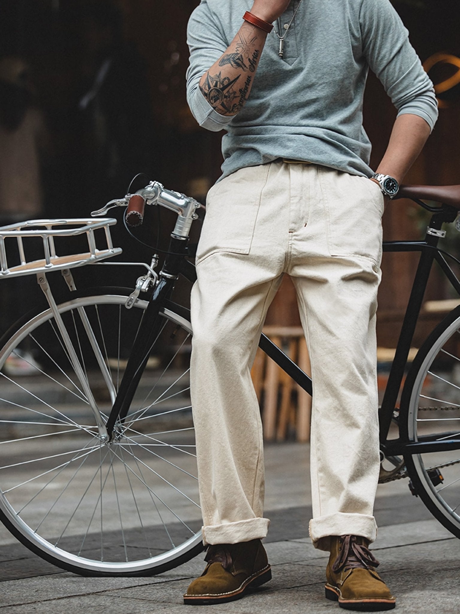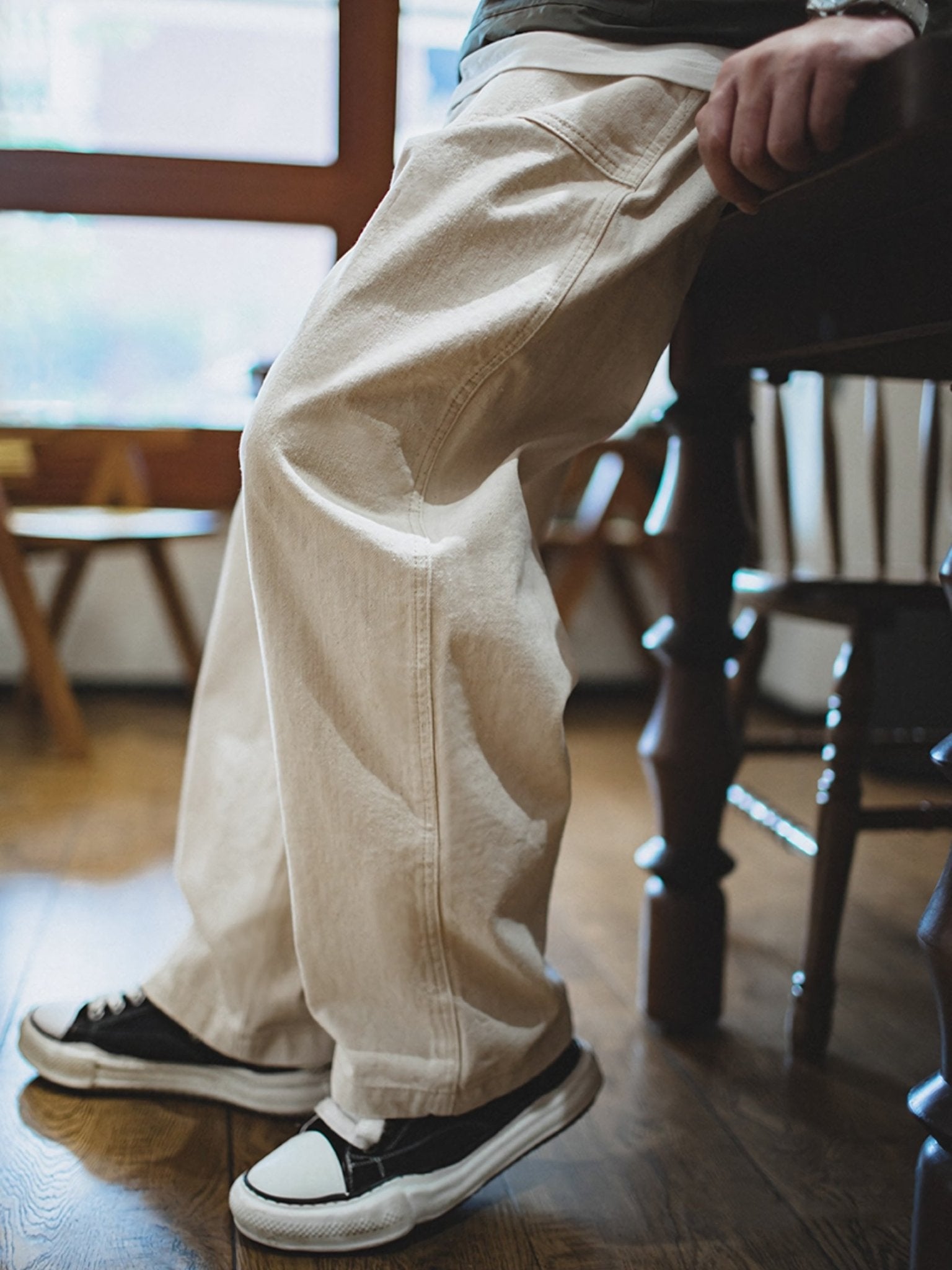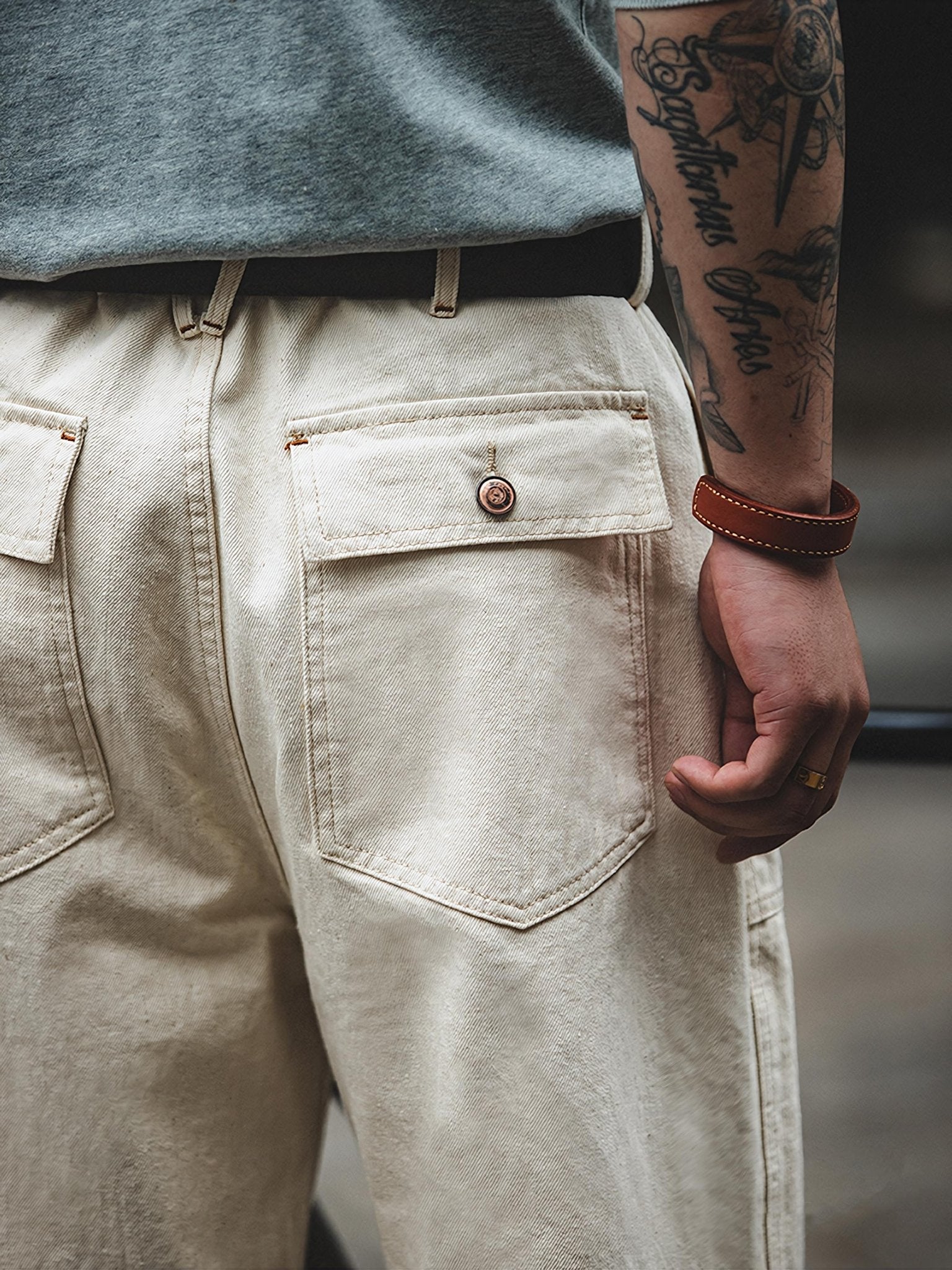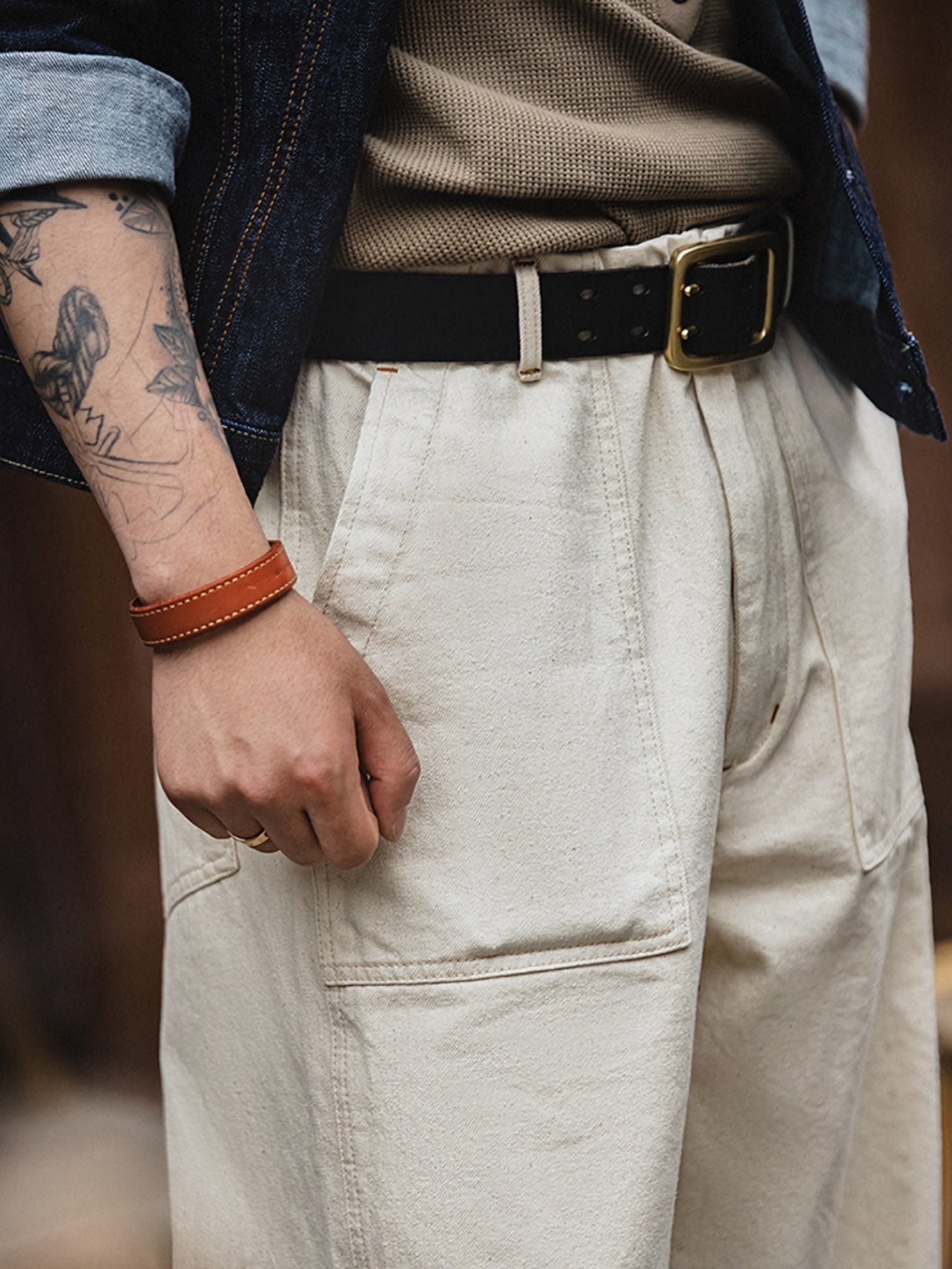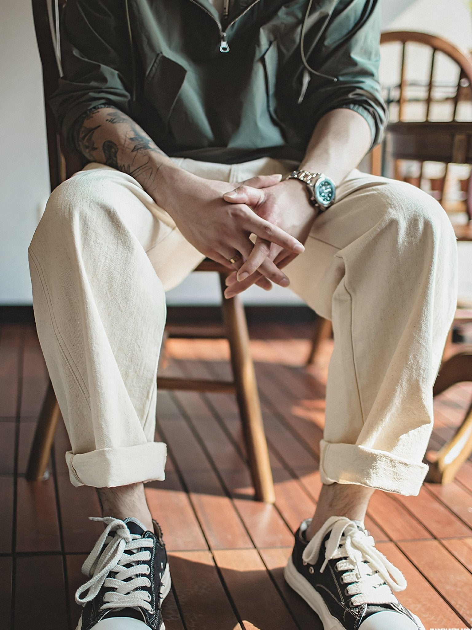 上質なナチュラル綿帆素材が使用され、その特有の質感が際立っています。ナチュラル綿帆素材は、肌に心地よく、ガッシリとした肉感を持っており、コットンの殻や綿実が残っている状態で表現されています。このデニムはオールシーズンで活躍可能で、ワークシャツとも、カジュアルなスニーカーともスムーズに調和し、洗練された大人の着こなしを簡単に完成させます。