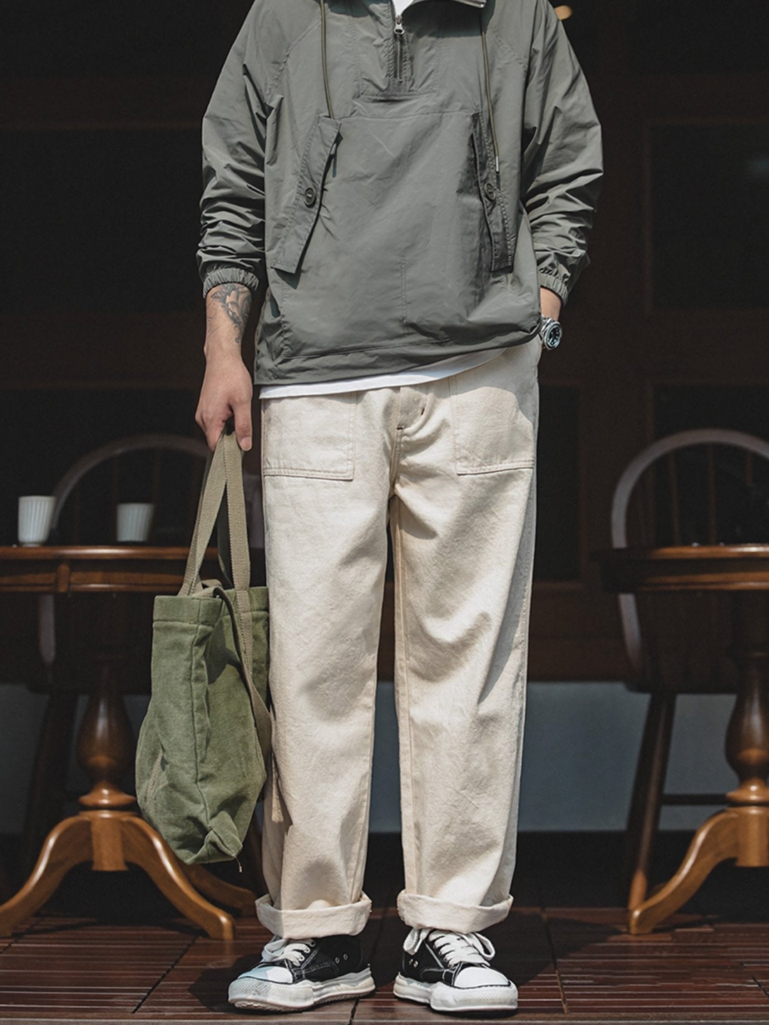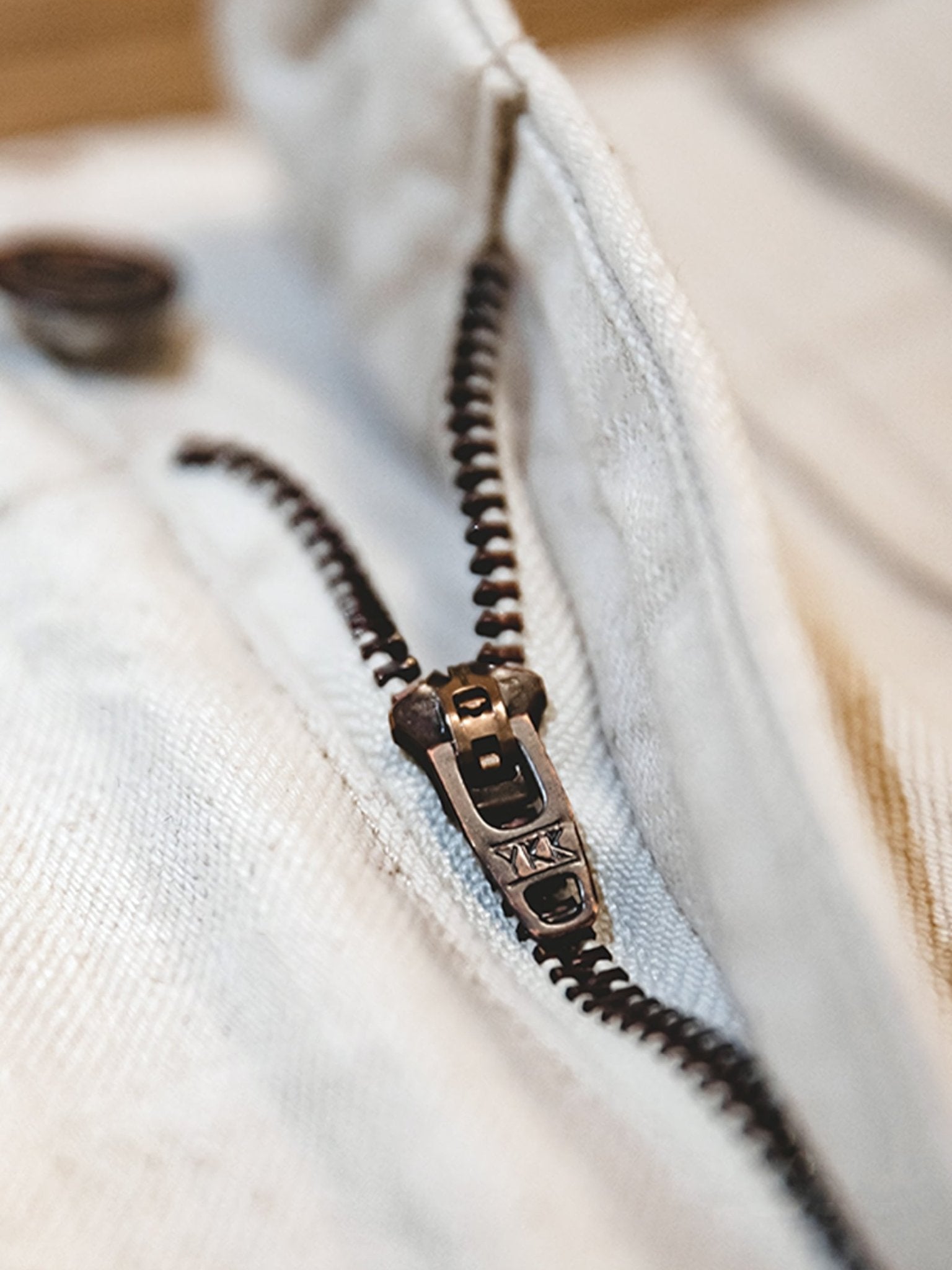 フロントにはビッグポケット2つ、背面にはパッチポケット2つを配し、オーダーメイドしたジッパーとボタンが使用されています。