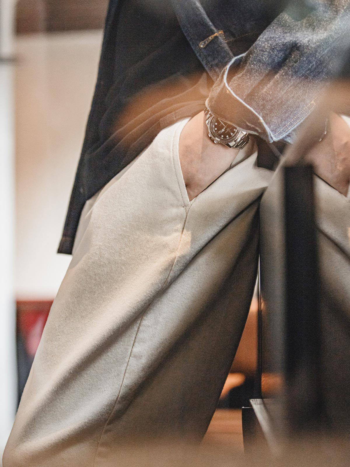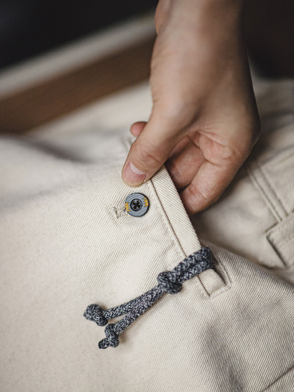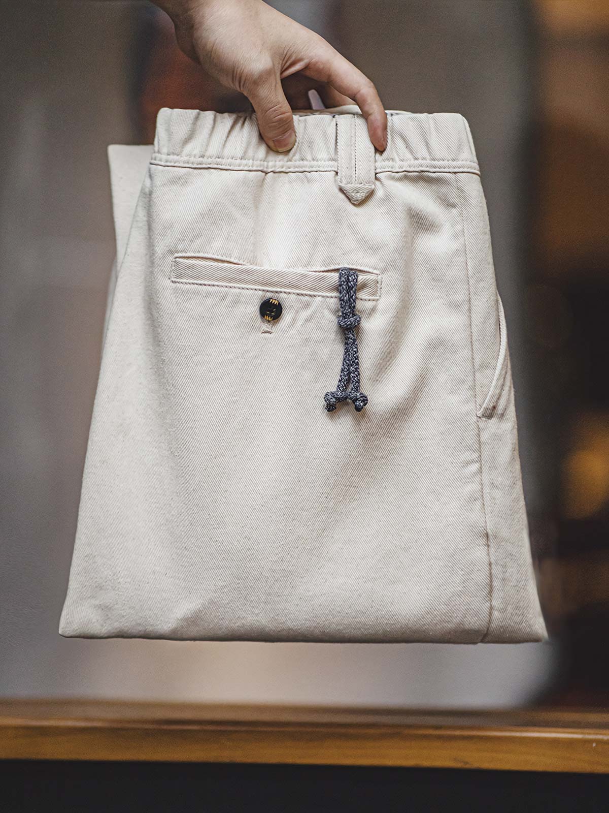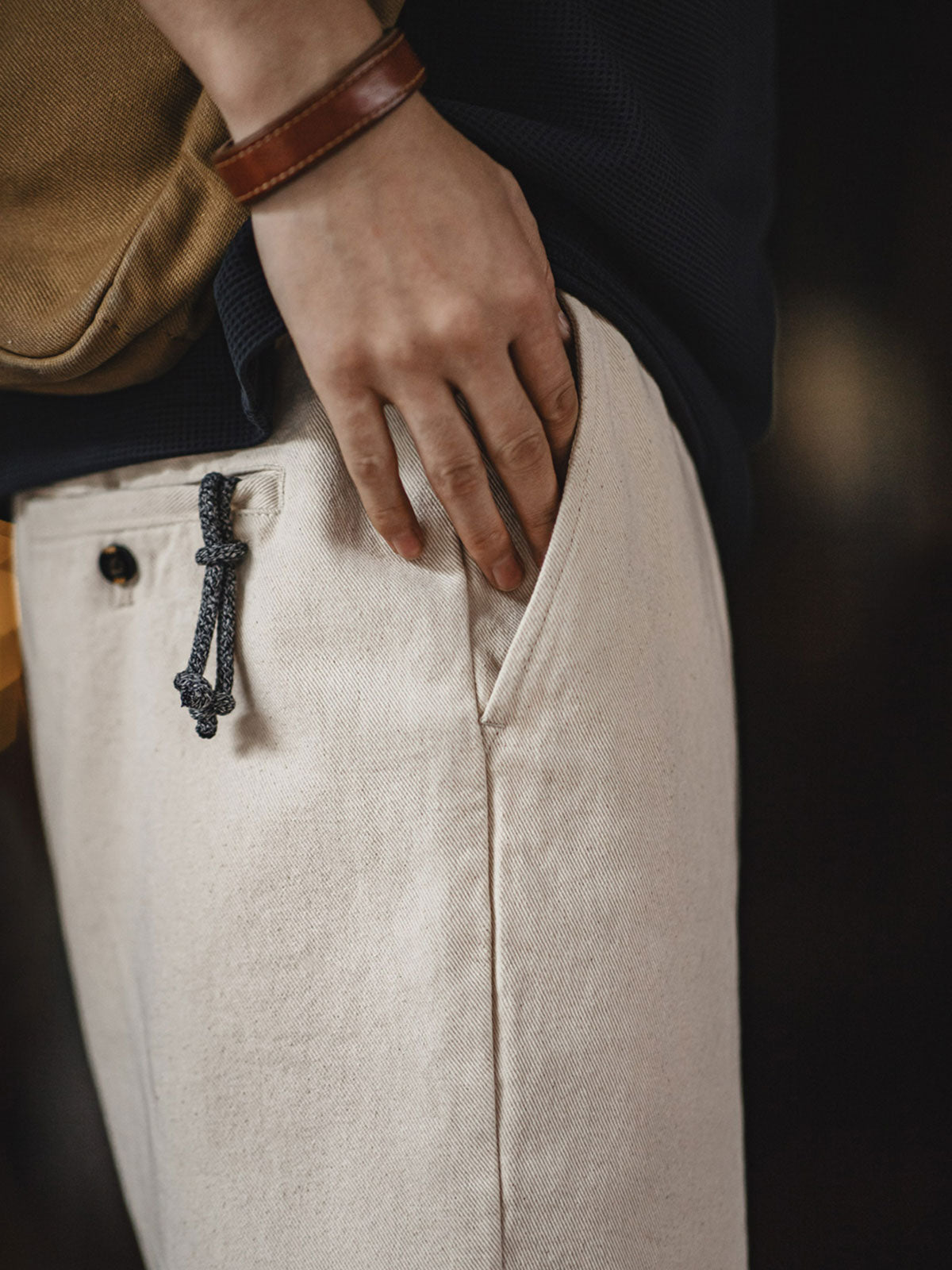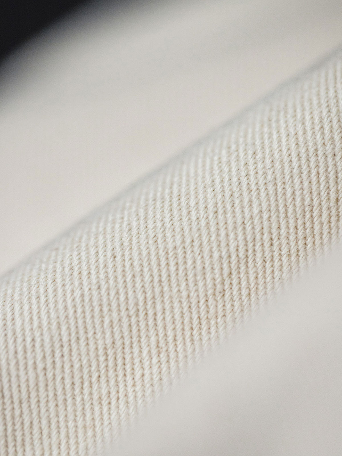 このデニムパンツは、あまり加工や染色されていない自然で素朴な質感を表現しています。原棉の種の殻のディテールを保持し、そのオフホワイトの色合いは、天然綿の原色により近く、原始的で純粋な美学を追求しています。
