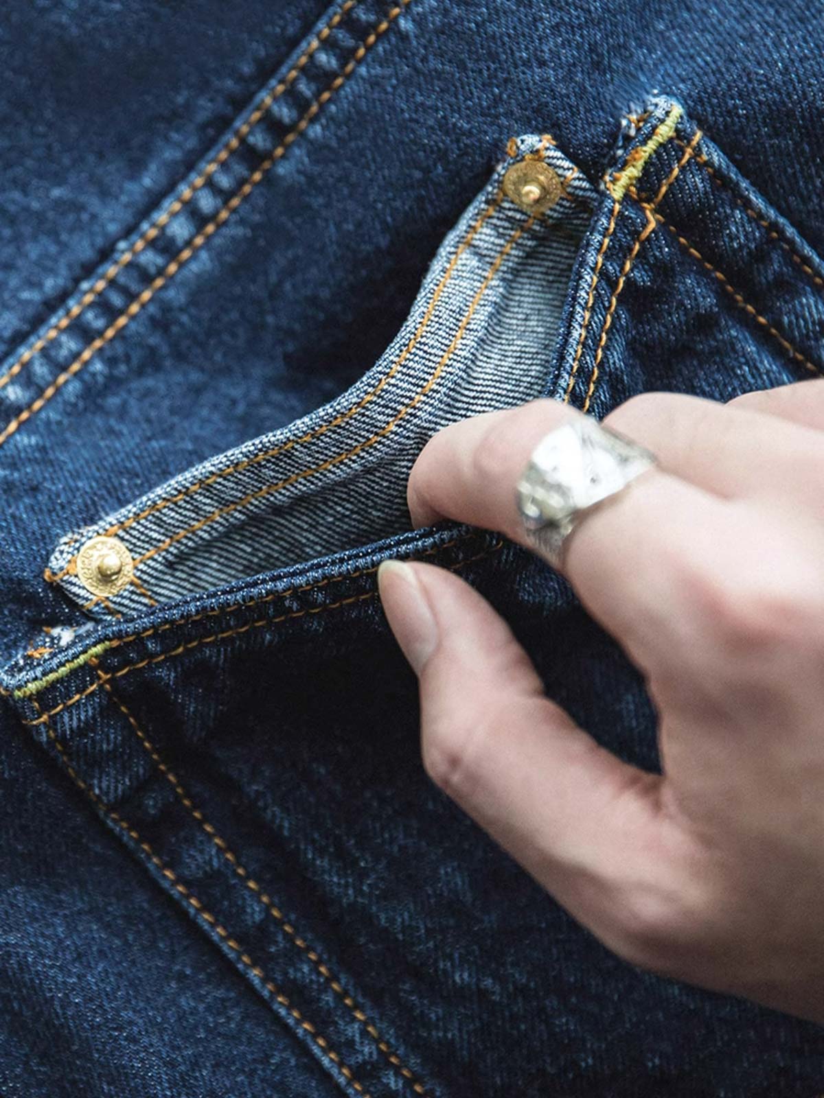 高品質なデニム生地を使用しており、長時間の着用にも耐えうるしっかりとした作りが特徴です。肌触りが良く、洗濯による色褪せにも強いです。また、細かいステッチワークがディテールにこだわりを感じさせます。