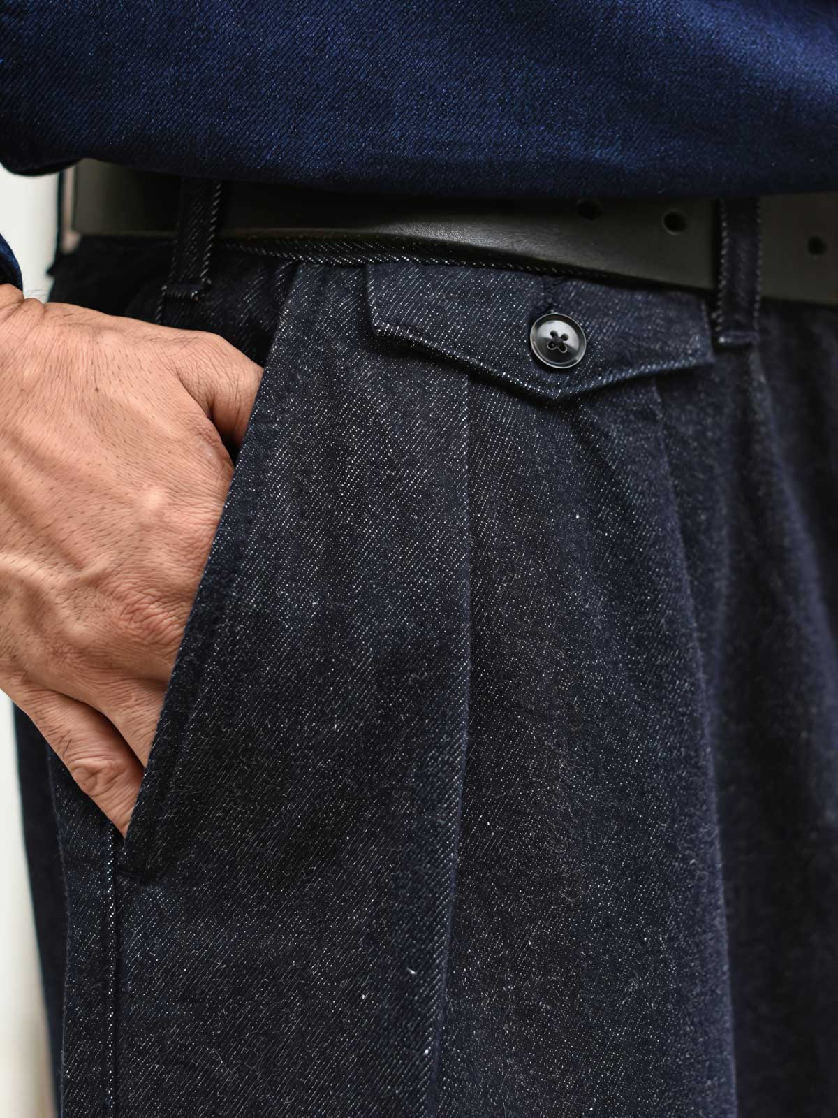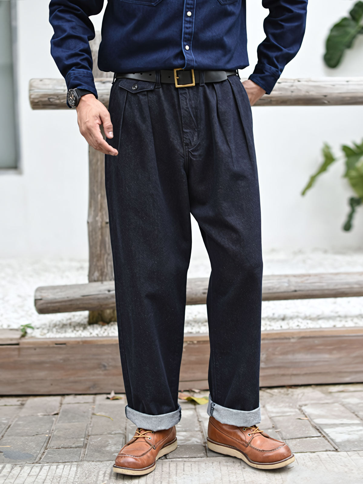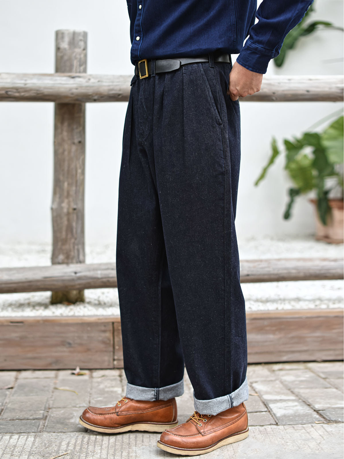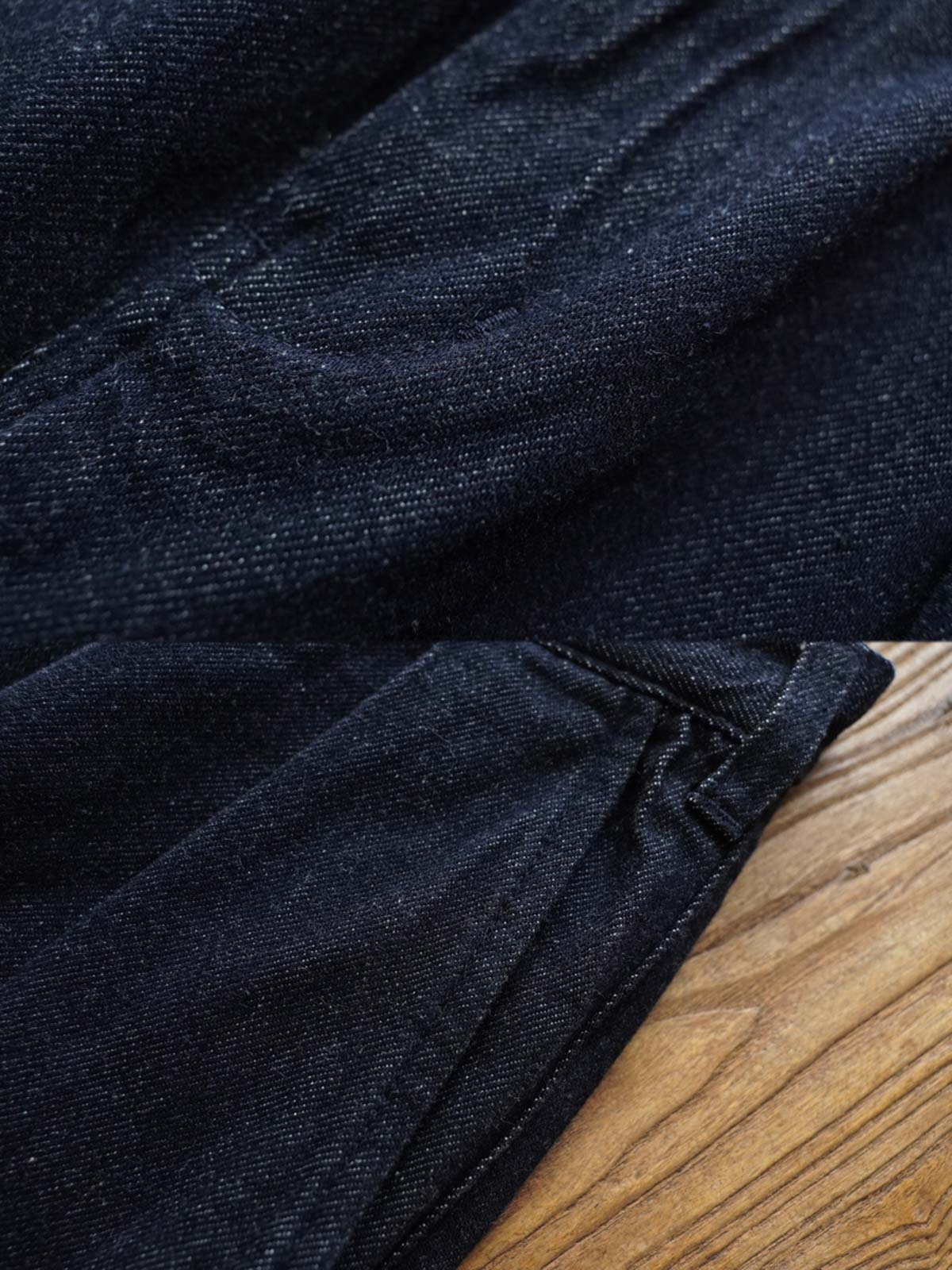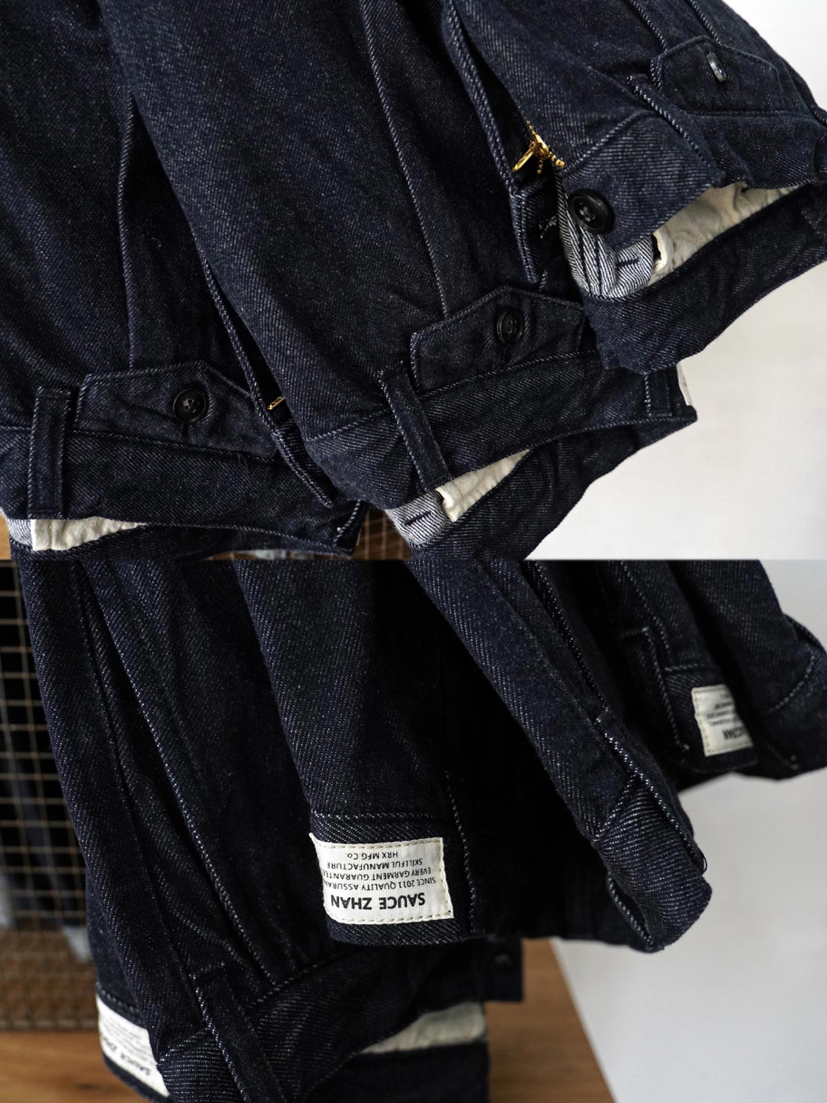 このデニムカジュアルパンツは、自社製の活性染色デニム生地を使用しており、色落ちしにくく、洗濯後すぐに着用できます。特殊な織り方と糸の配置によって、レトロなデニムの風合いが表現されています。厚さは約10.6オンスで、夏の着用に適しています。ハイウエストでゆったりとしたシルエットが特徴で、さまざまな体型にフィットし、快適な着心地を提供します。YKKジッパーと本物の牛角ボタンが付いており、ディテールにもこだわったデザインです。自社工場で生産されており、品質管理が徹底されています。