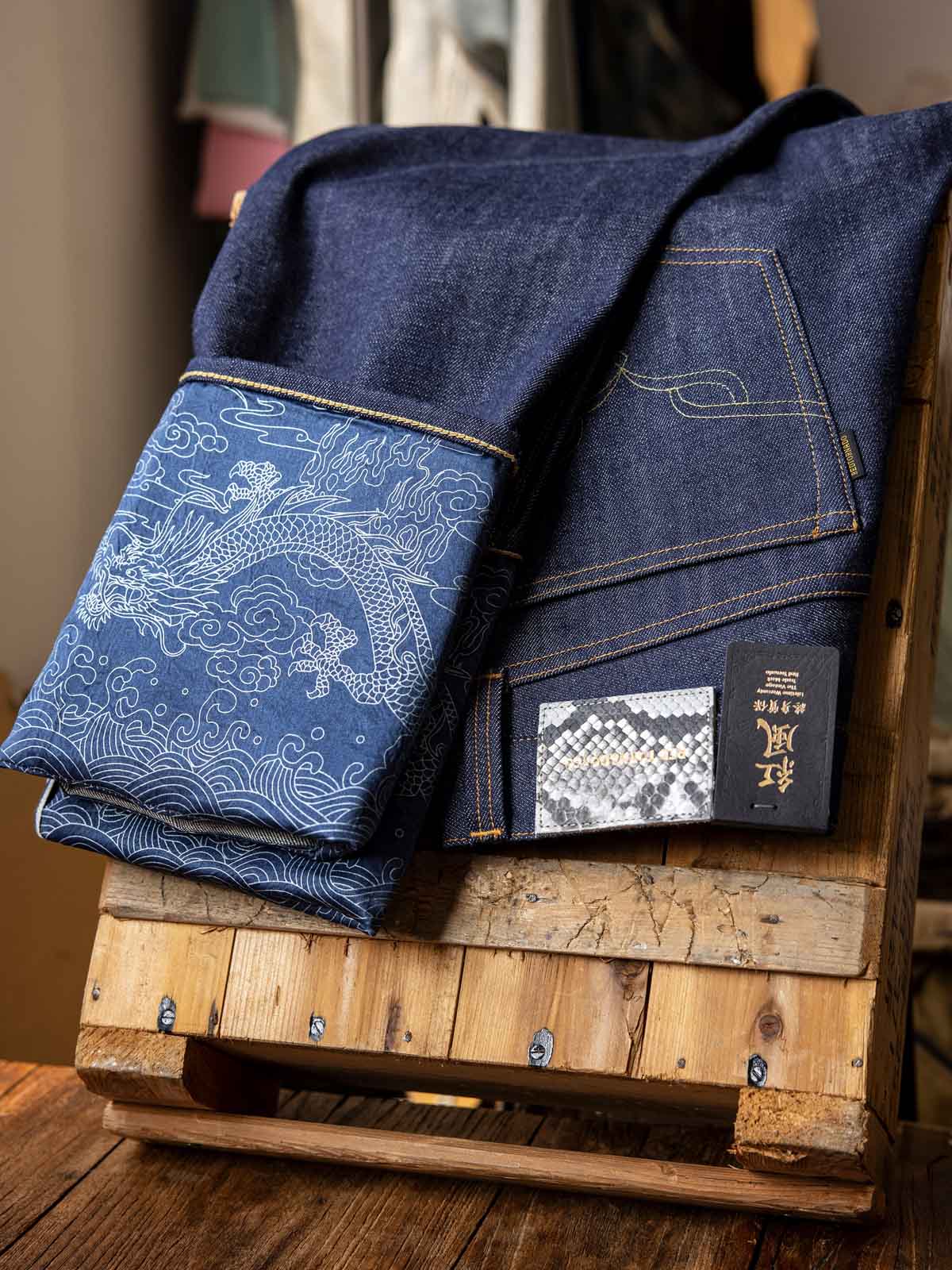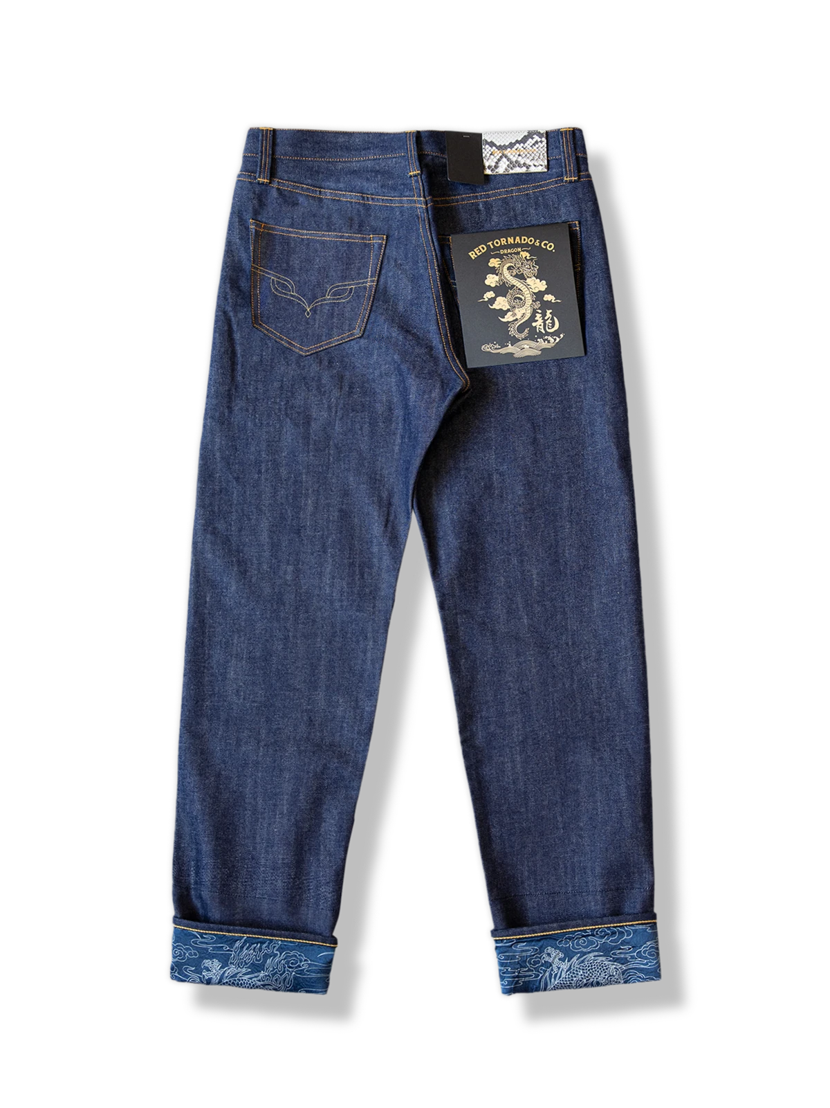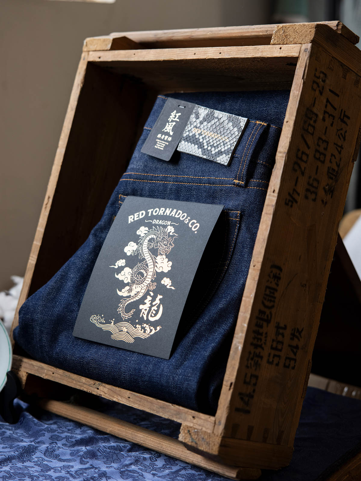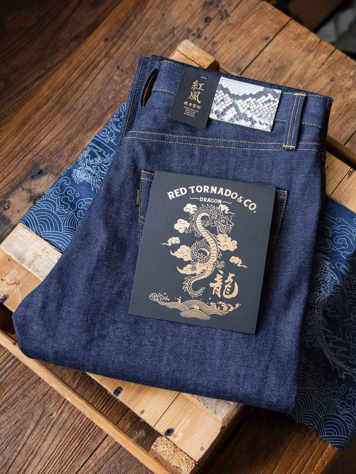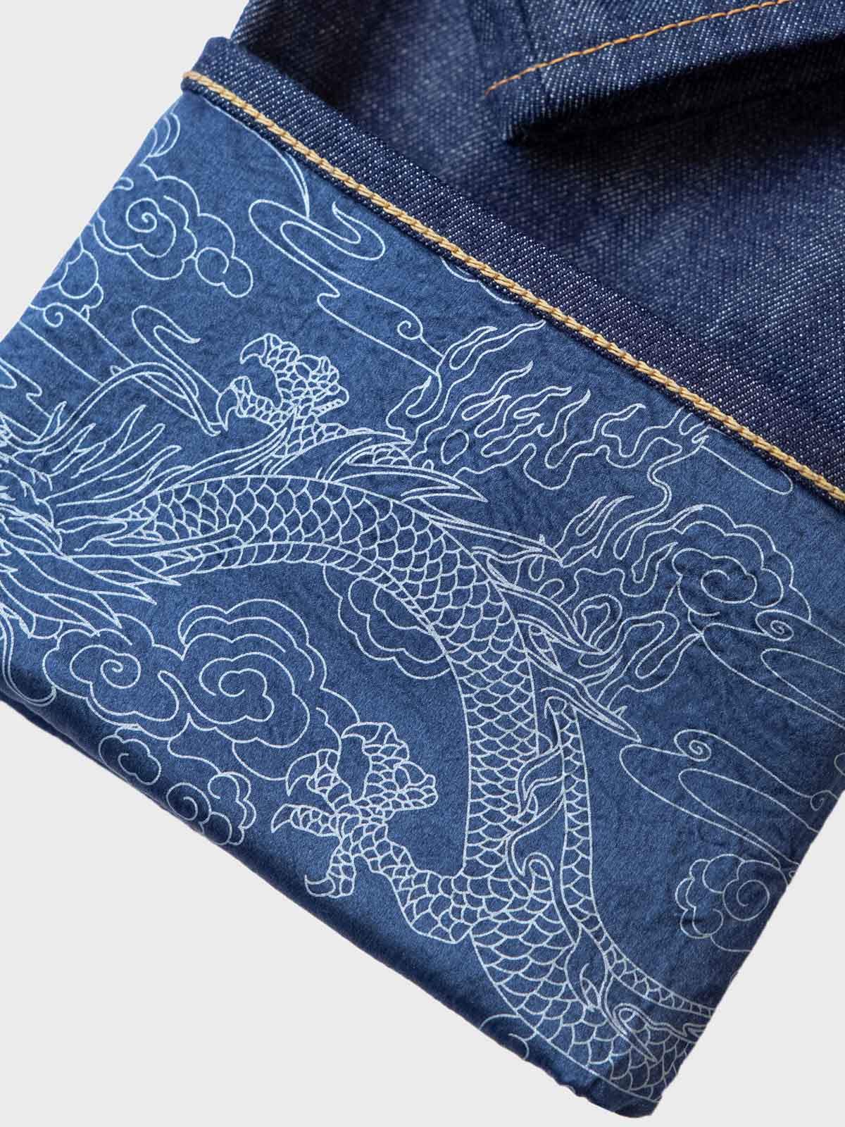 PESSOA独自の14oz板藍根エキスで染めた天然インディゴブルーのデニム生地を使用し、新疆産の高品質長綿から作られています。特別カスタマイズされたパイソン皮のレザーパッチは、天然のパターンと色合いで魅力を増し、バックポケットの鳳凰デザインとインナーポケットの限定吉龍プリントが「龍鳳呈祥」の図案を形成し、着用者に幸福をもたらします。「海水雲龍文」のパッチが裾の内側にあしらわれており、ロールアップすると雲の中で波打つ2匹の龍の壮大な光景が現れます。