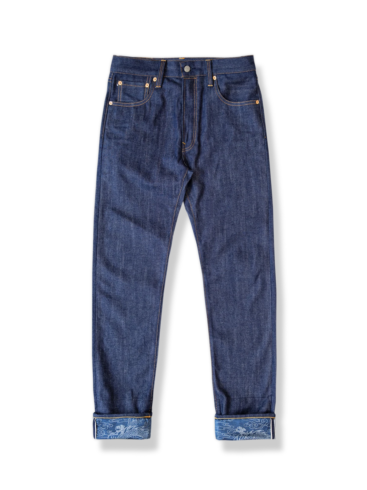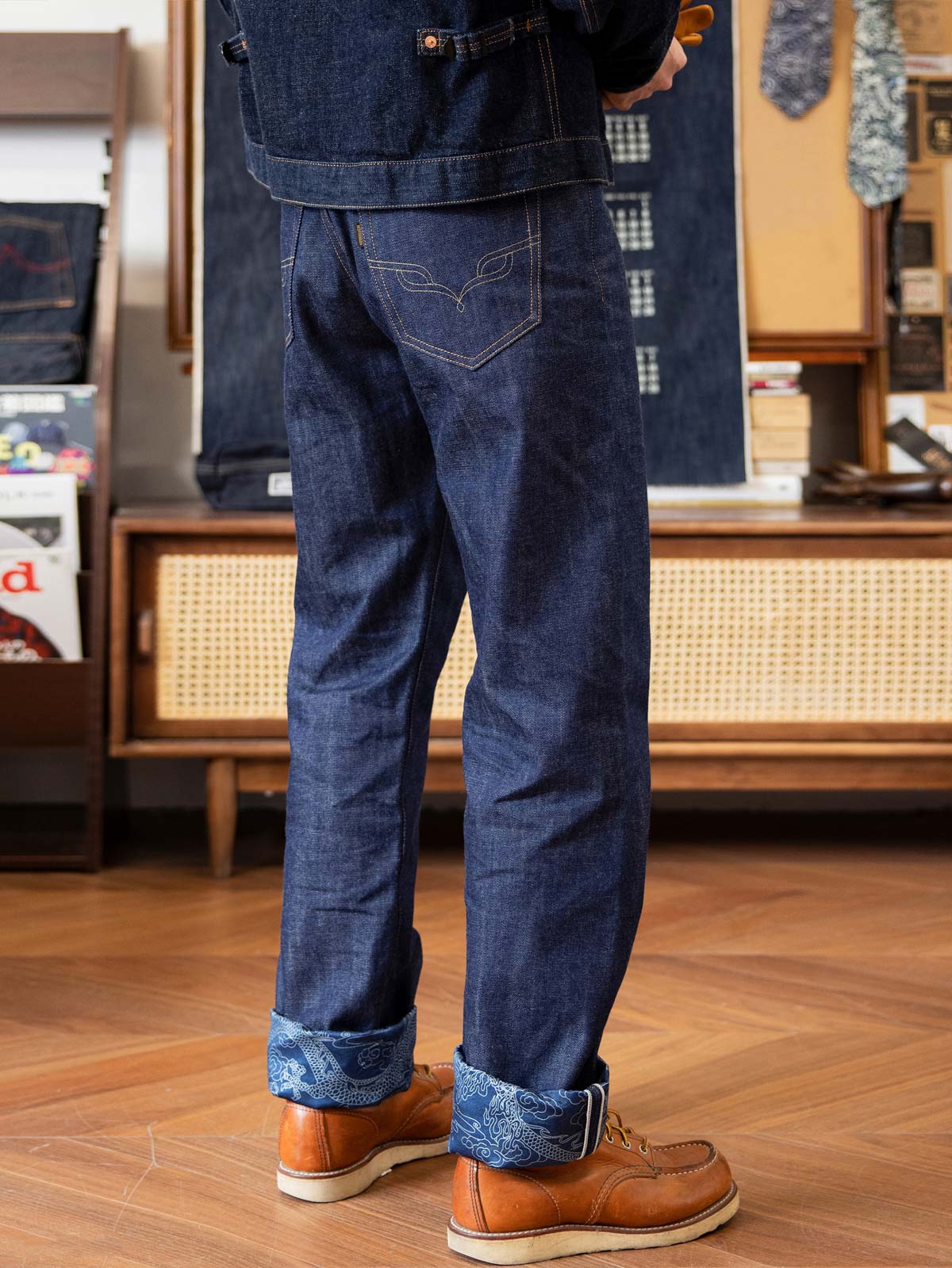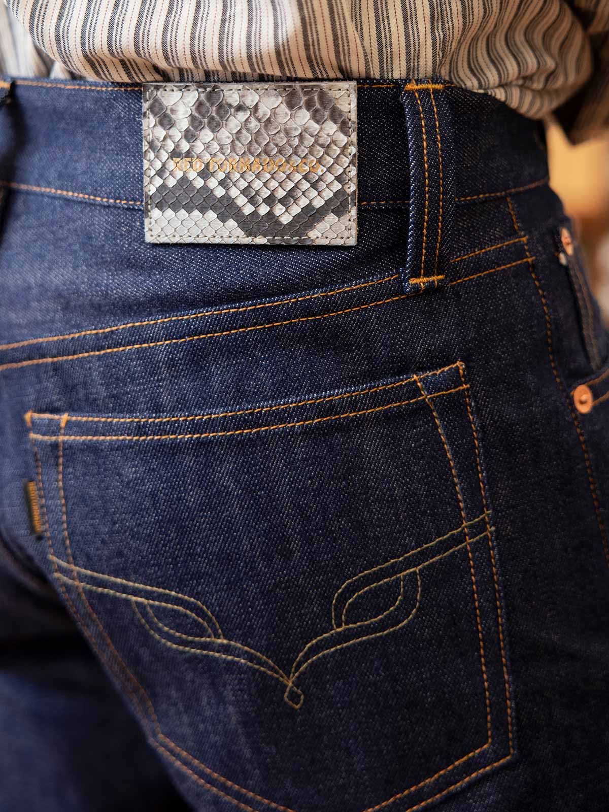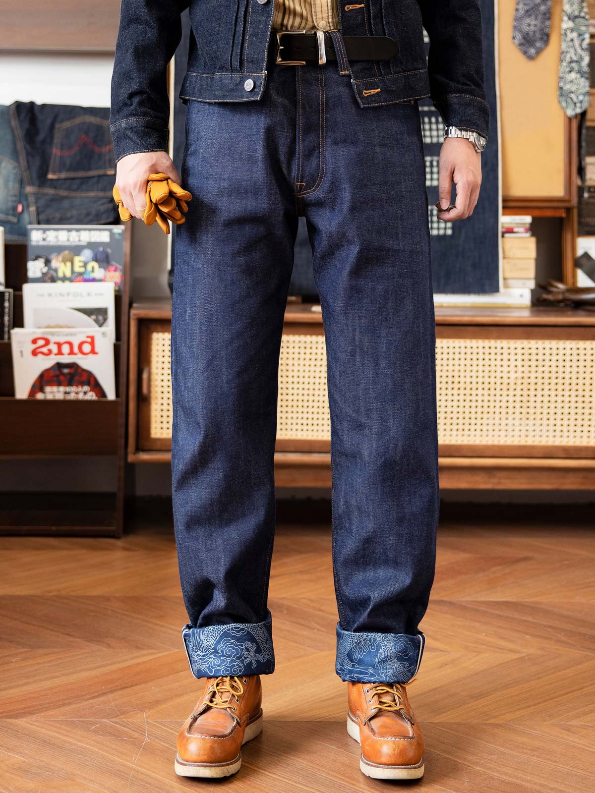 PESSOA独自の14oz板藍根エキスで染めた天然インディゴブルーのデニム生地を使用し、新疆産の高品質長綿から作られています。特別カスタマイズされたパイソン皮のレザーパッチは、天然のパターンと色合いで魅力を増し、バックポケットの鳳凰デザインとインナーポケットの限定吉龍プリントが「龍鳳呈祥」の図案を形成し、着用者に幸福をもたらします。「海水雲龍文」のパッチが裾の内側にあしらわれており、ロールアップすると雲の中で波打つ2匹の龍の壮大な光景が現れます。