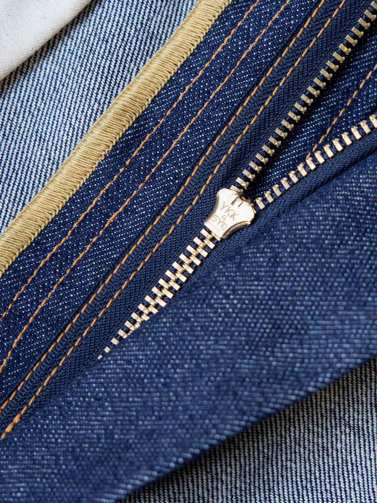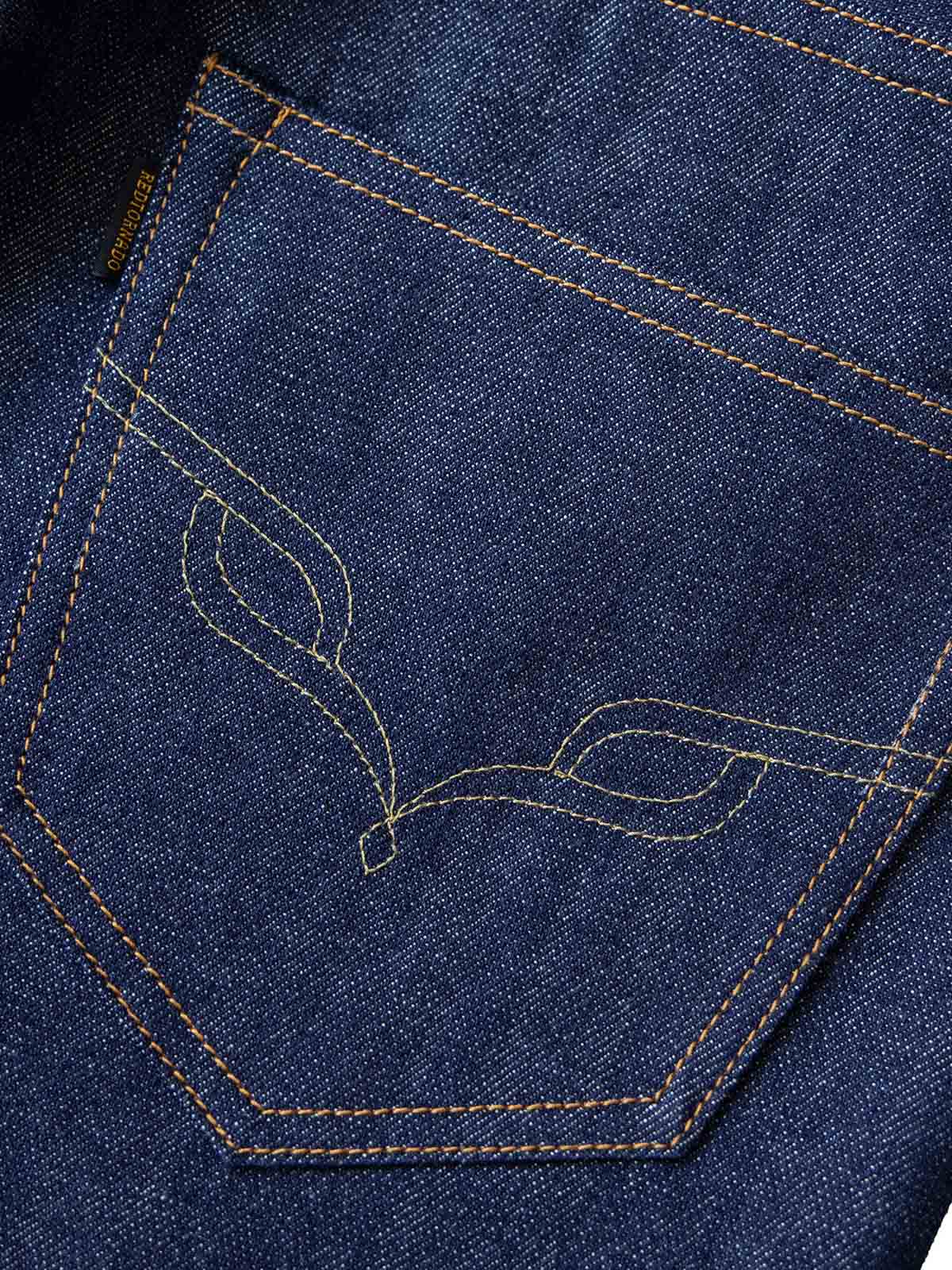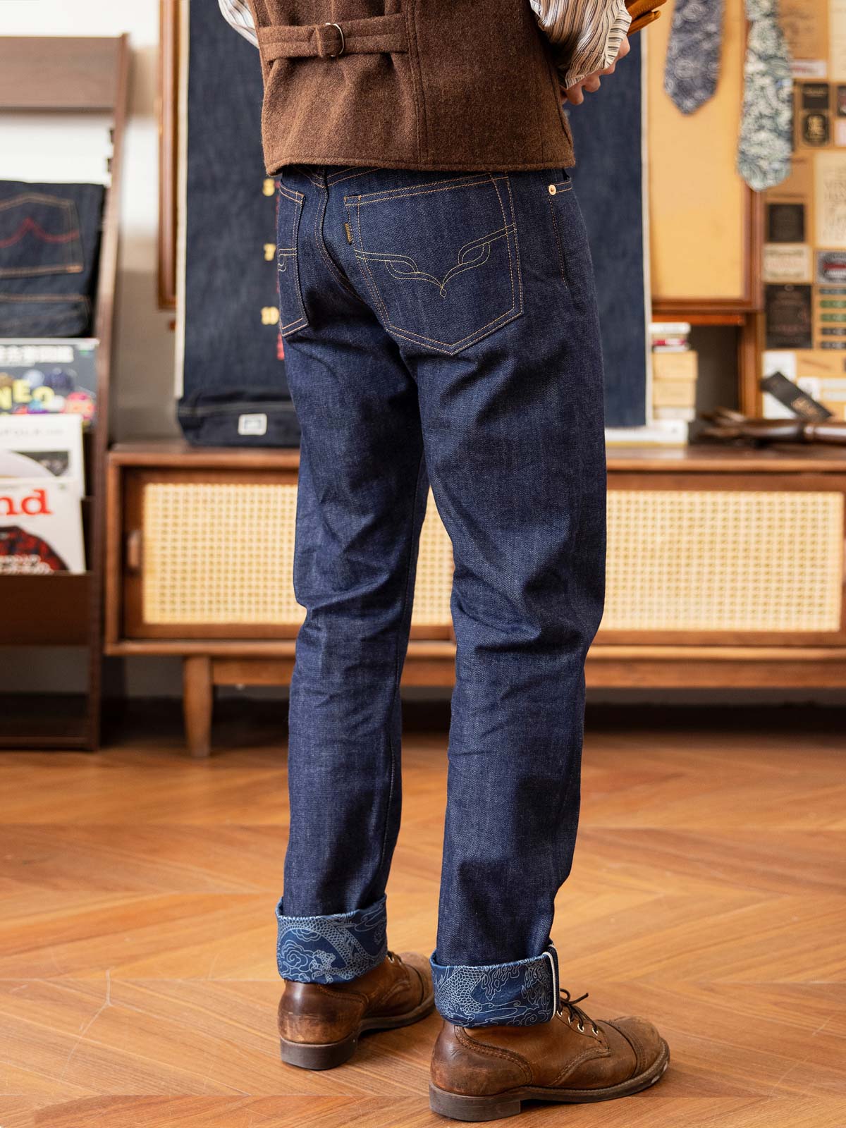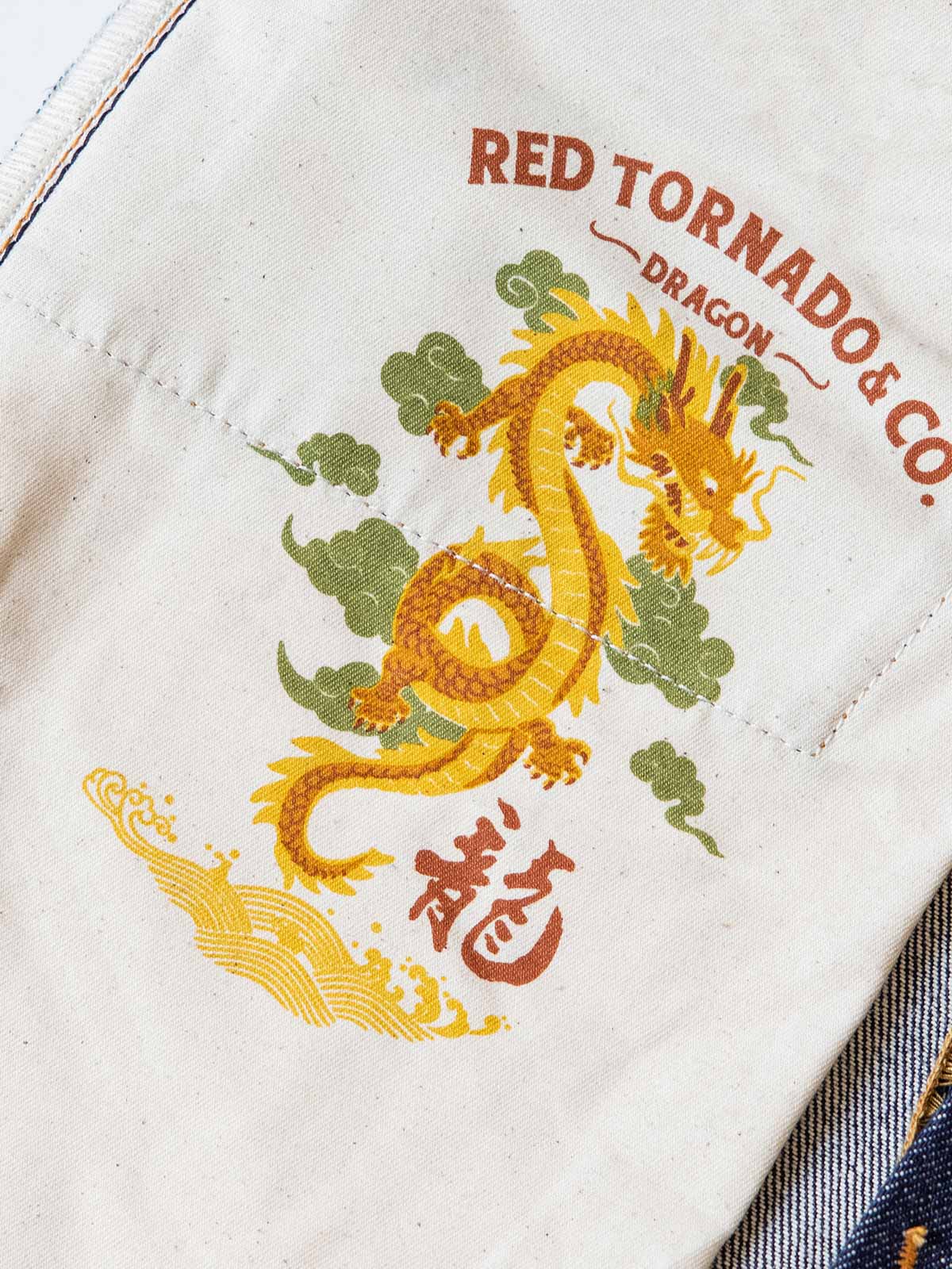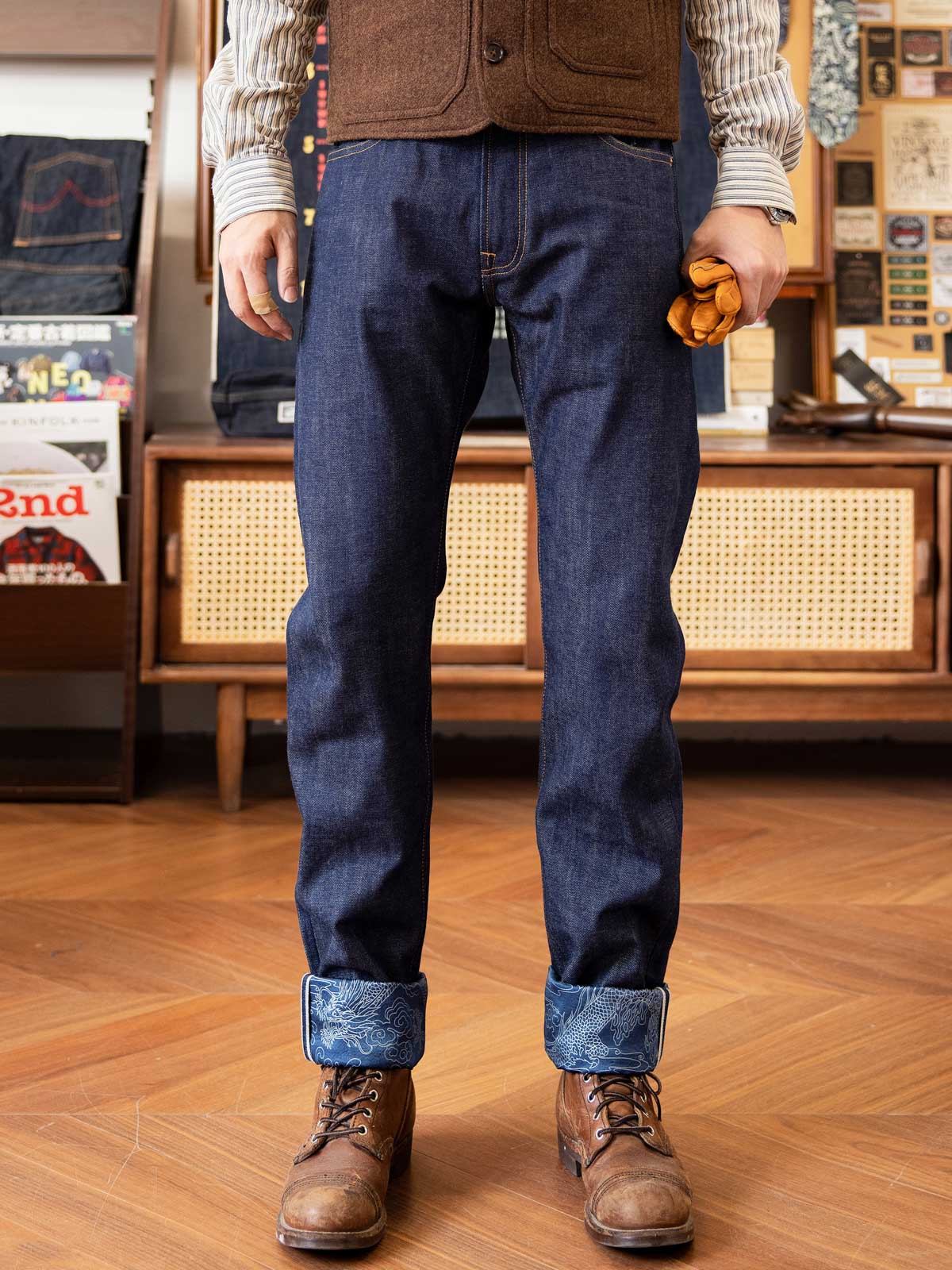 PESSOA独自の14oz板藍根エキスで染めた天然インディゴブルーのデニム生地を使用し、新疆産の高品質長綿から作られています。特別カスタマイズされたパイソン皮のレザーパッチは、天然のパターンと色合いで魅力を増し、バックポケットの鳳凰デザインとインナーポケットの限定吉龍プリントが「龍鳳呈祥」の図案を形成し、着用者に幸福をもたらします。「海水雲龍文」のパッチが裾の内側にあしらわれており、ロールアップすると雲の中で波打つ2匹の龍の壮大な光景が現れます。