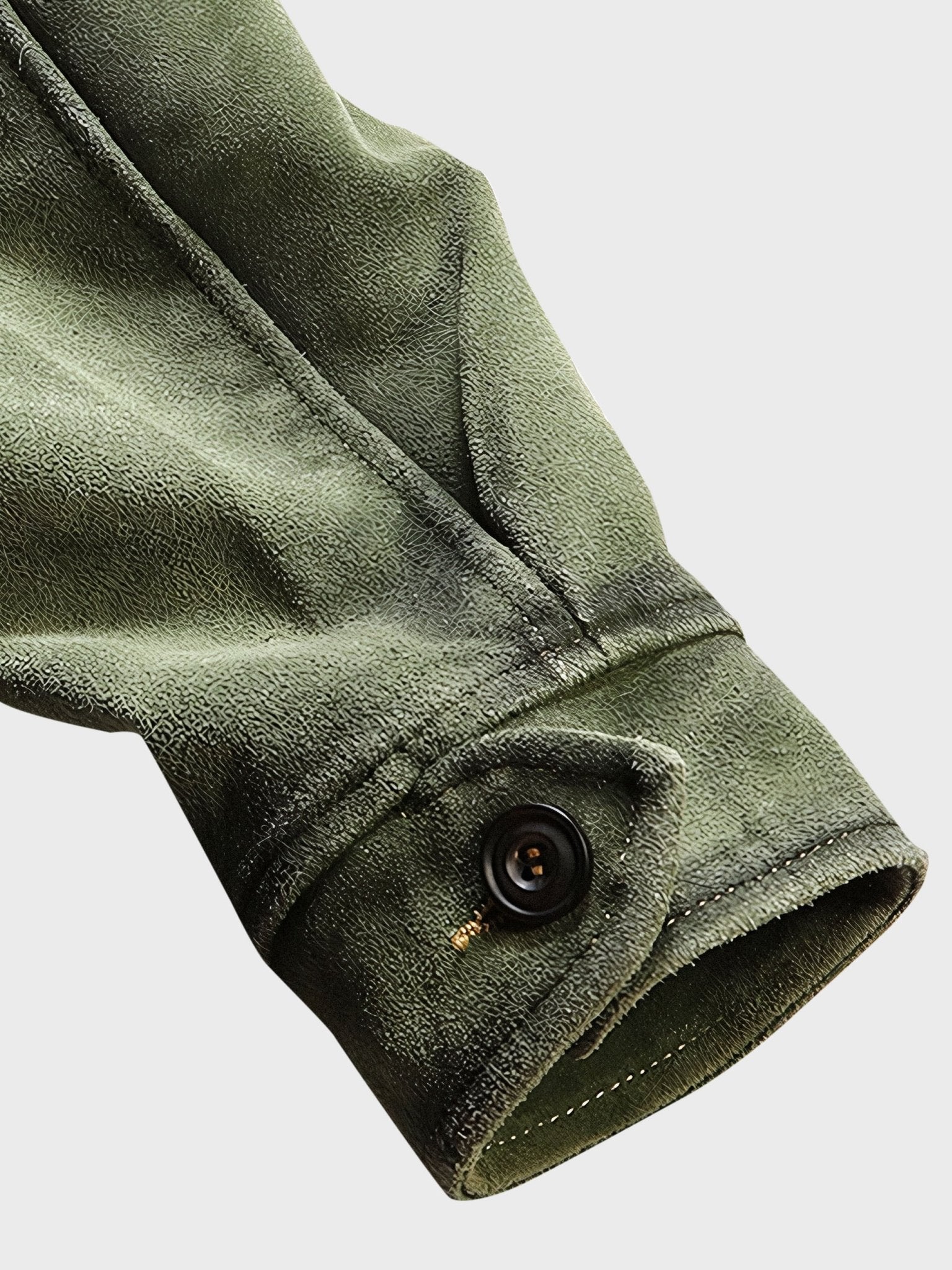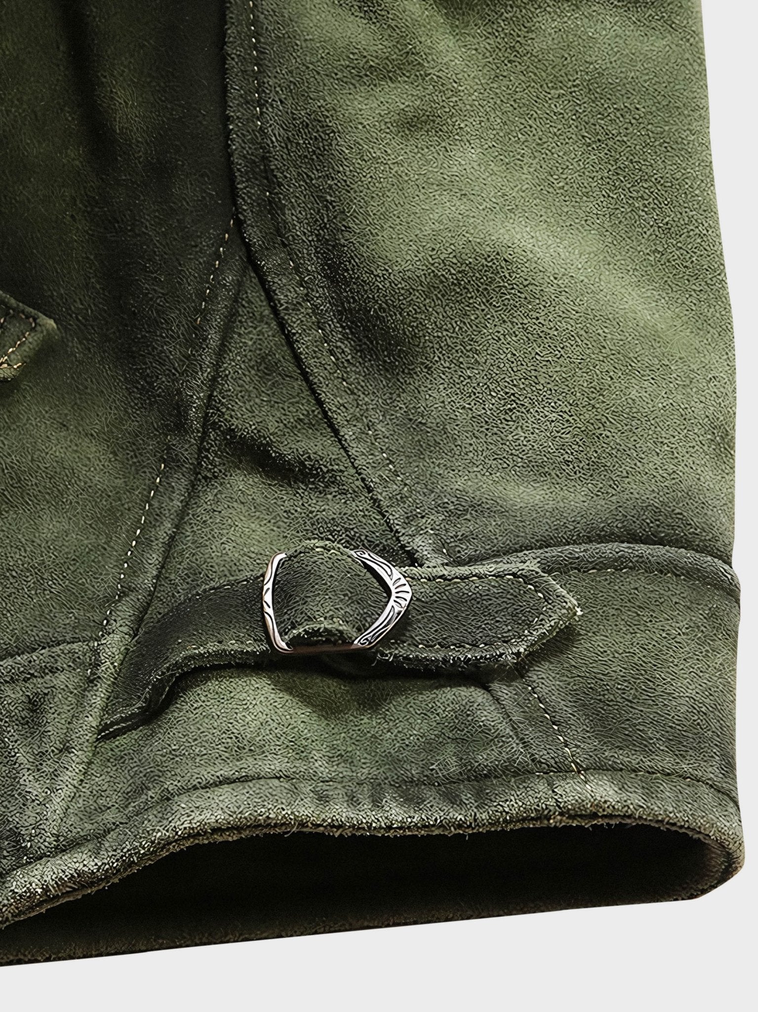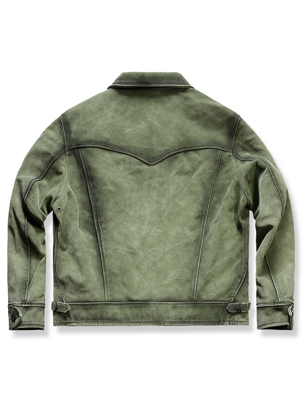 このジャケットは、重いウォッシュ加工が施された手作業でオイル染めされたスエードレザーを使用しており、ユニークなレトロスタイルを持っています。このレザーのオイル染め加工により、深い緑色が表れ、ジャケットに特別な魅力を与えています。