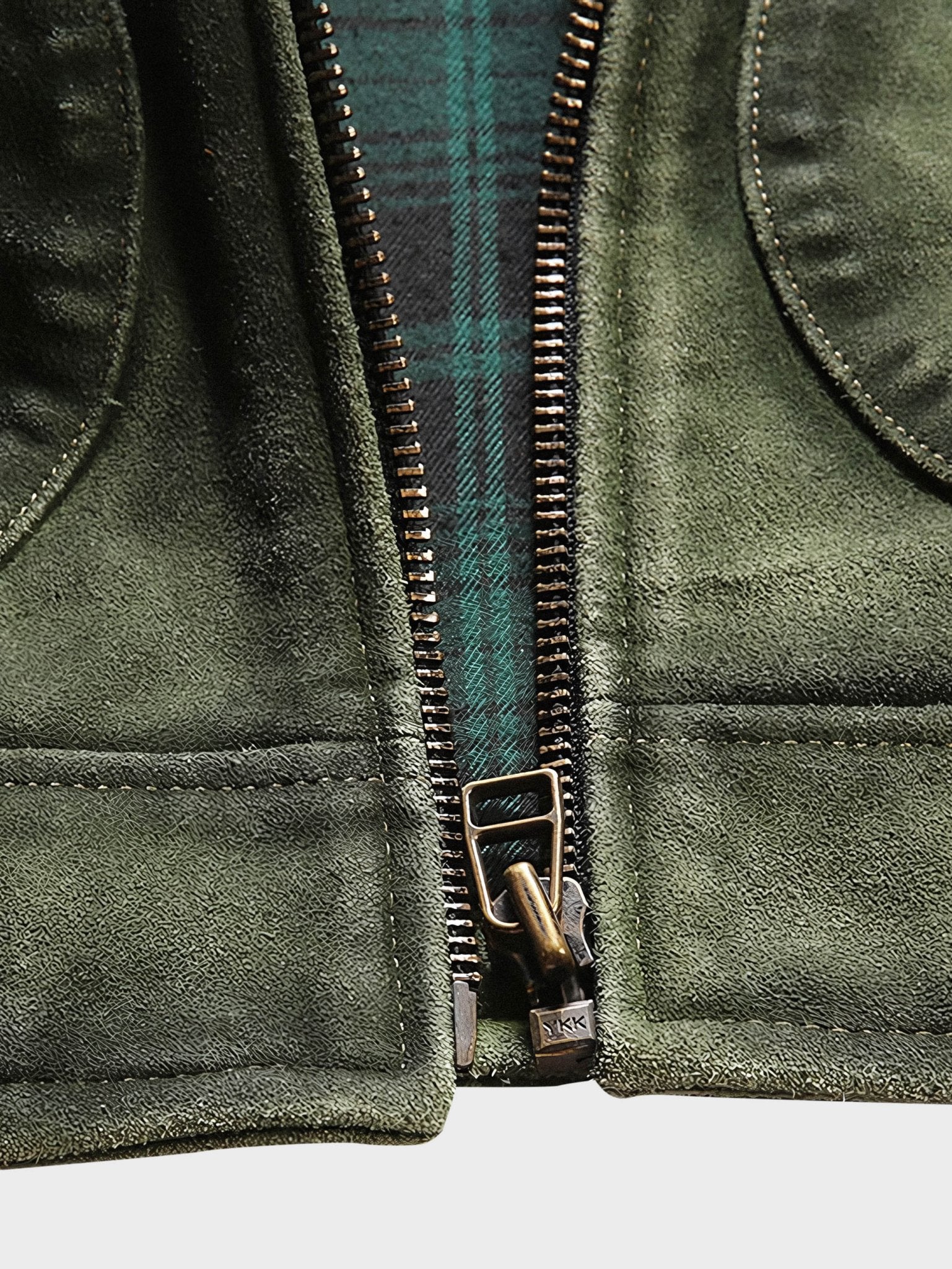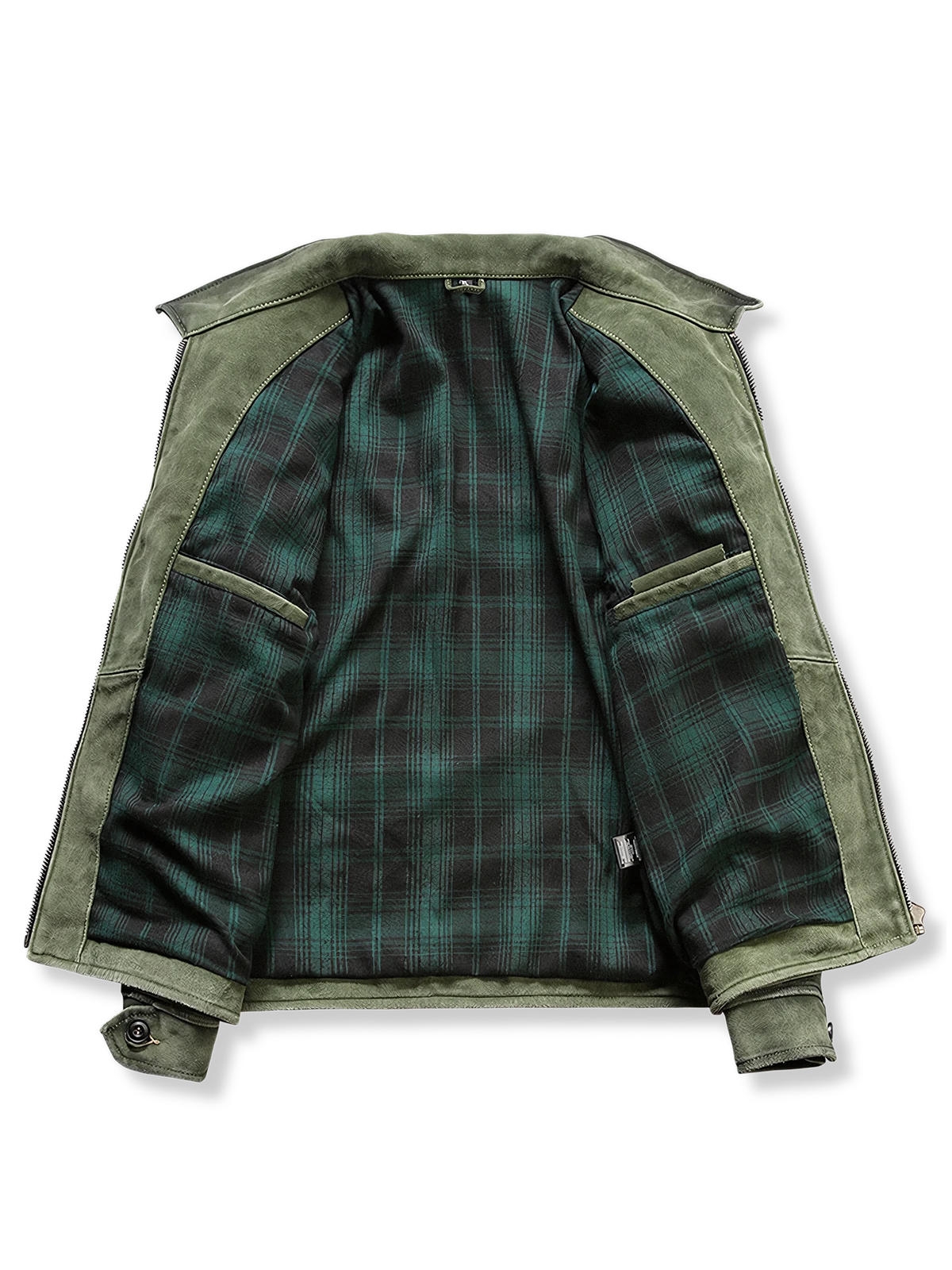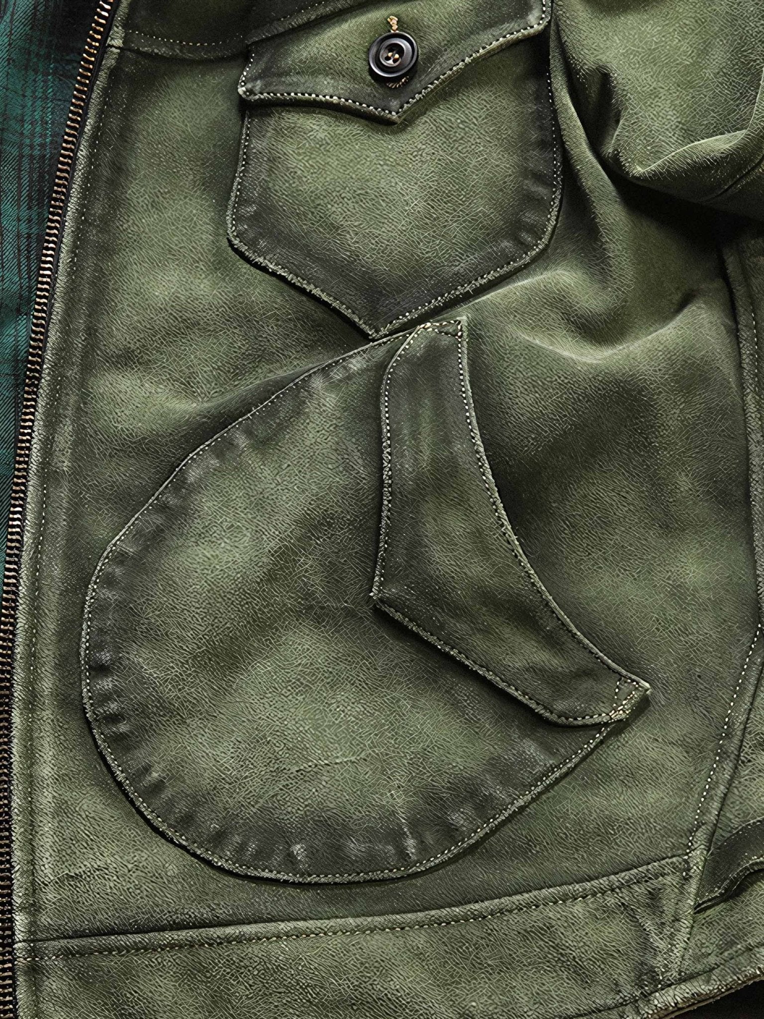ジャケットの主要な素材はスエードレザーで、通常、非常に柔らかく快適です。裏地には緑色のポリエステル製グリッド生地が使用されており、耐久性に優れた通気性のある素材で、ジャケットの耐久性を向上させています。
