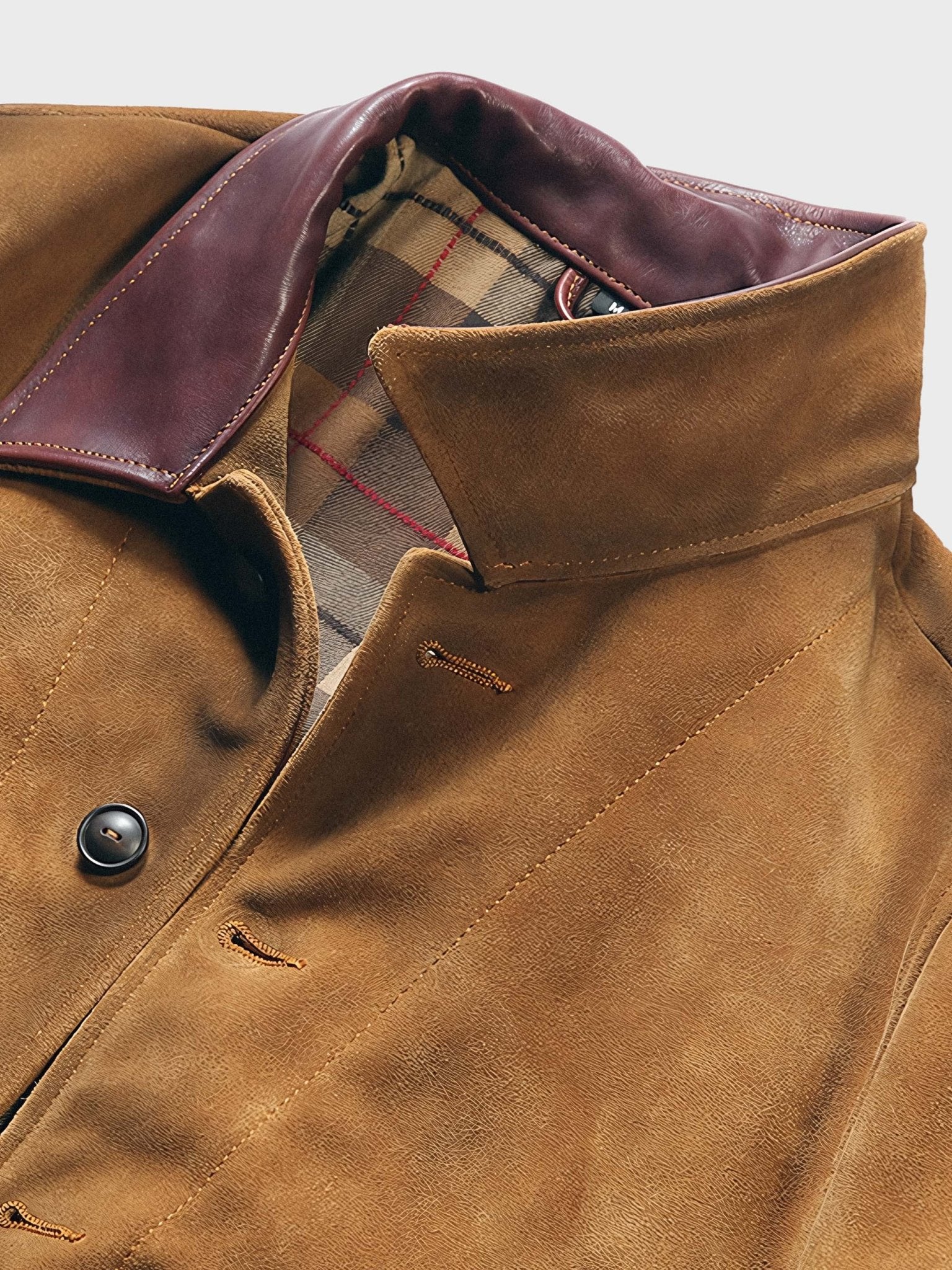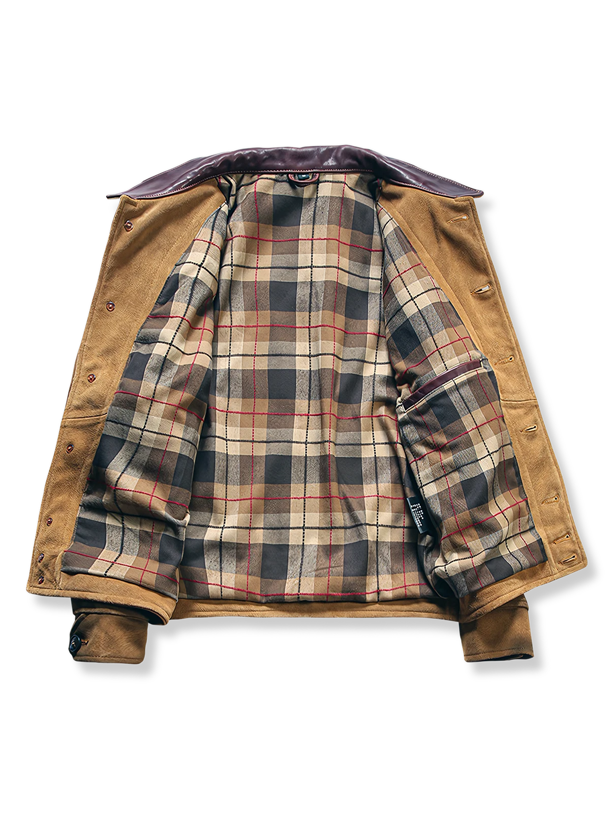 襟部分は深い茶色のワックス仕上げの牛革で切り替えられ、裏地にはポリエステルのチェック生地を使用しており、ジャケット全体で約4キログラム以上の重さがあります。