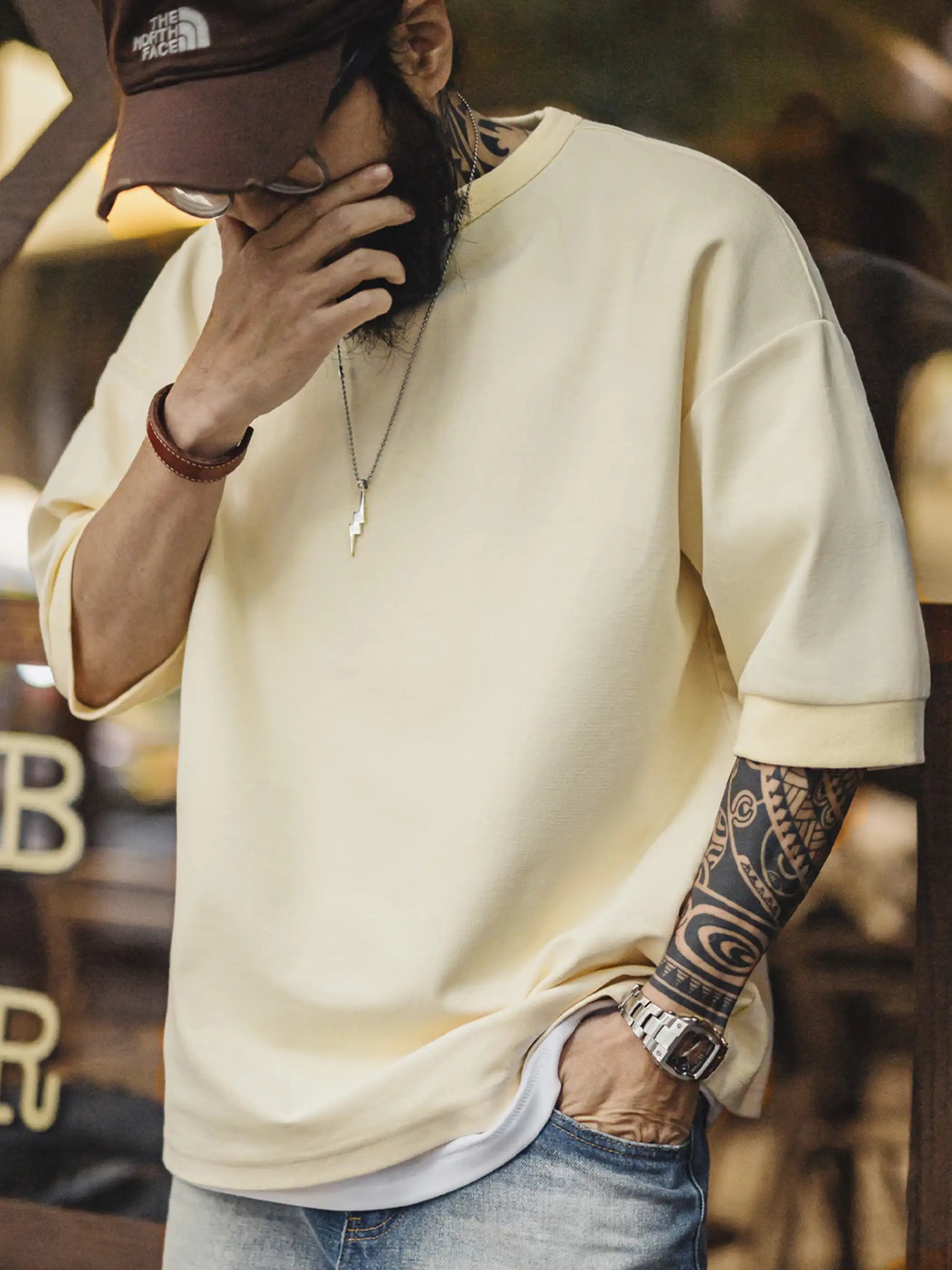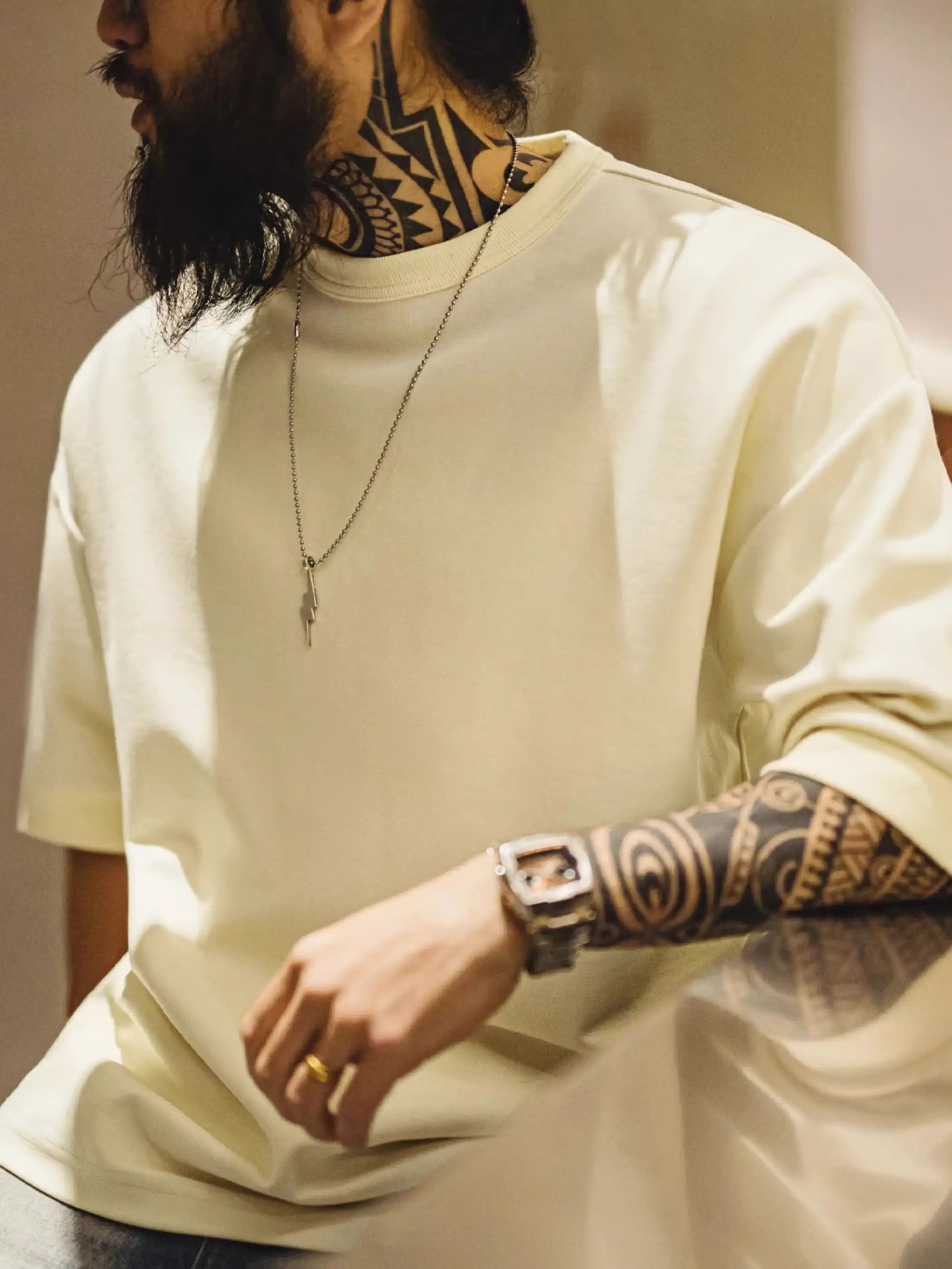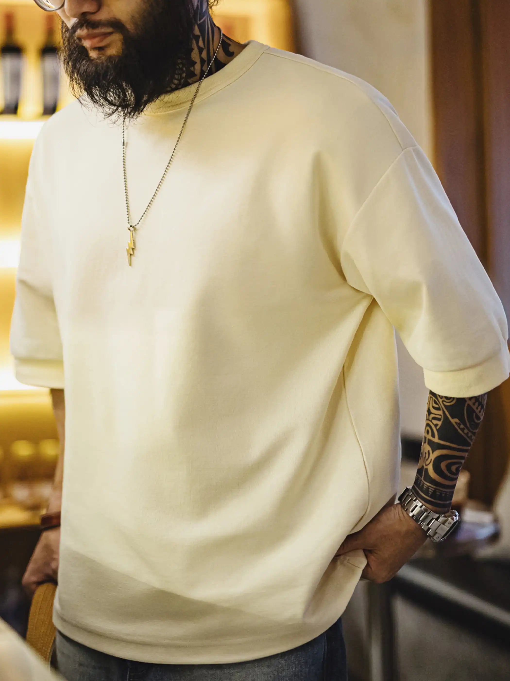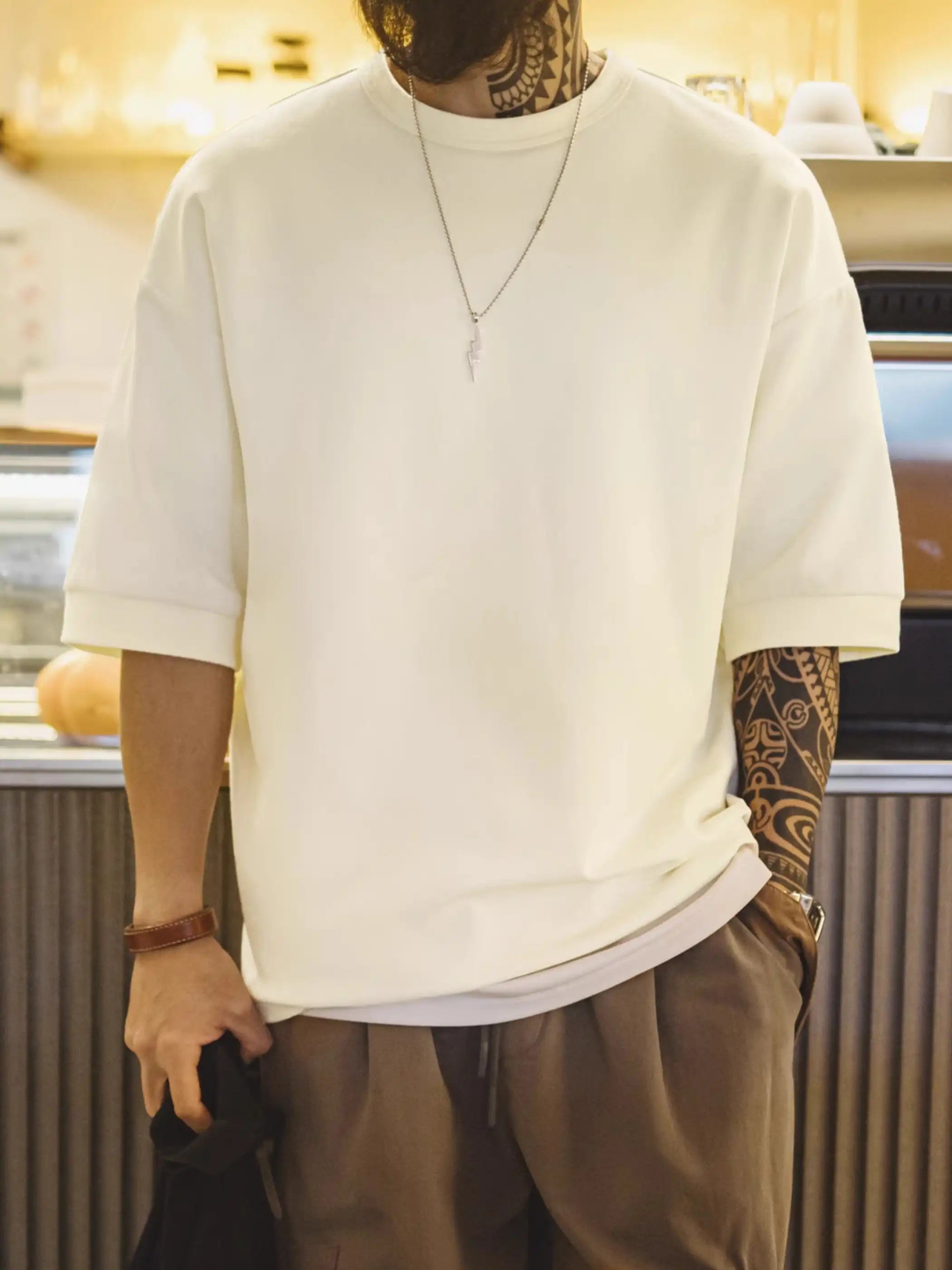 このTシャツは、ゆったりとしたドロップショルダーデザインと高いコットン含有量による抜群の垂れ感で、毎日のコーディネートを快適かつおしゃれに仕上げる一着です。