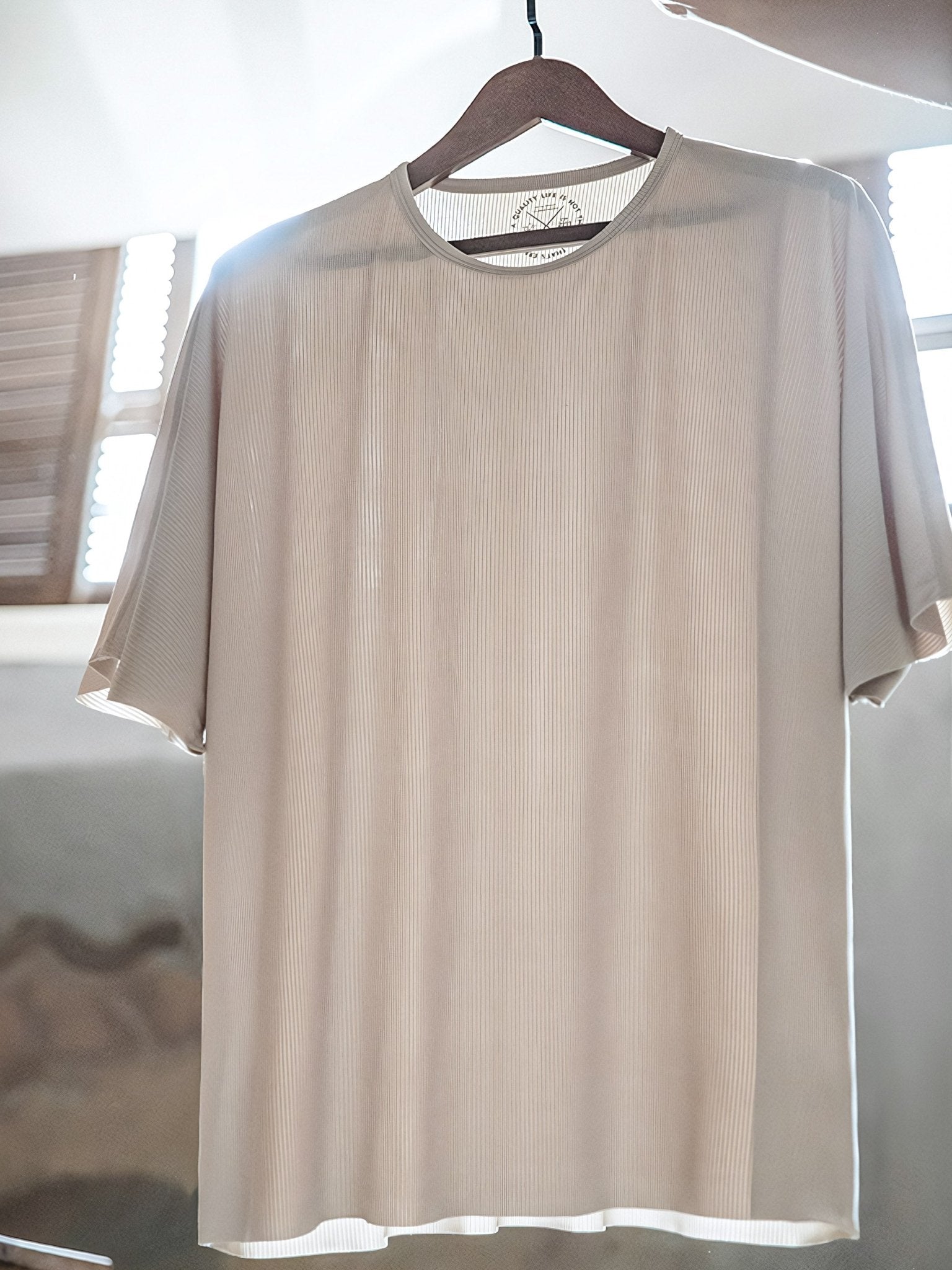 このショートスリーブTシャツは、程よいシルエットを採用しており、快適さと流れるような感覚を重視しています。オフショルダーデザインは肩のゆとりをもたらし、着用が自然で束縛されないようになっています。全体的なシルエットはややゆったりとしており、アイスシルクのニット生地と相まって、Tシャツは涼しく快適な着心地を提供します。