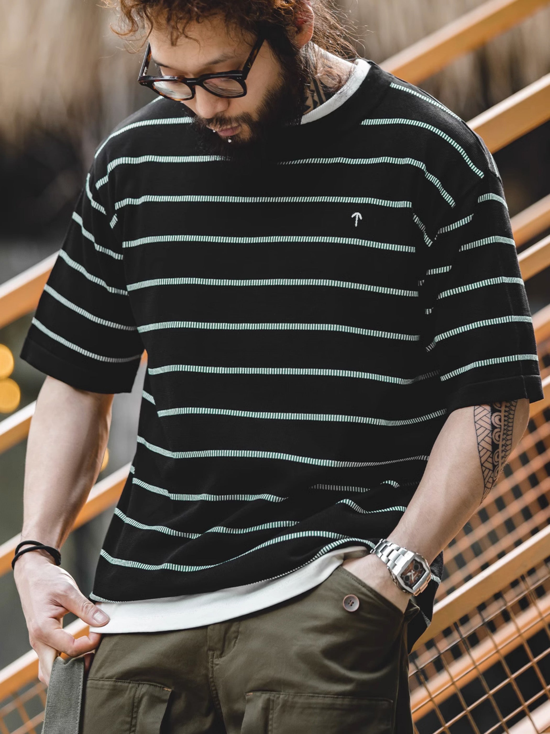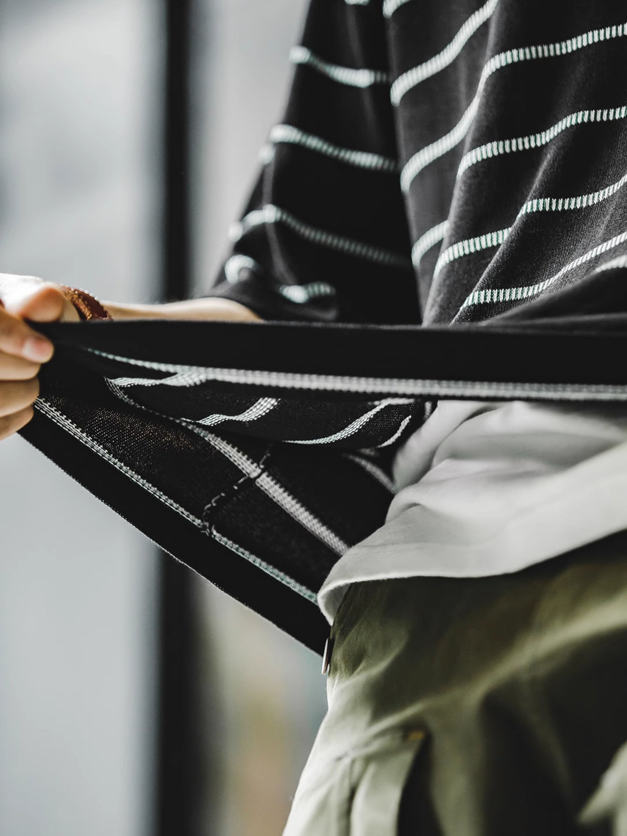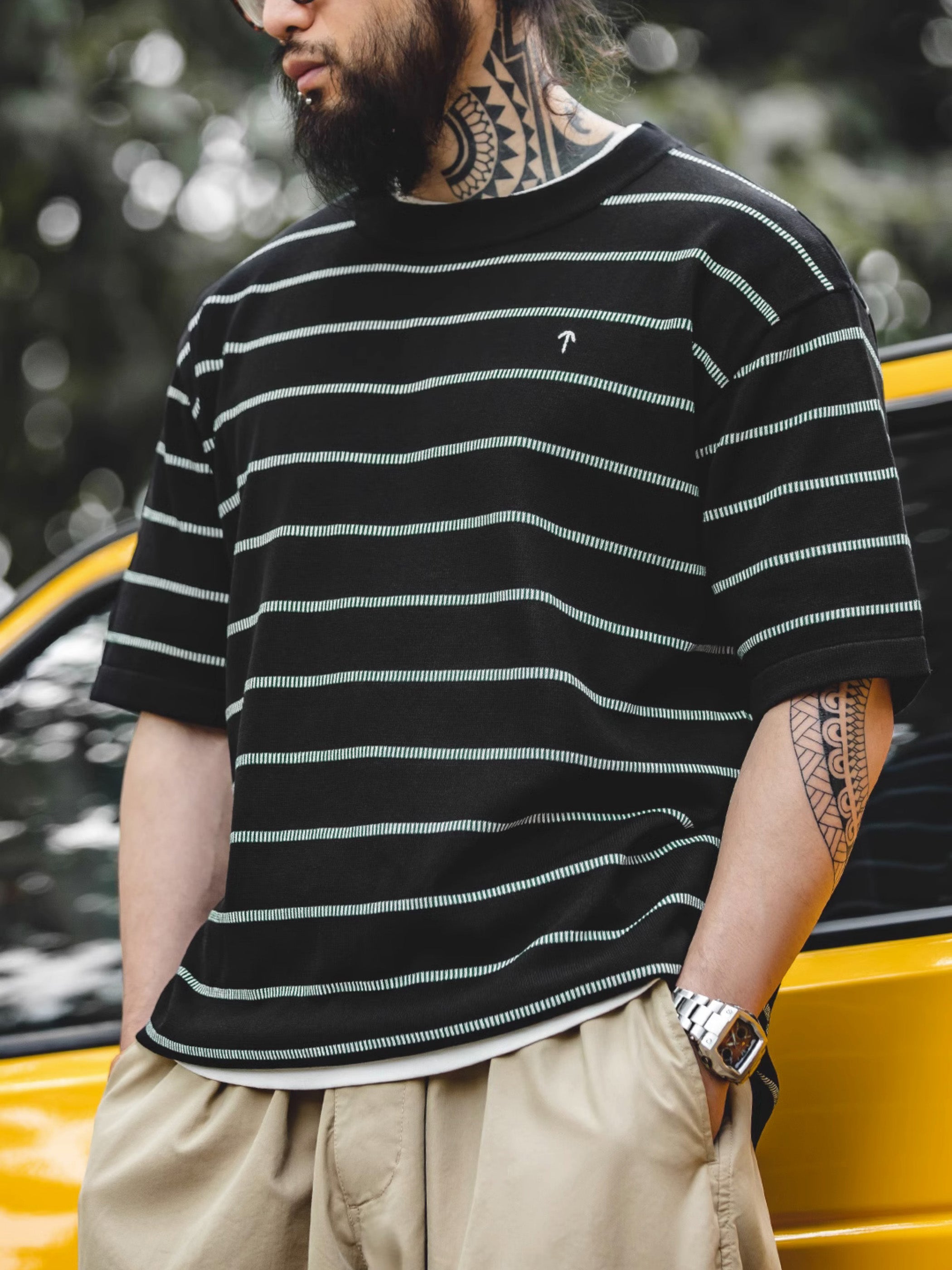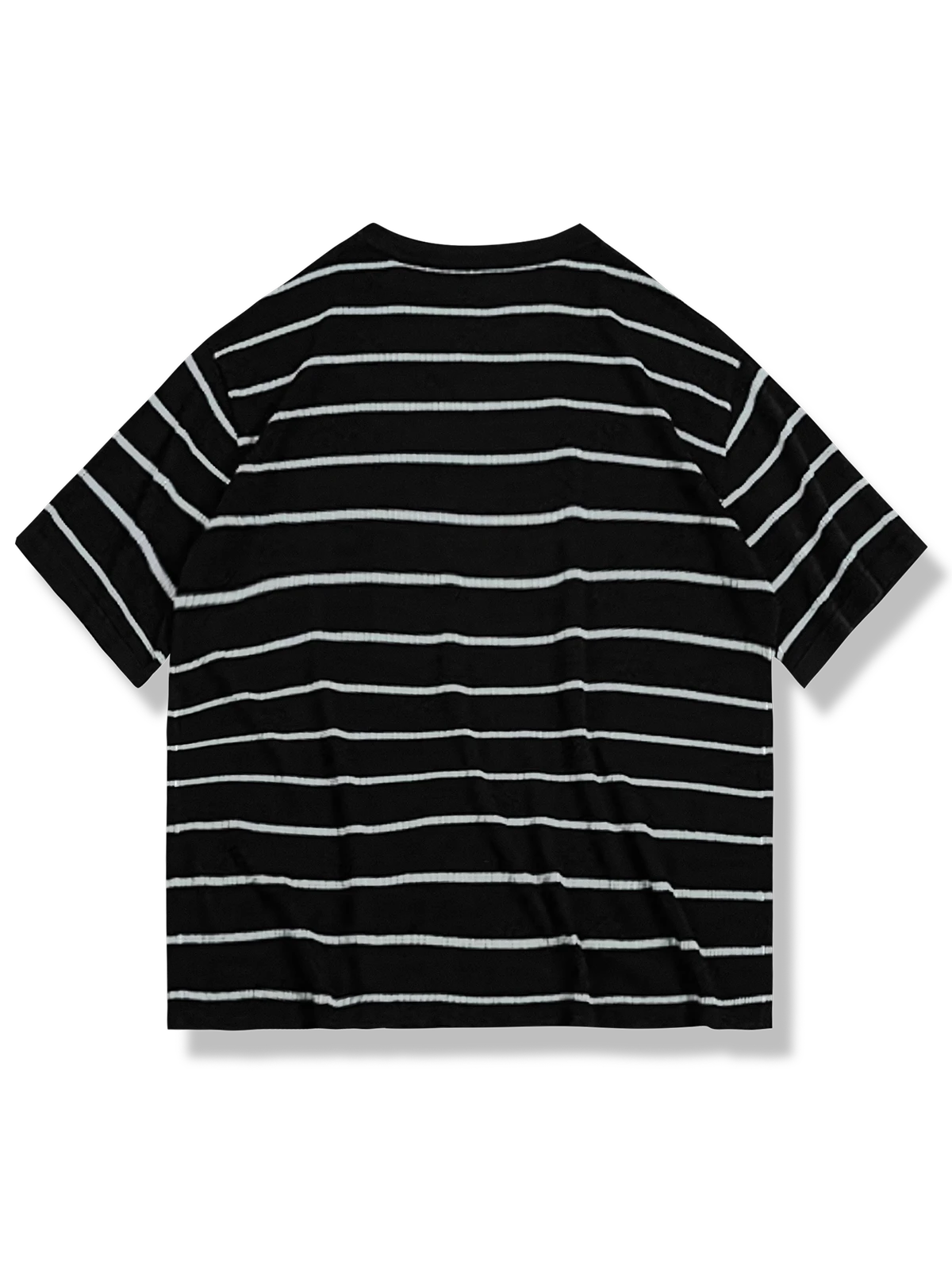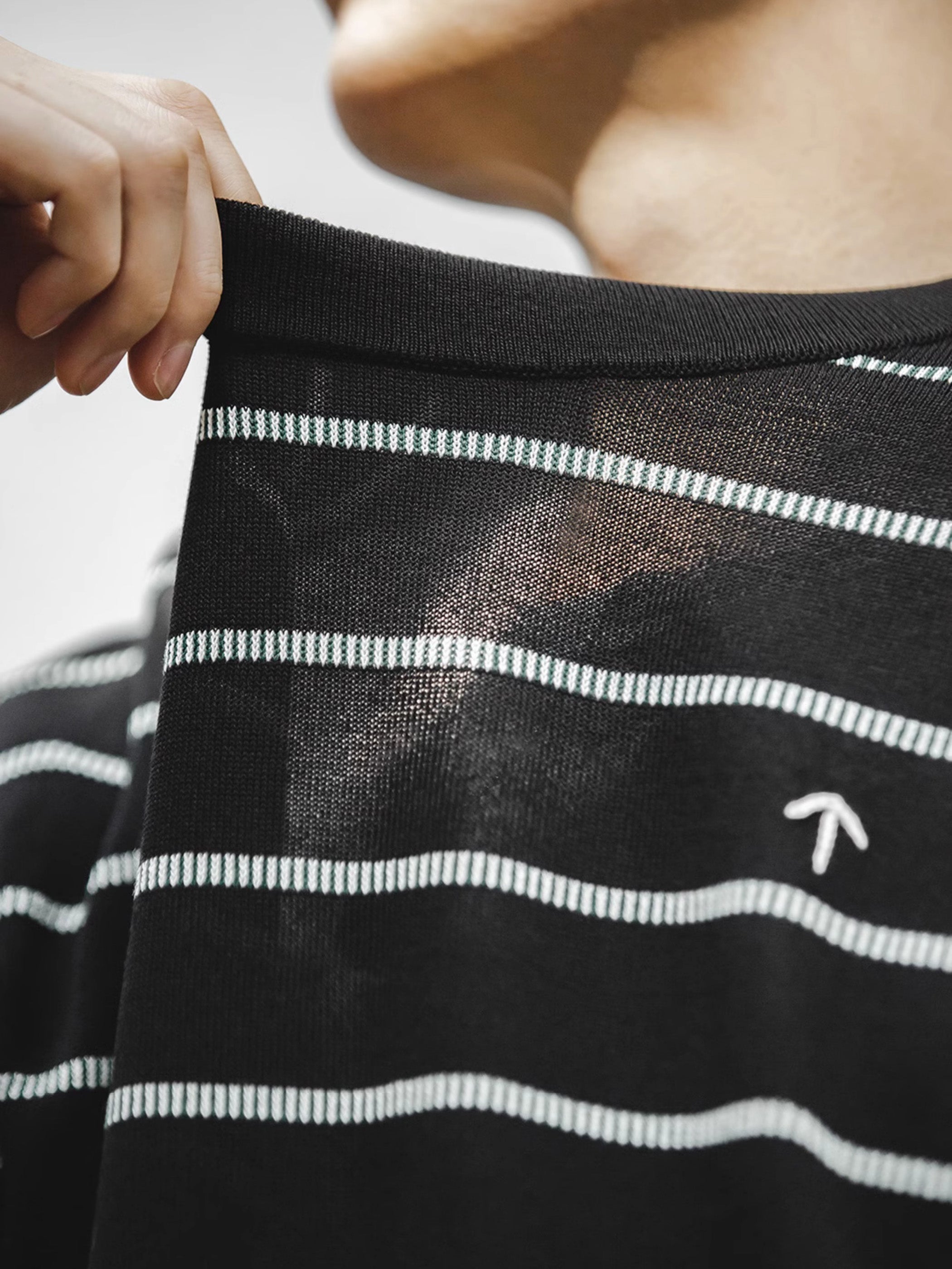 細かく整列された縦のストライプが、細い横のストライプパターンを形成しています。素材には63.2%の粘性繊維と36.8%のナイロンを使用し、Tシャツのドレープ感を向上させ、涼しく伸縮性のある着心地を提供しています。