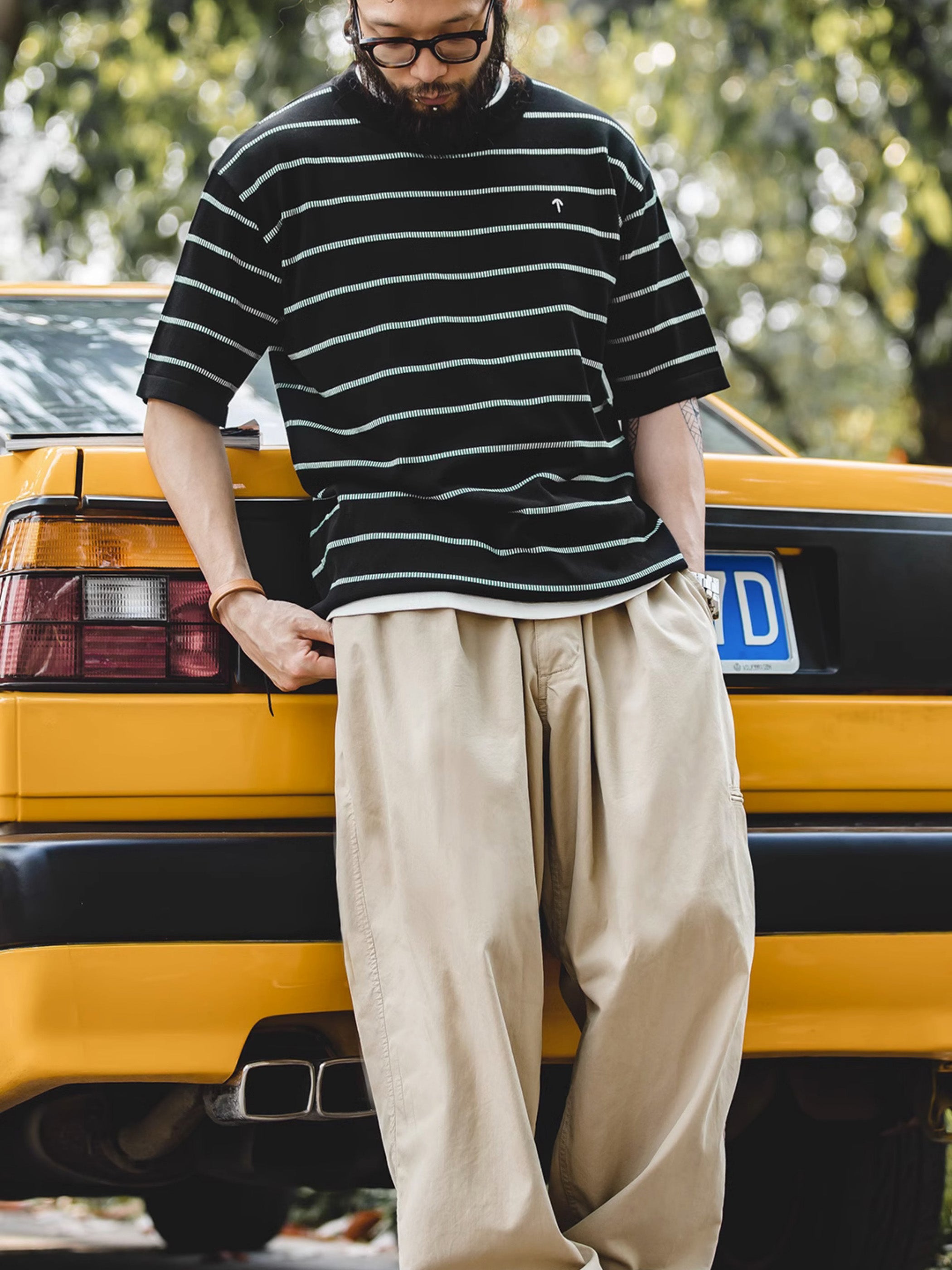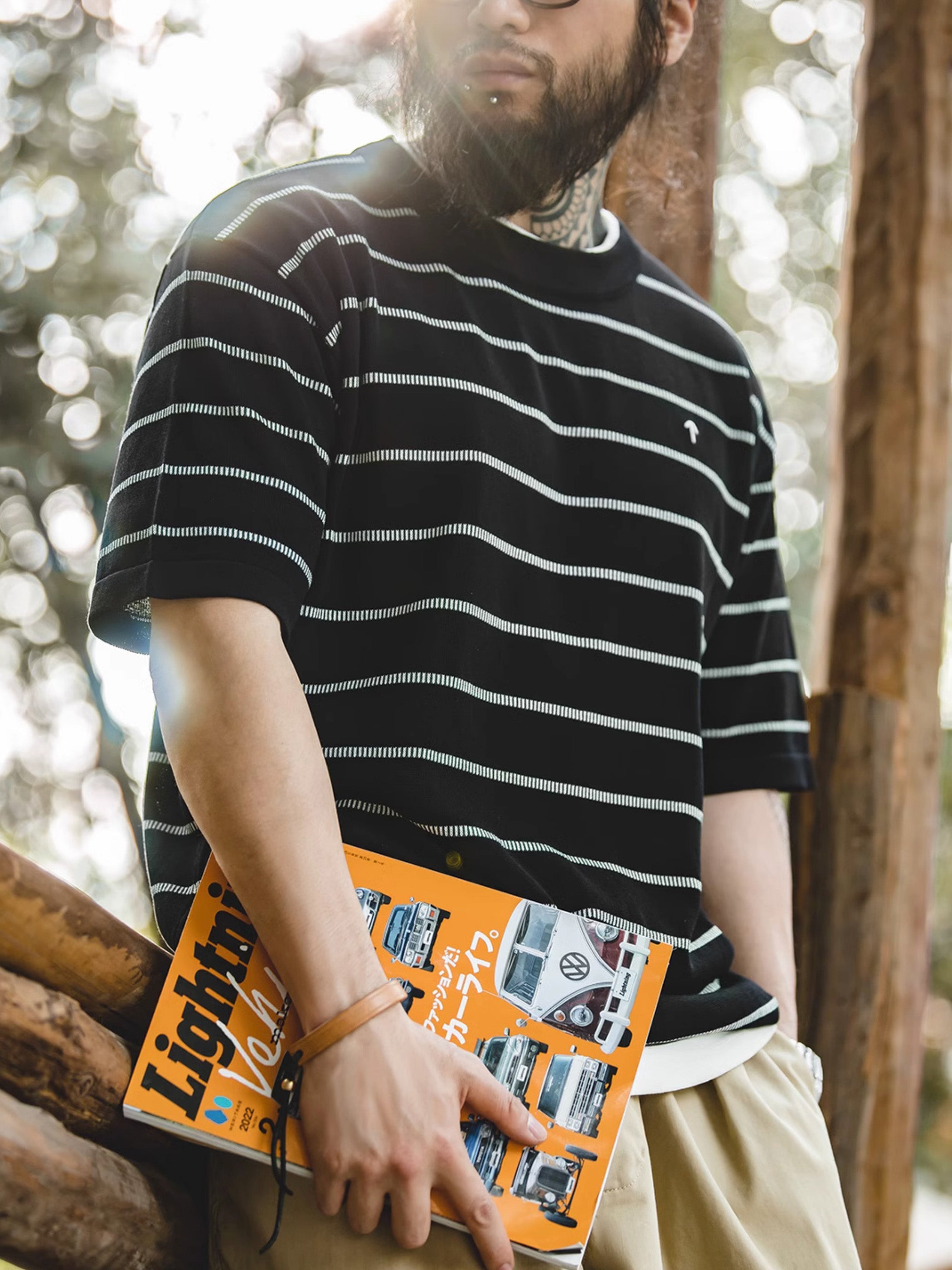 この黒白のTシャツは、クラシックなニット製品です。大きな間隔の細いストライプが、通常のストライプよりも上品な印象を与えます。