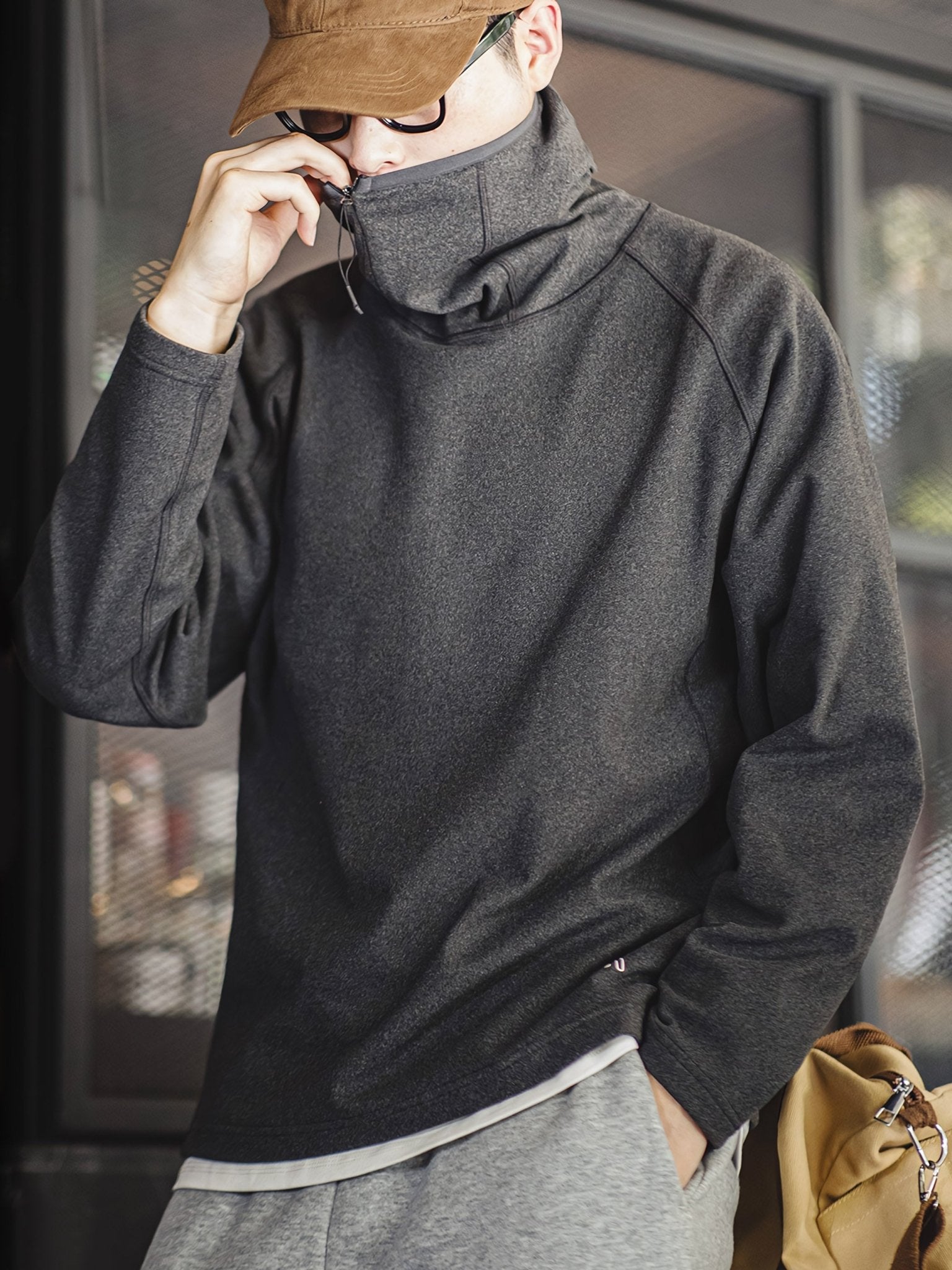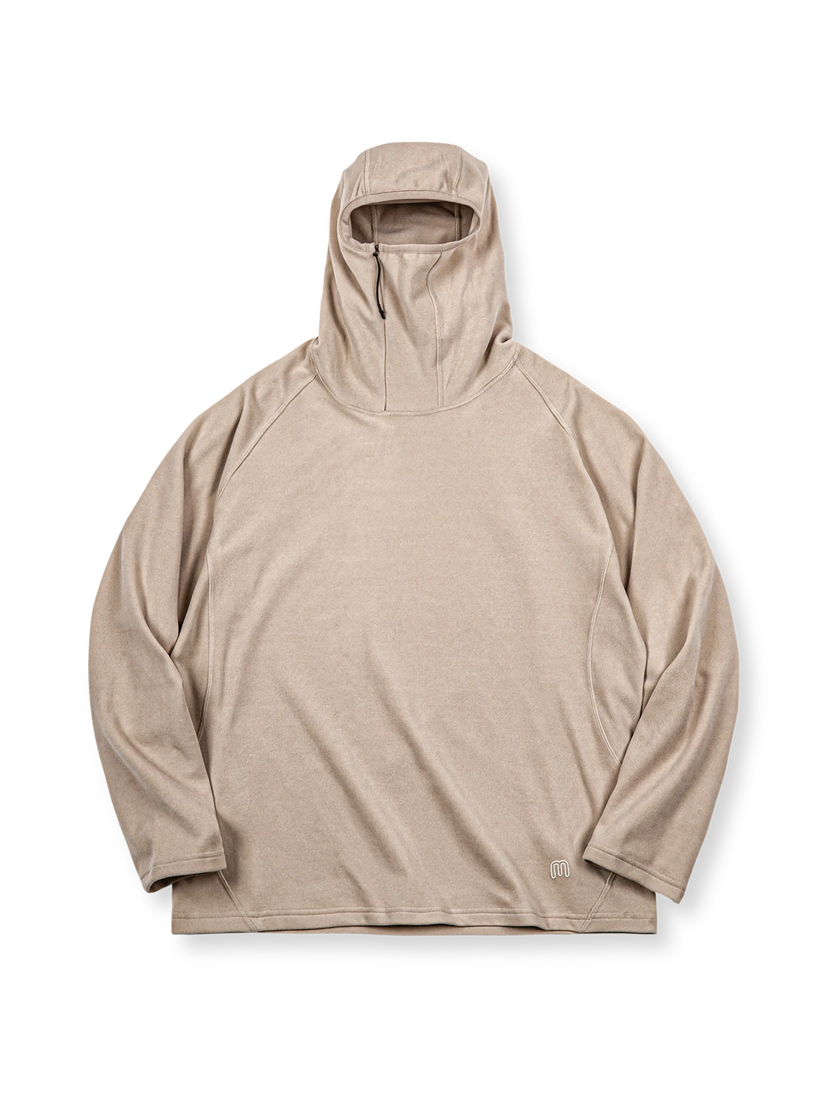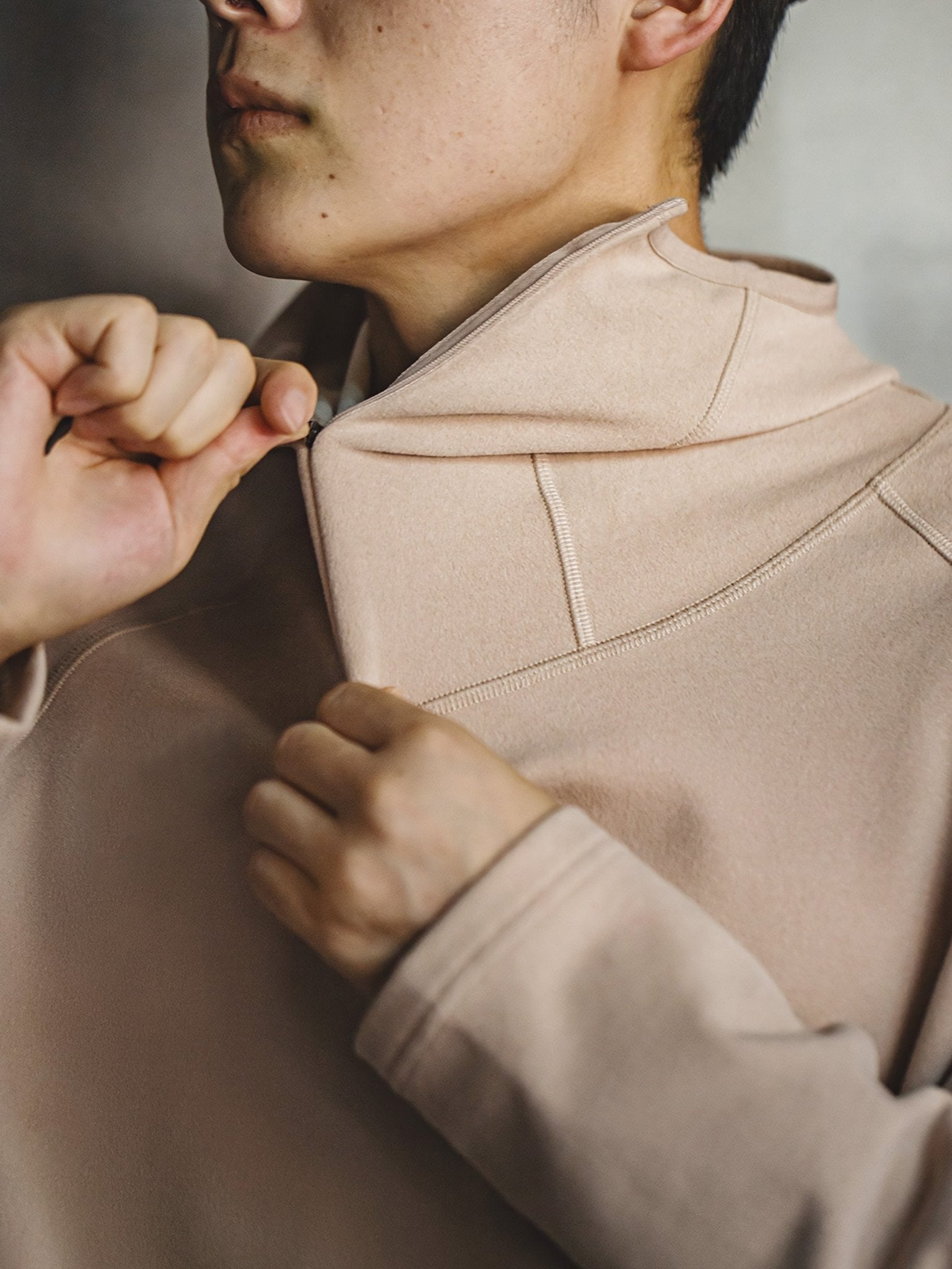 サイドには、視界の追従性を調整するためのファスナーが付いて、フードの周囲のフィット感を調整できます。表面には、微細な起毛感とヴィンテージ感のある質感を持つサンディング加工が施されています。