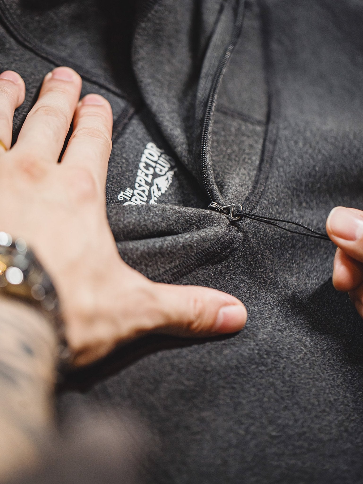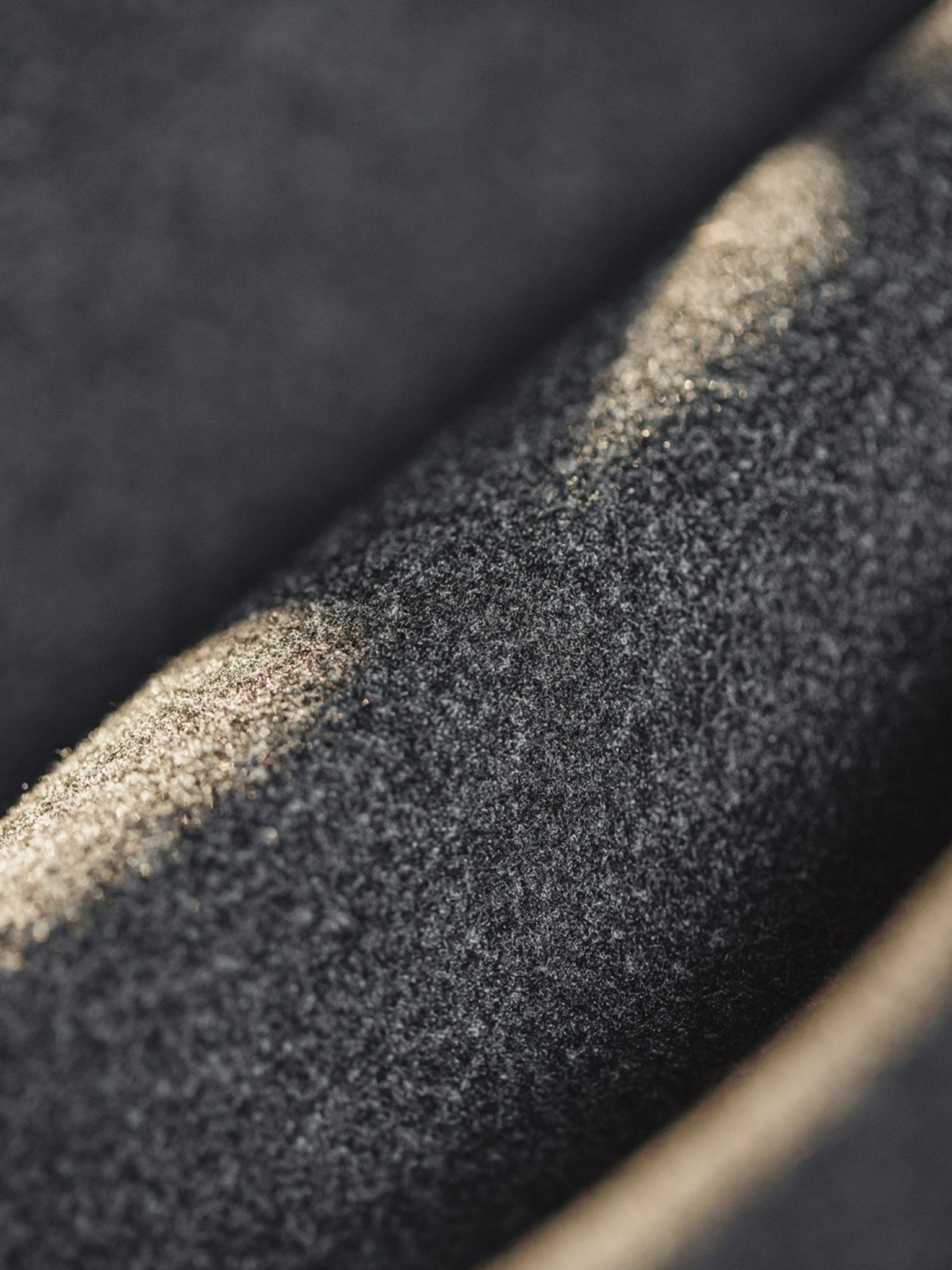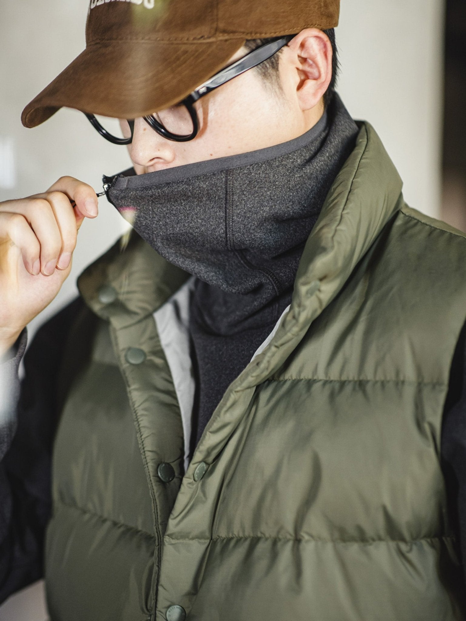 サイドには、視界の追従性を調整するためのファスナーが付いて、フードの周囲のフィット感を調整できます。表面には、微細な起毛感とヴィンテージ感のある質感を持つサンディング加工が施されています。