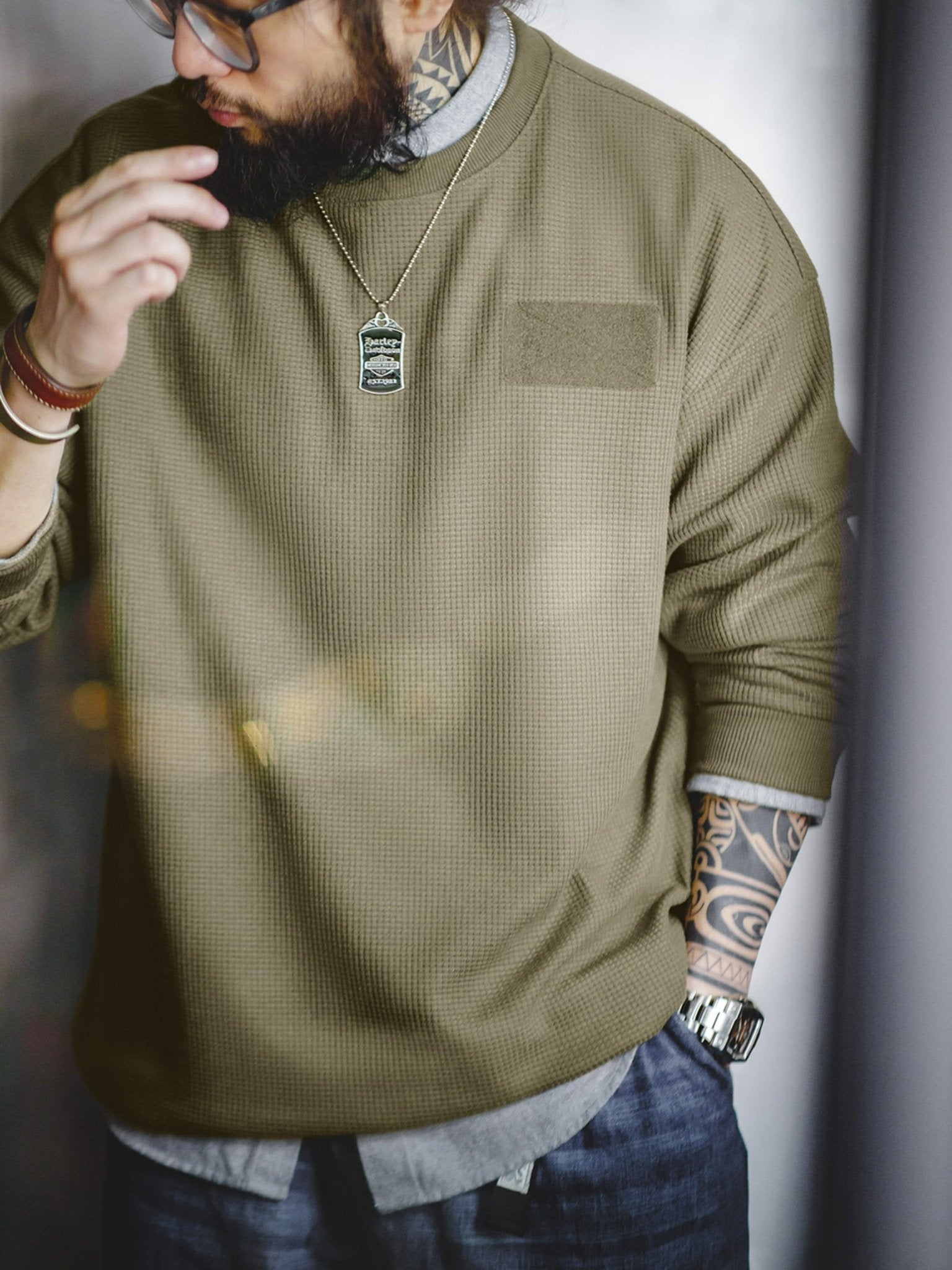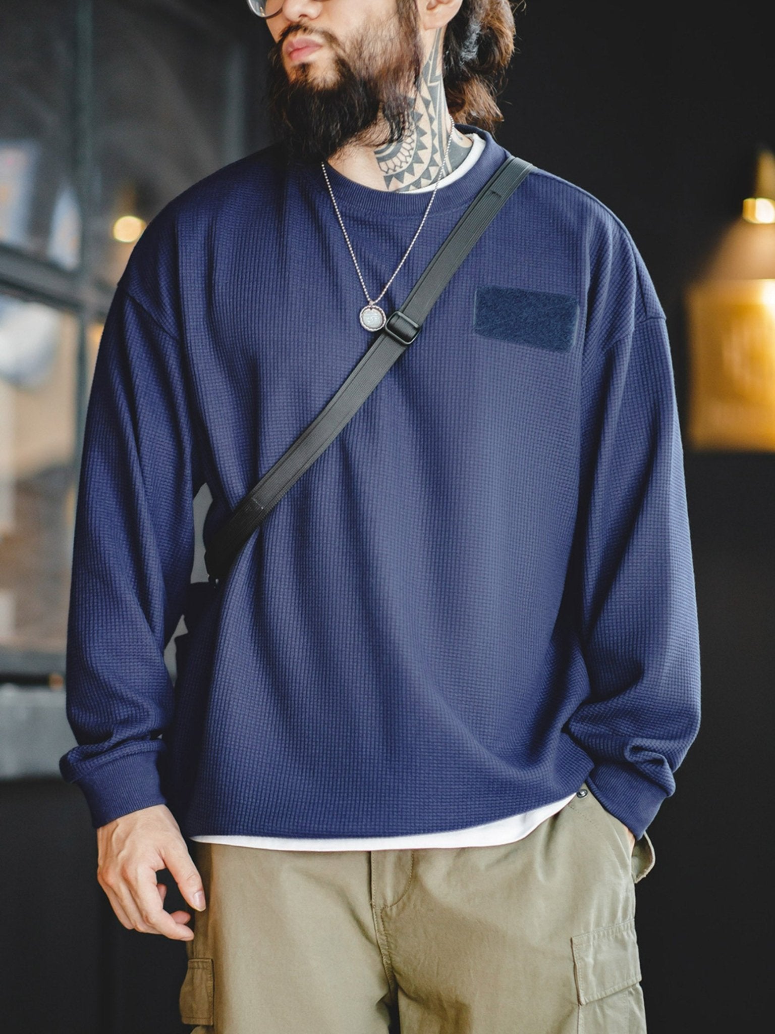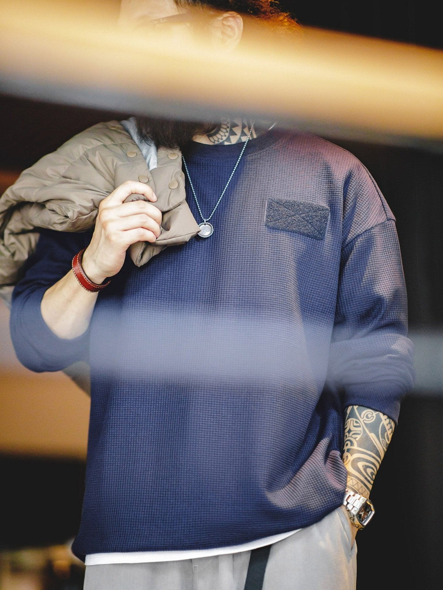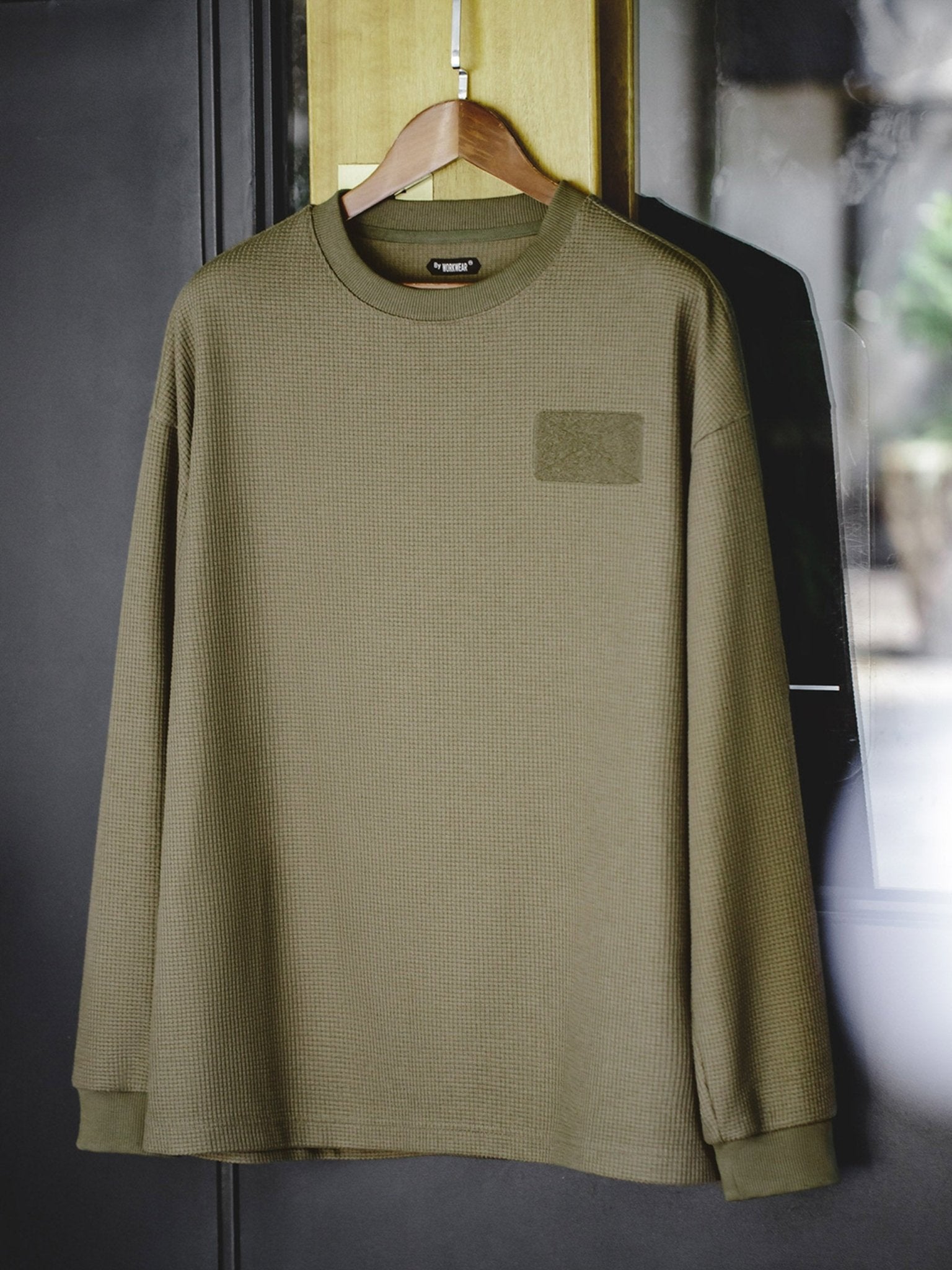 左胸にはDIY可能なマジックテープが取り付けられており、個人の好みやスタイルに合わせてカスタマイズできます。たとえば、パッチやワッペンを取り付けたり、ポケットを追加したりすることができます。袖口はリブ編みで仕上げられ、しっかりとしたフィット感を提供します。