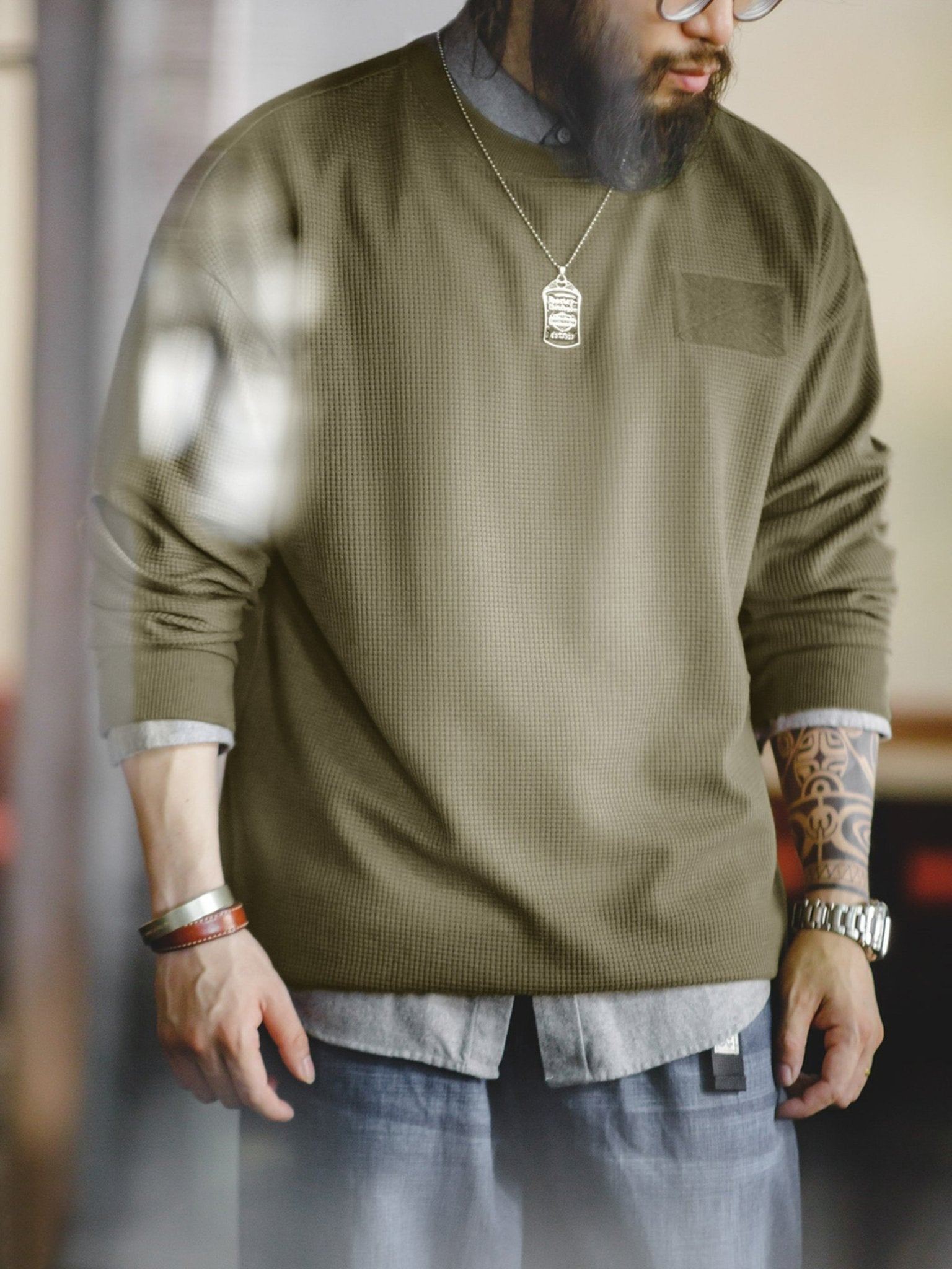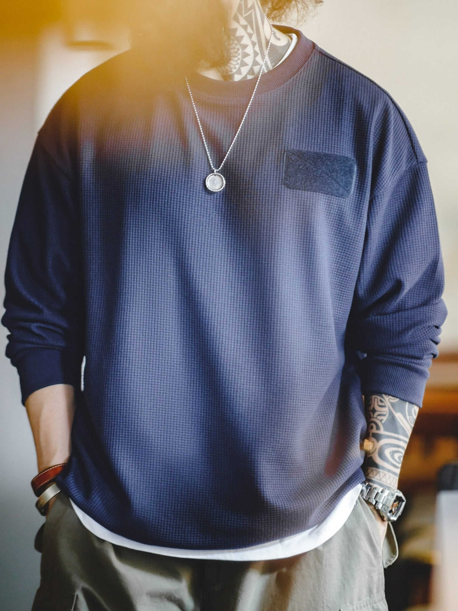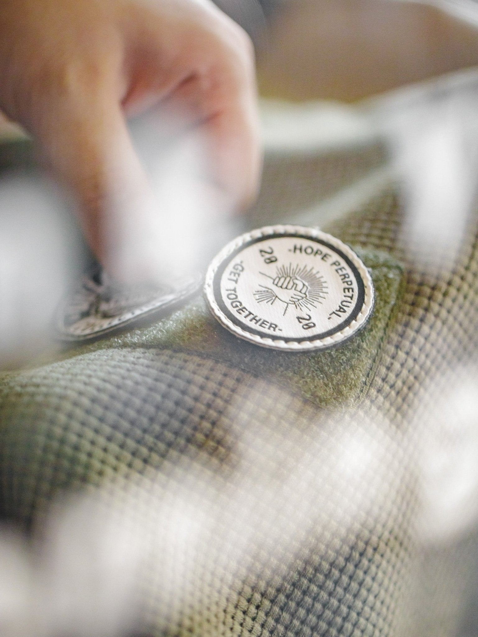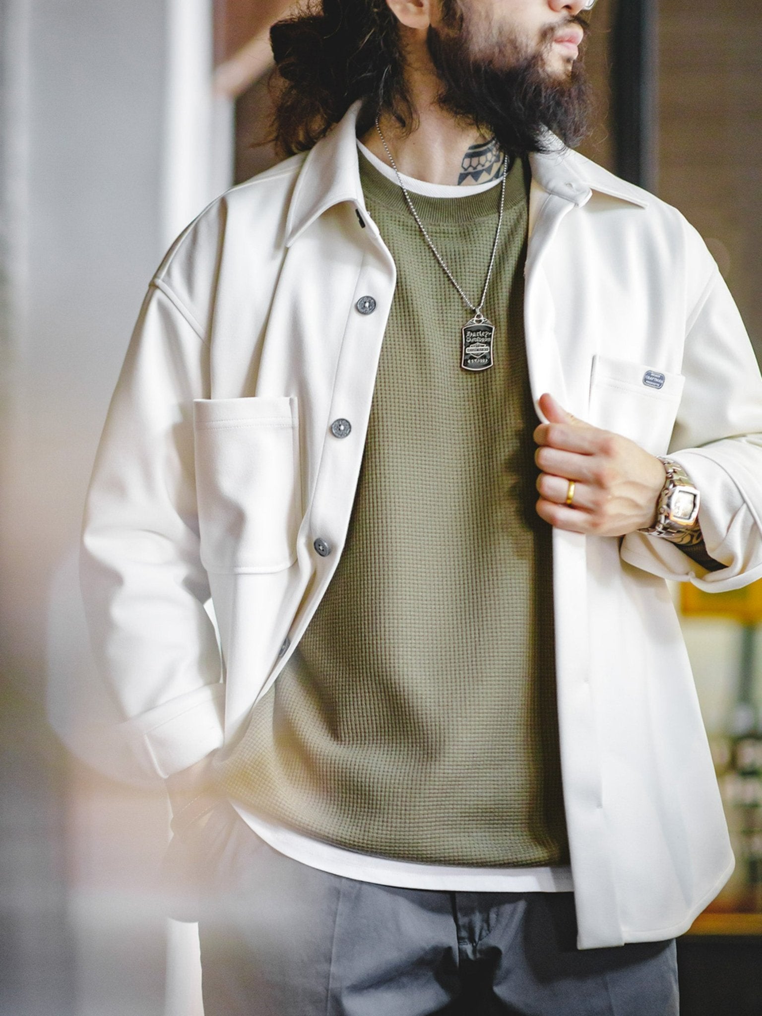 左胸にはDIY可能なマジックテープが取り付けられており、個人の好みやスタイルに合わせてカスタマイズできます。たとえば、パッチやワッペンを取り付けたり、ポケットを追加したりすることができます。袖口はリブ編みで仕上げられ、しっかりとしたフィット感を提供します。