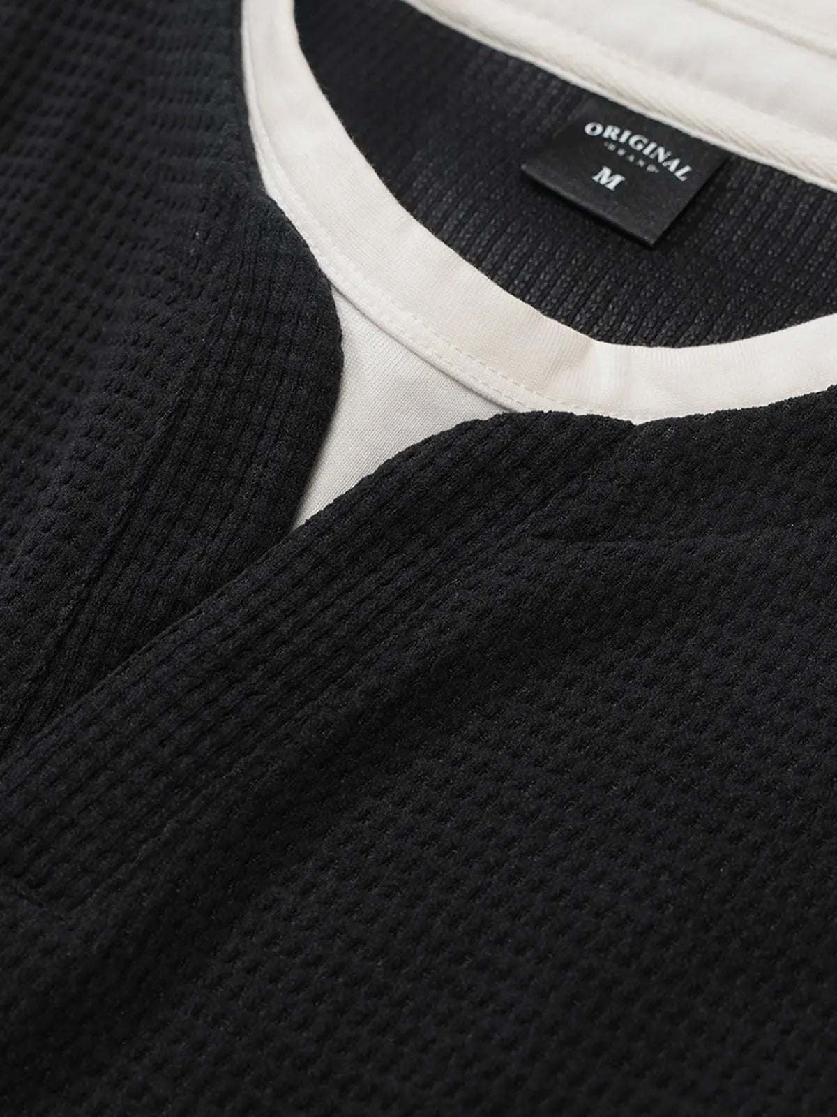 この長袖Tシャツは、伝統的なヘンリーシャツの歴史を背景に、現代カジュアルと調和するデザインが魅力です。Vネック上部の内側パネルがレイヤード感を明確に演出し、シンプルながら個性的な印象を与えます。400g欧米綿起毛ワッフル生地を使用し、保温性と快適な着心地を両立。春秋は単独着用、冬季はインナーとしても最適で、街中やカジュアルなシーンに自然に溶け込みます。