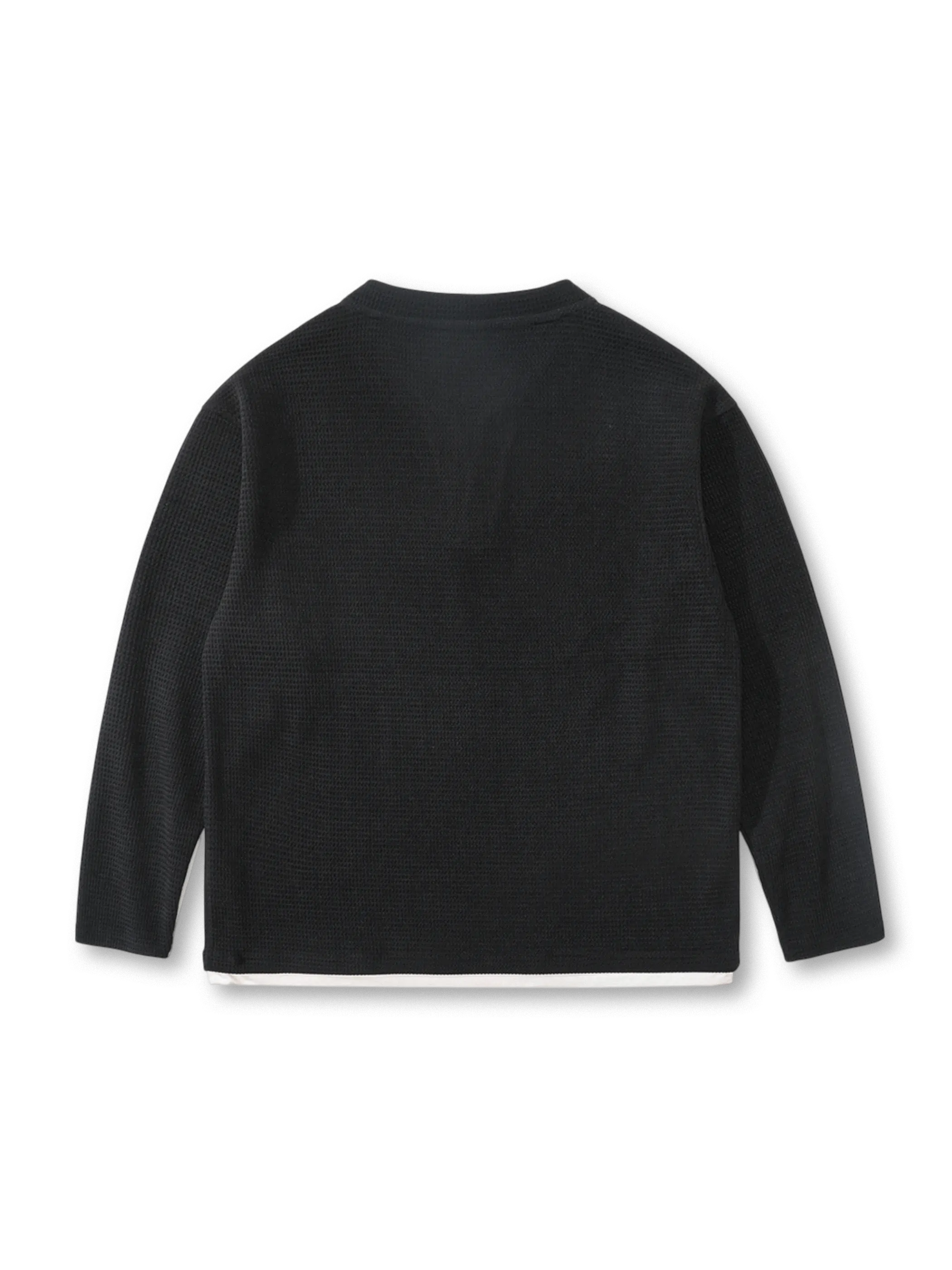 Vネックのフェイクレイヤー仕様と400g欧米綿起毛ワッフル生地が、快適さと重層的な着こなしを実現する長袖Tシャツです。
