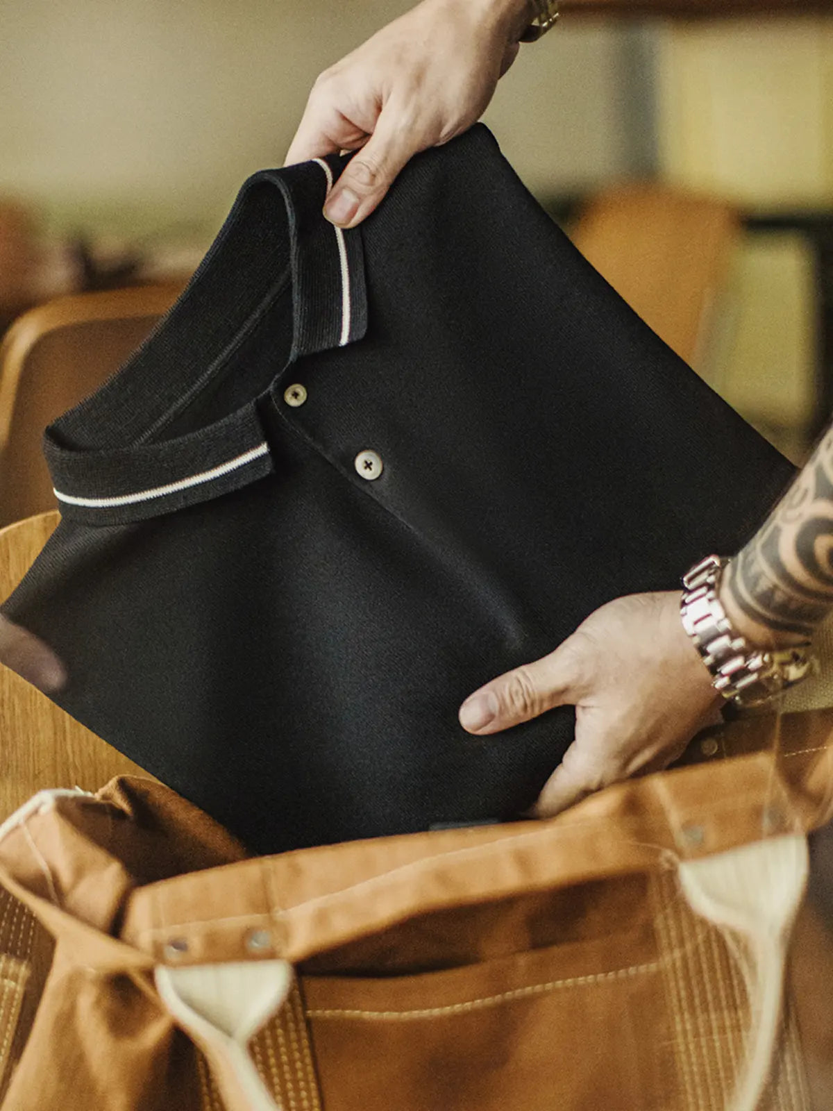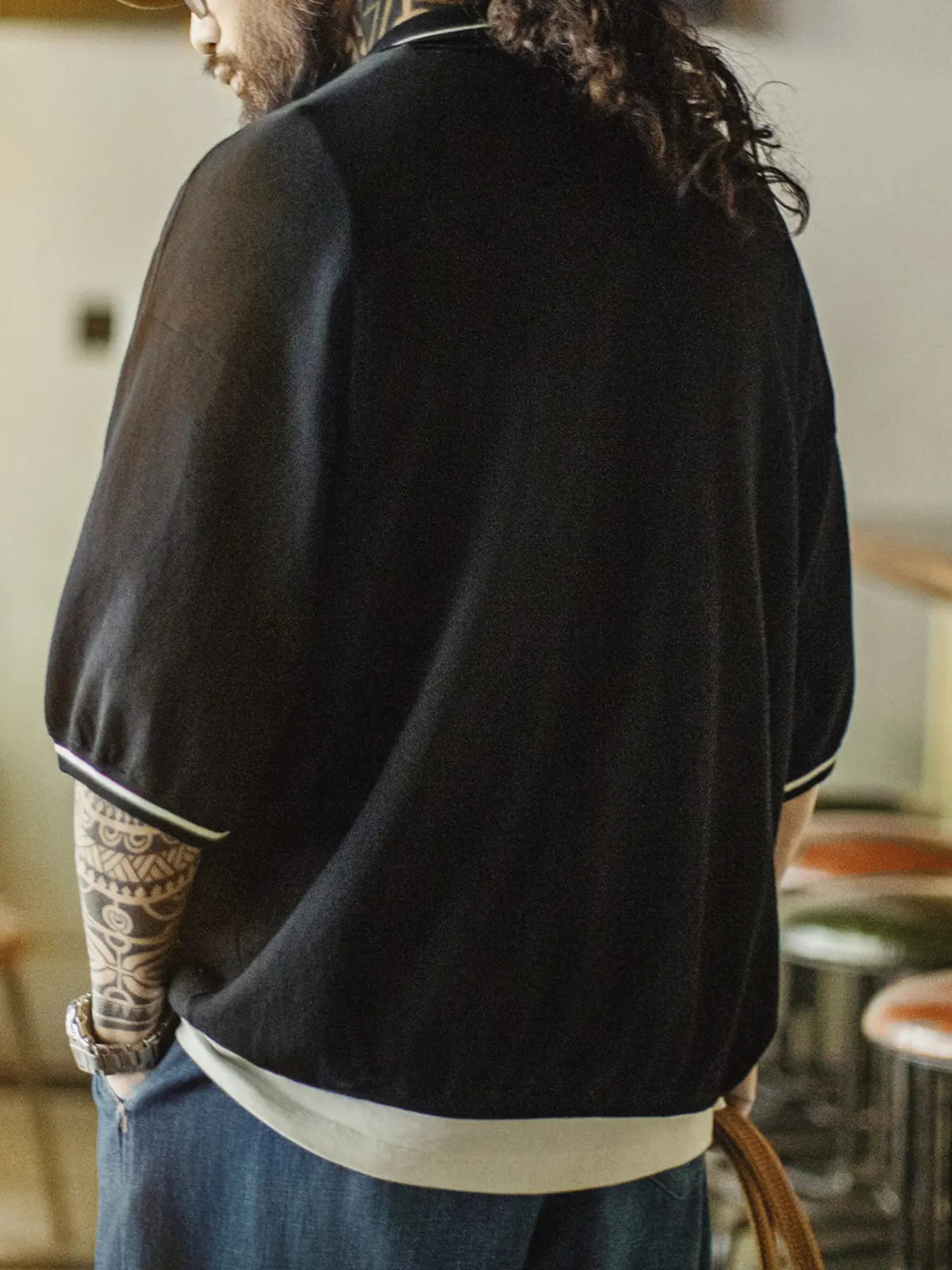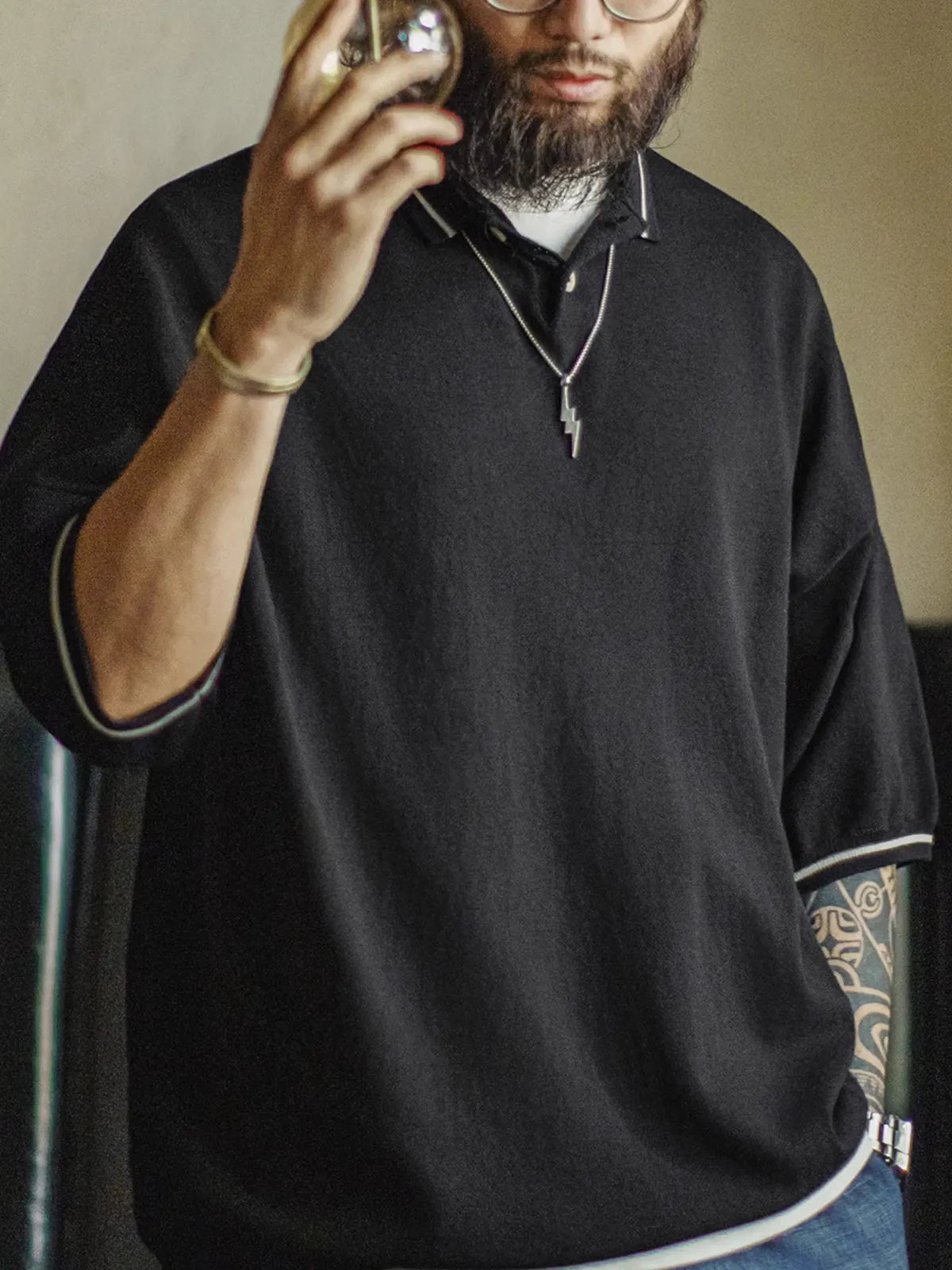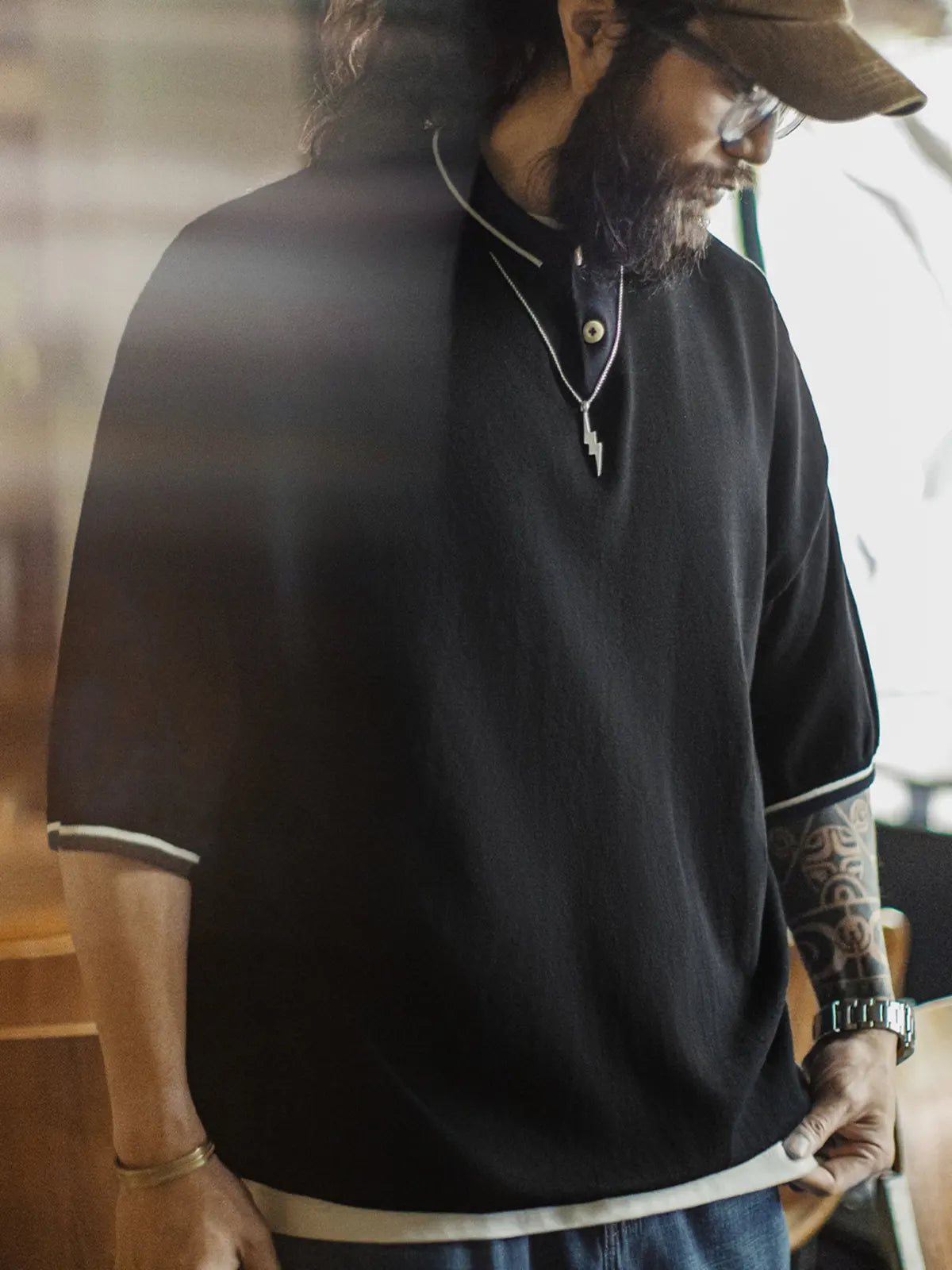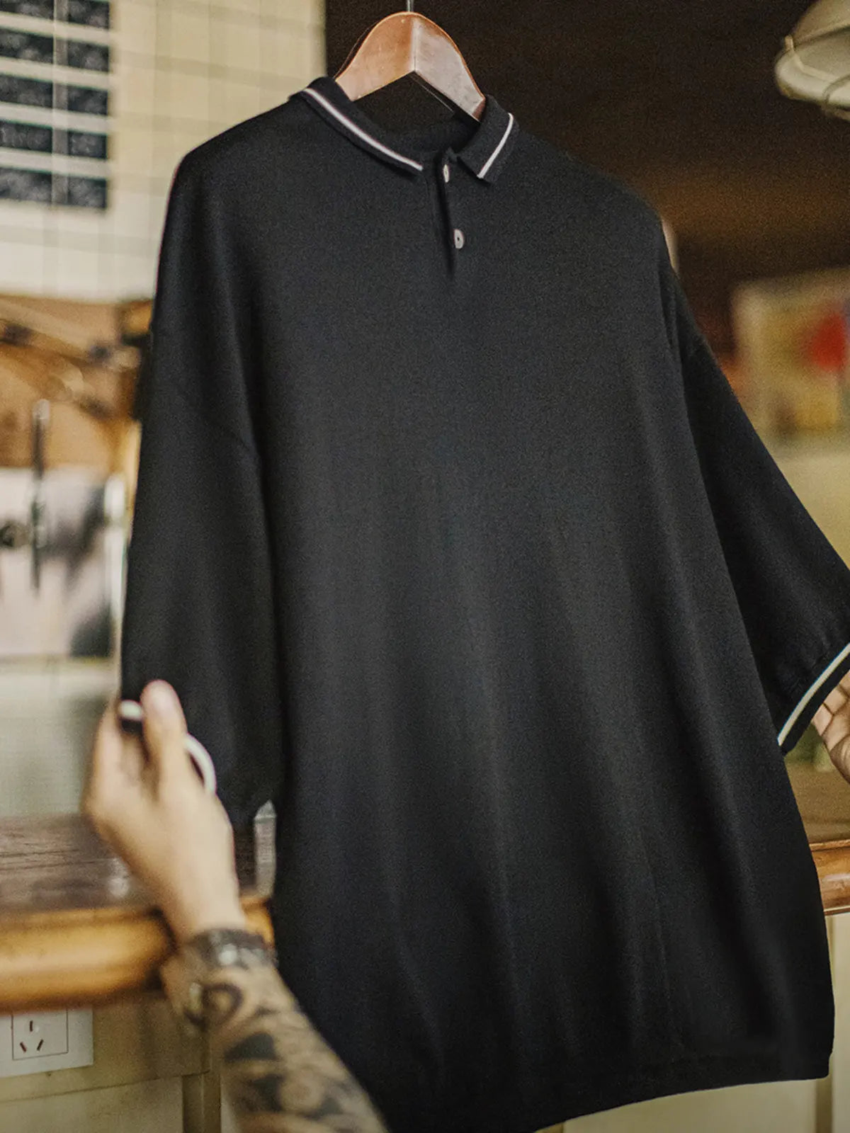 黒地に白ストライプ襟と袖口をあしらった、ゆったりサイズのリラックスポロ。