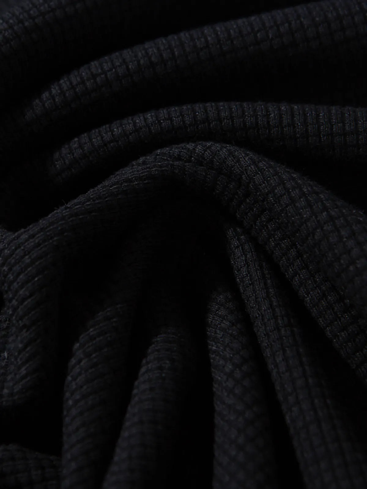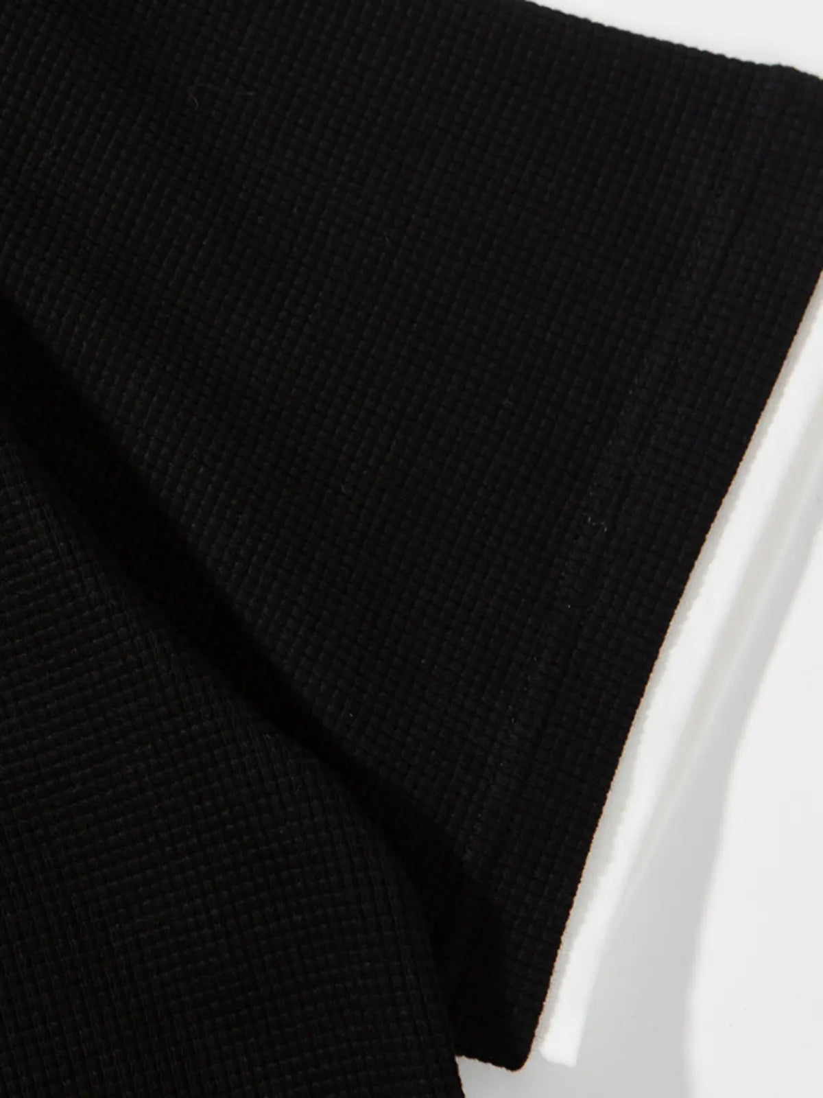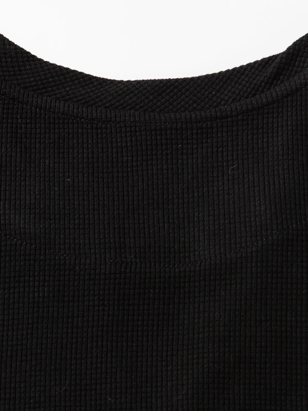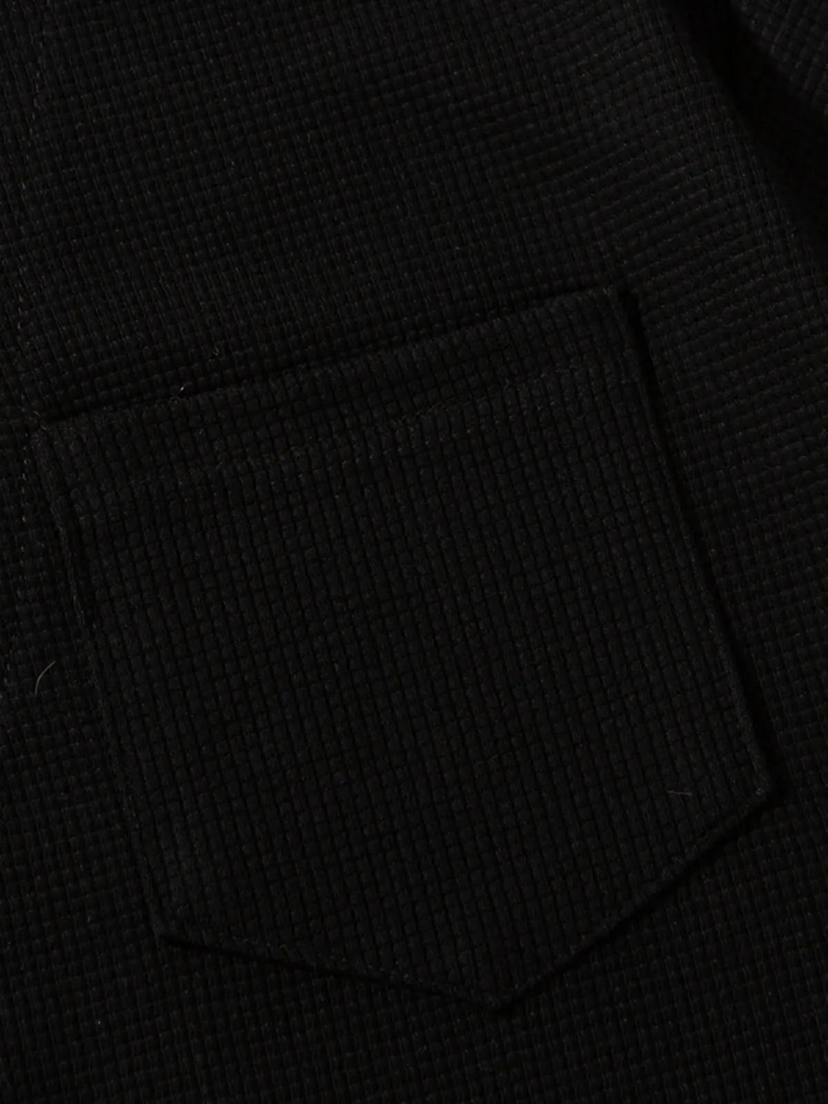 ワッフル生地特有の凹凸感と通気性があり、暑い季節でも快適に着用可能。適度なハリ感があり、カジュアルながらも上品な印象を演出。
