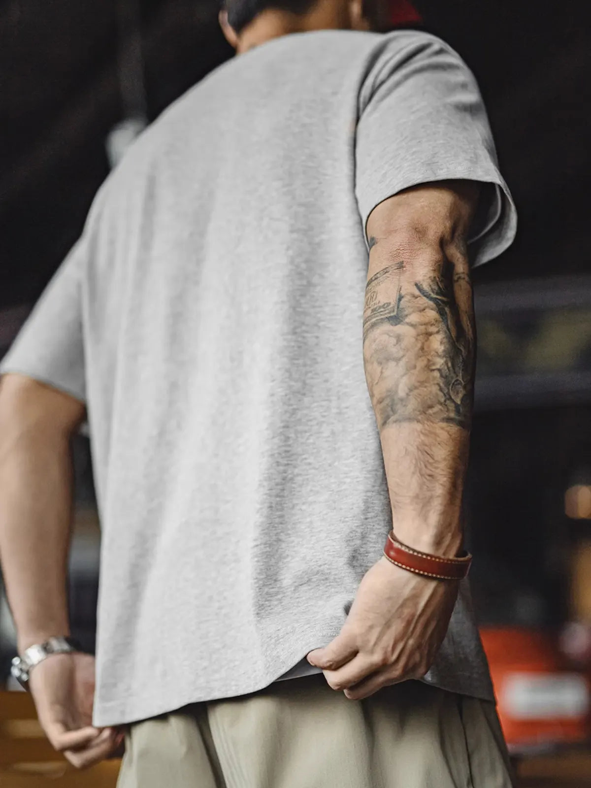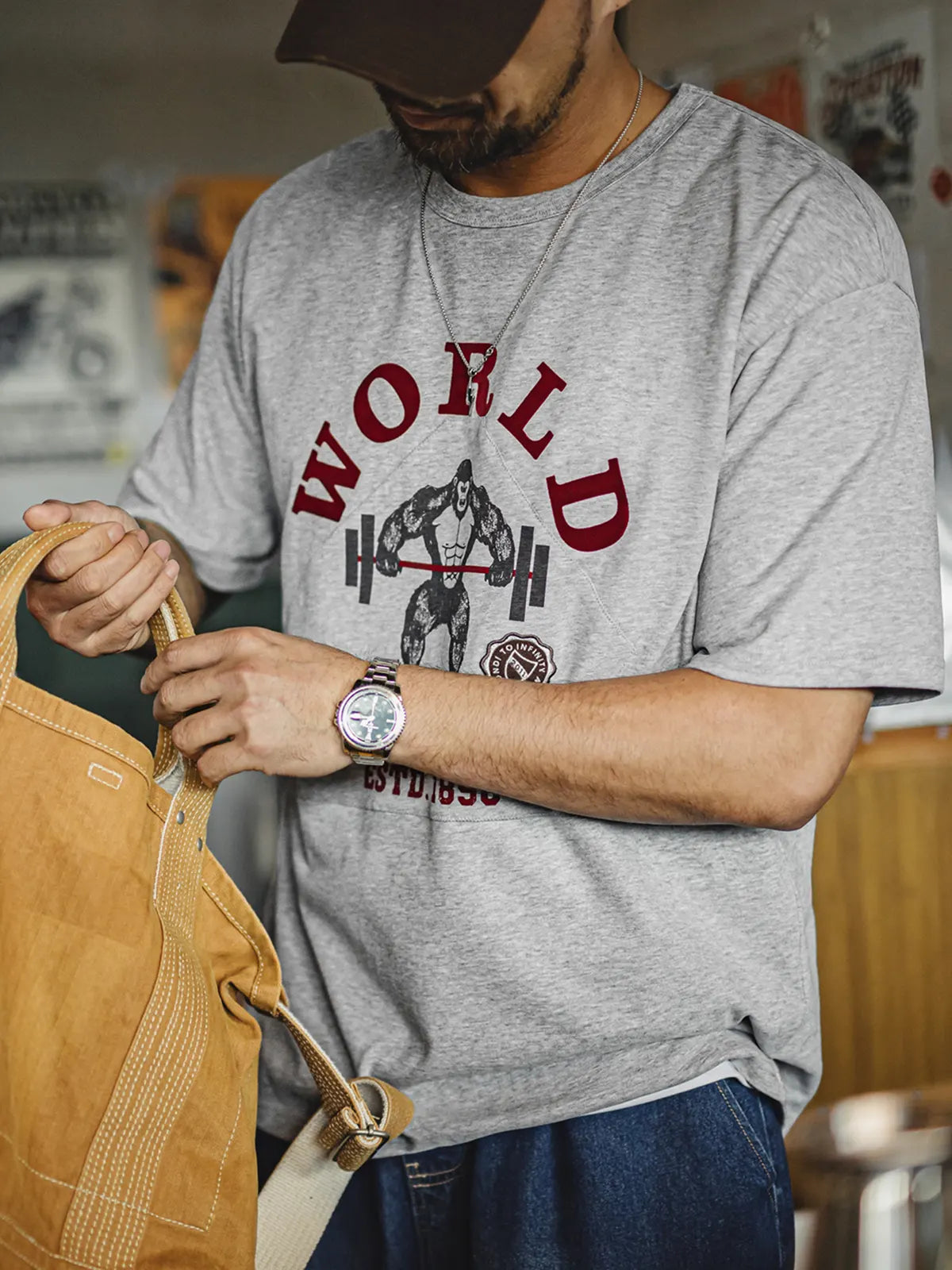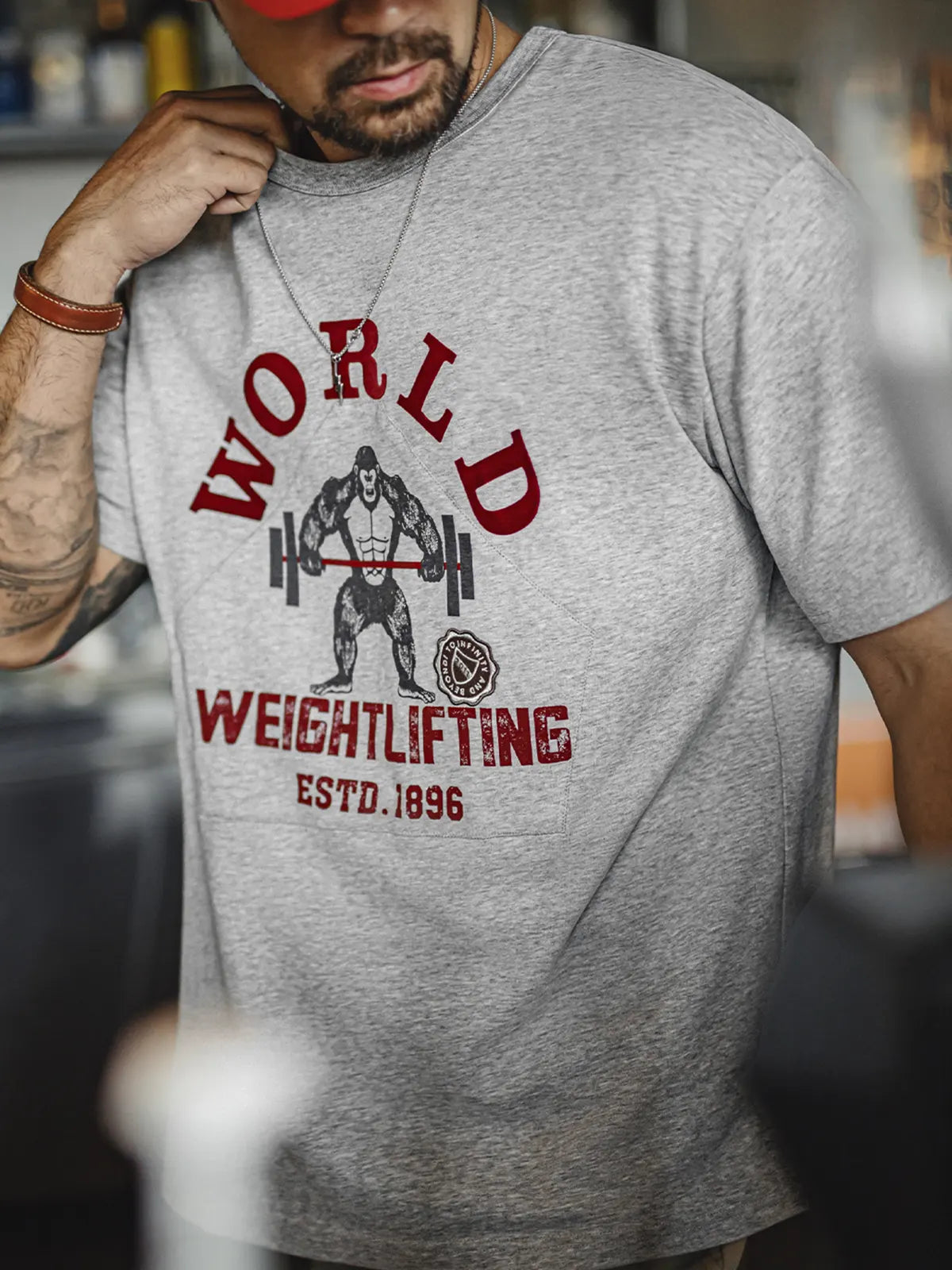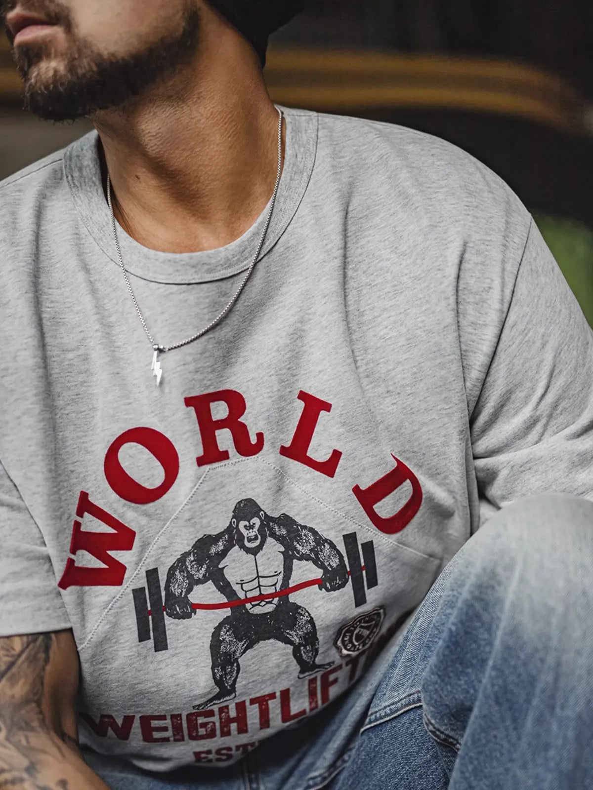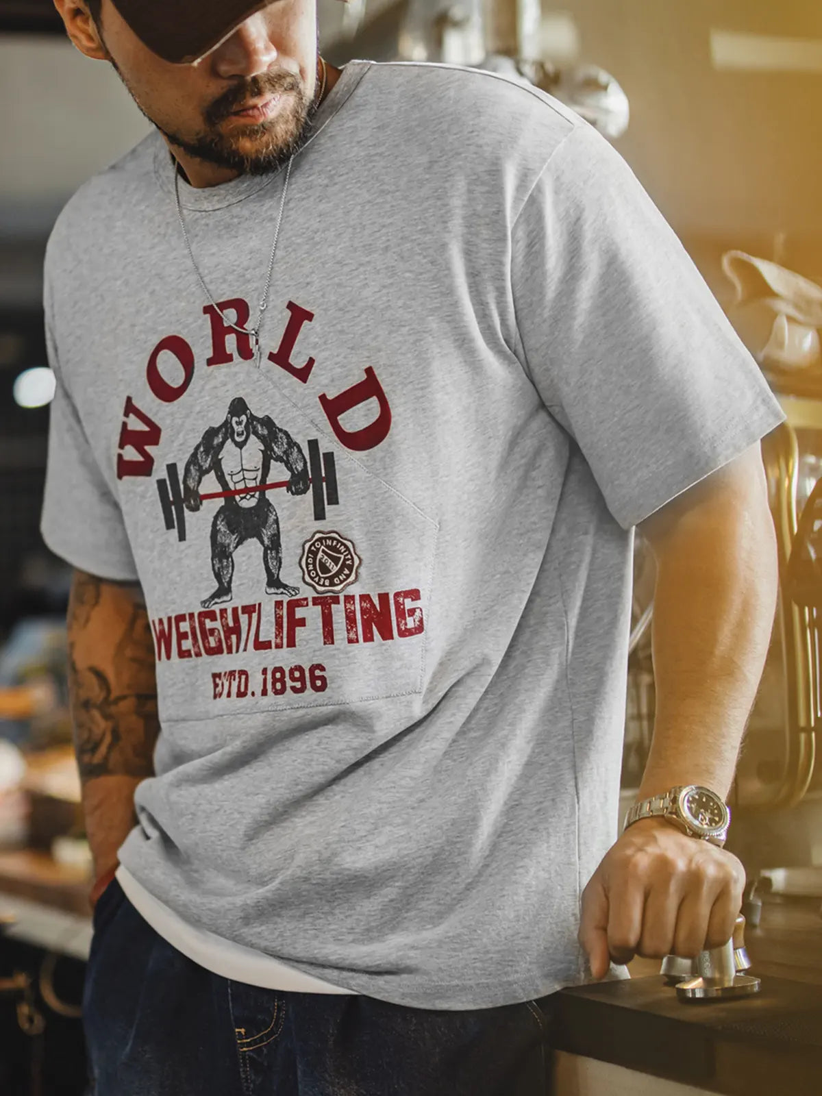 90年代のスポーツポスターを思わせる「猿+バーベル」のグラフィックが、エナジーとタフネスを表現。深みのあるレッドプリントとオリジナルワッペンを組み合わせた2層プリントが、ヴィンテージライクな質感をさらに強調します。230g/m²の双糸コットンはしっかりした厚みとハリを備え、前後身頃の立体裁断がボディラインを太く見せつつも動きを妨げないレギュラーフィットを実現。洗い加工ラベルが細部に「氛囲気」を添え、ストリートからスポーツシーンまで幅広く映えます。