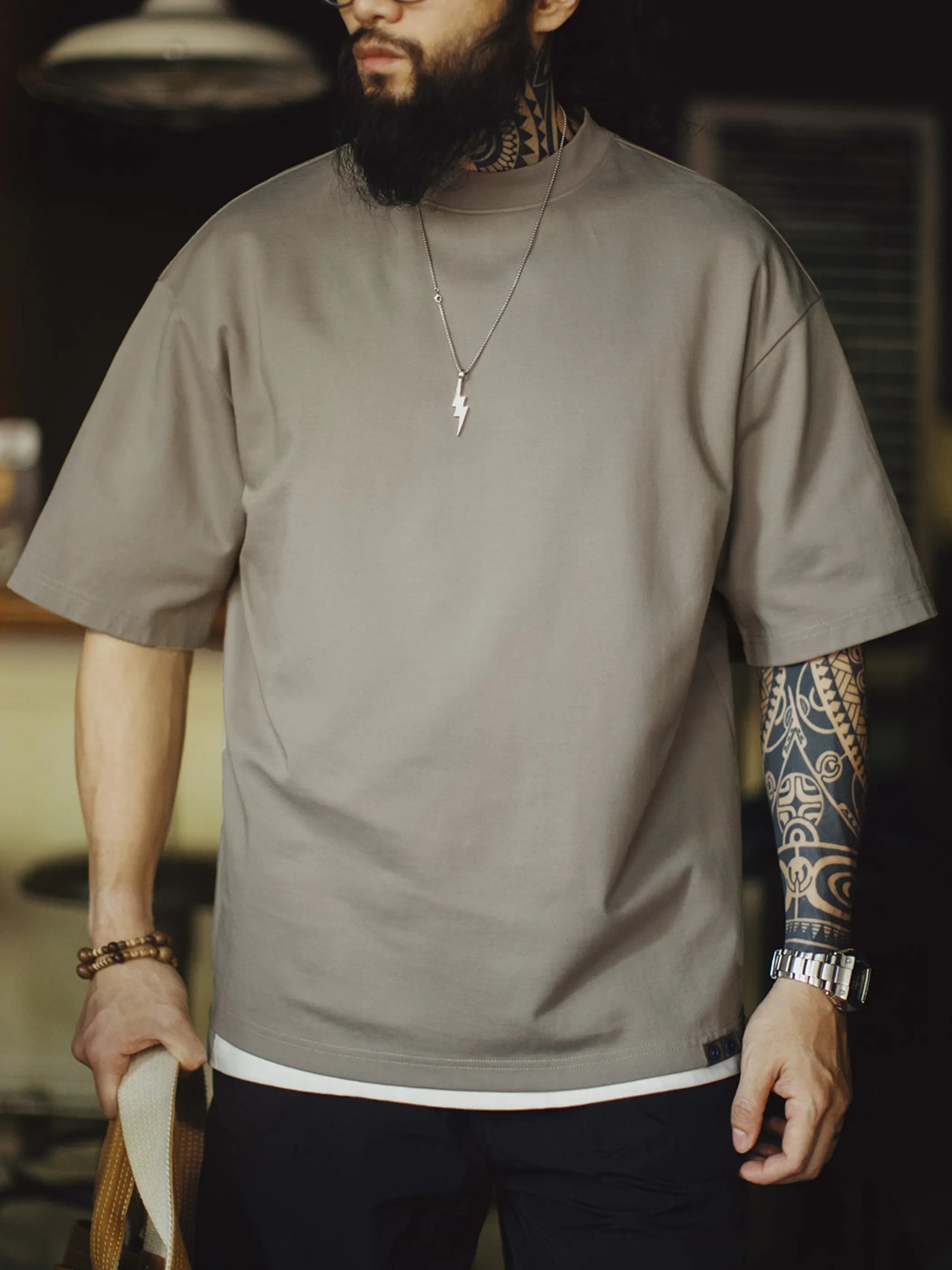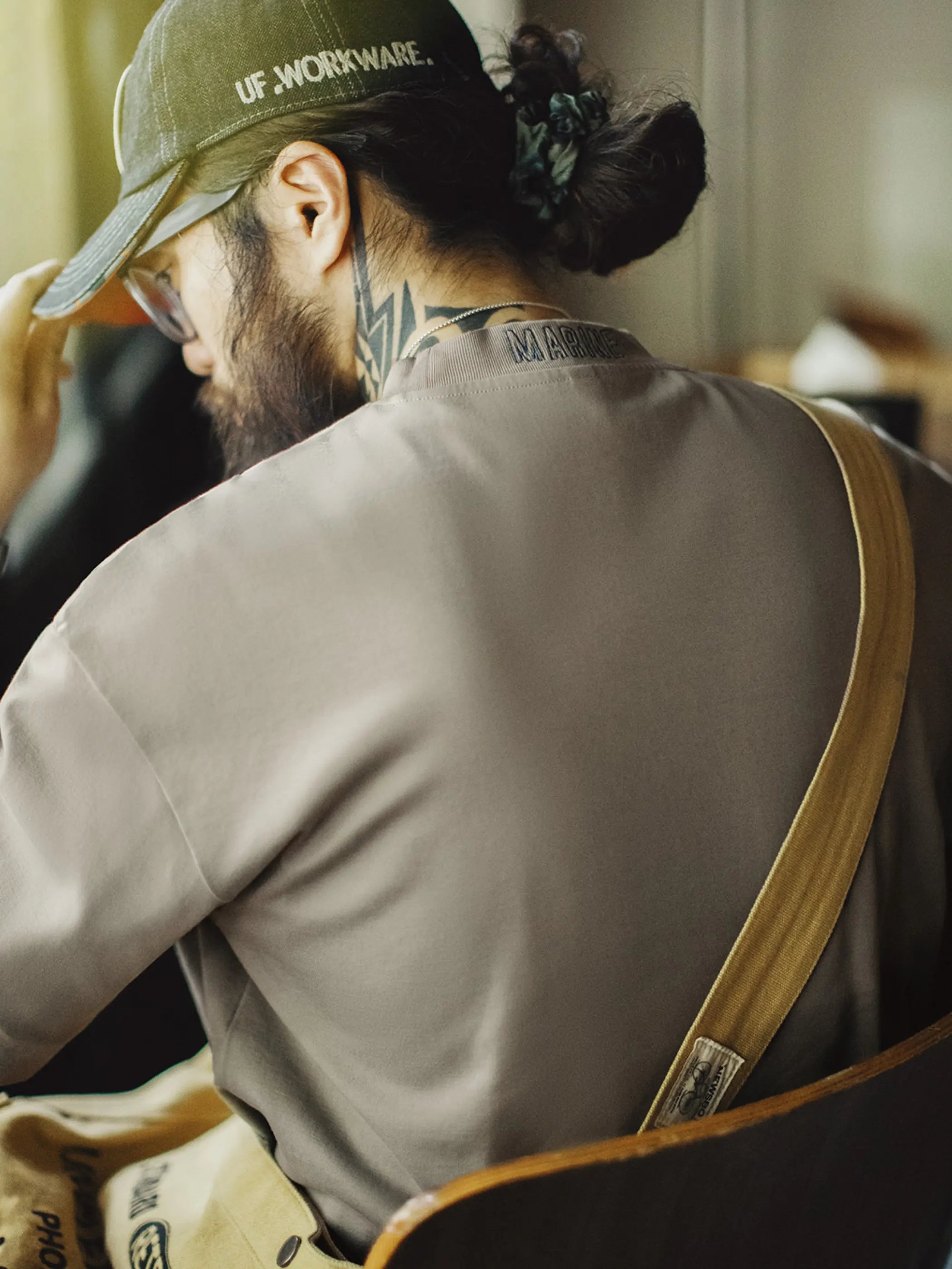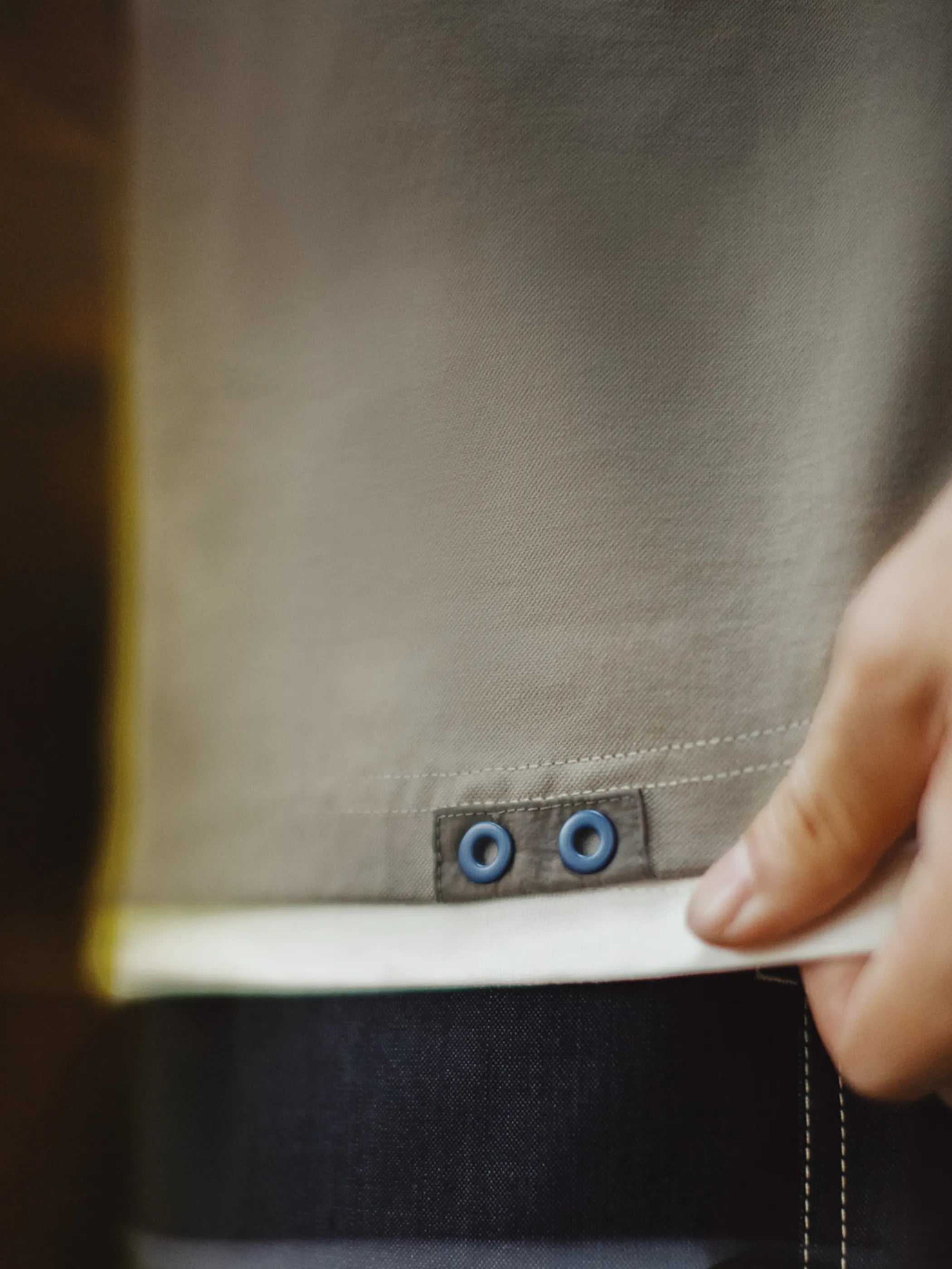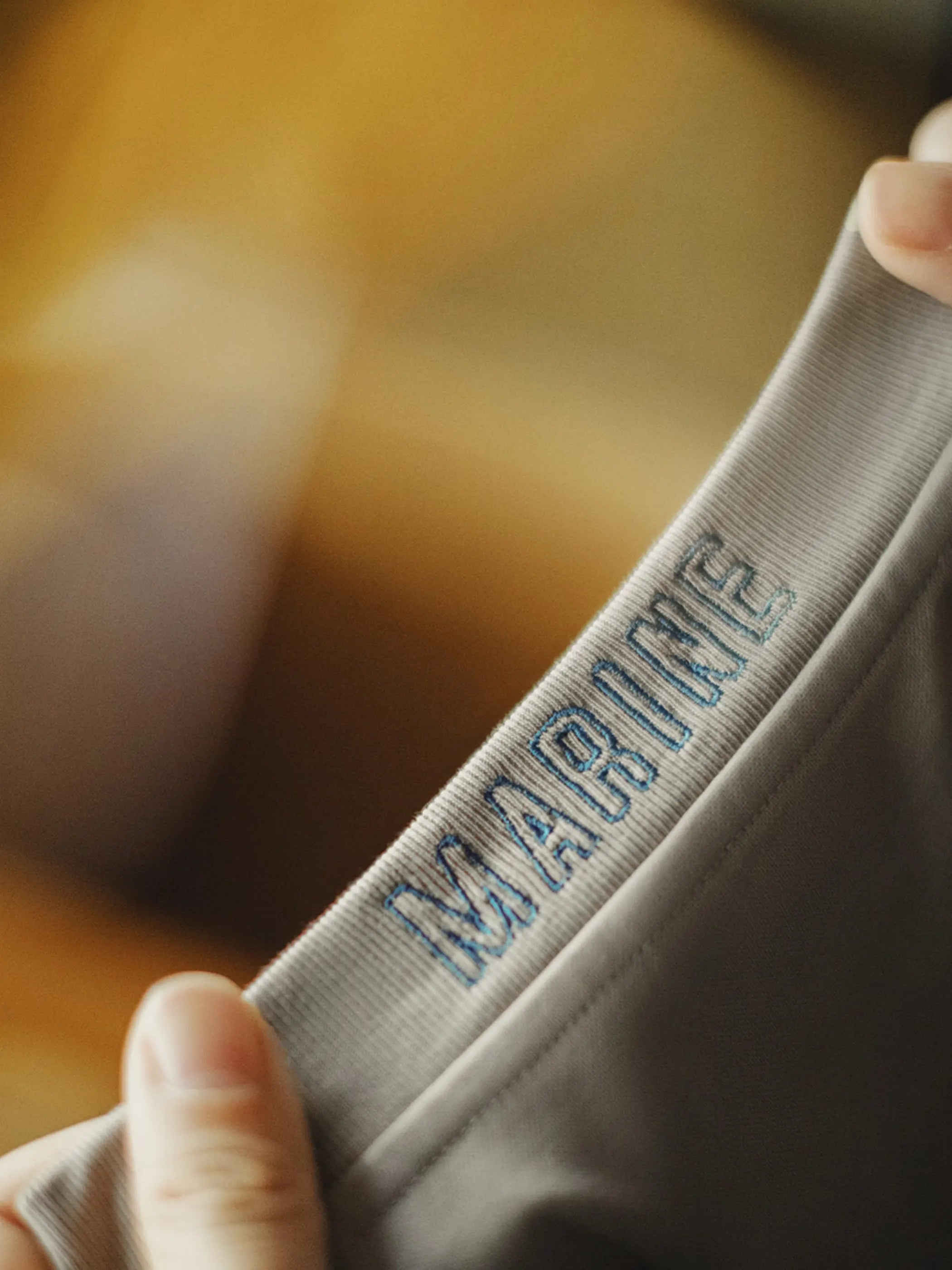 セーラーシャツの立ち襟を現代的に昇華させた小ぶりなハーフハイネックは、着るだけで潔いシルエットを構築。ドロップショルダーとワイドボディが自然な抜け感を演出しつつ、胸元の「MARINE」刺繍が程よいアクセントとなって後ろ姿に視線を集める。発色を抑えたグレイッシュカーキはどんなボトムスとも馴染みやすく、汗ばむ季節も重さを感じさせない63%超のコットン混紡生地が快適な肌触りをキープ。クラシックな海軍ユニフォームの要素を軽やかに取り入れた、一枚で洗練された夏コーデが完成する一着です。