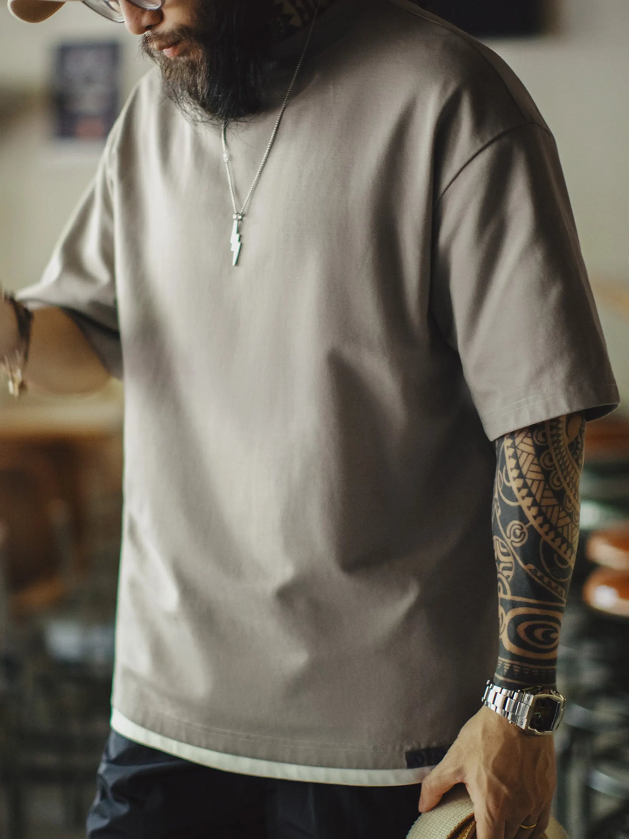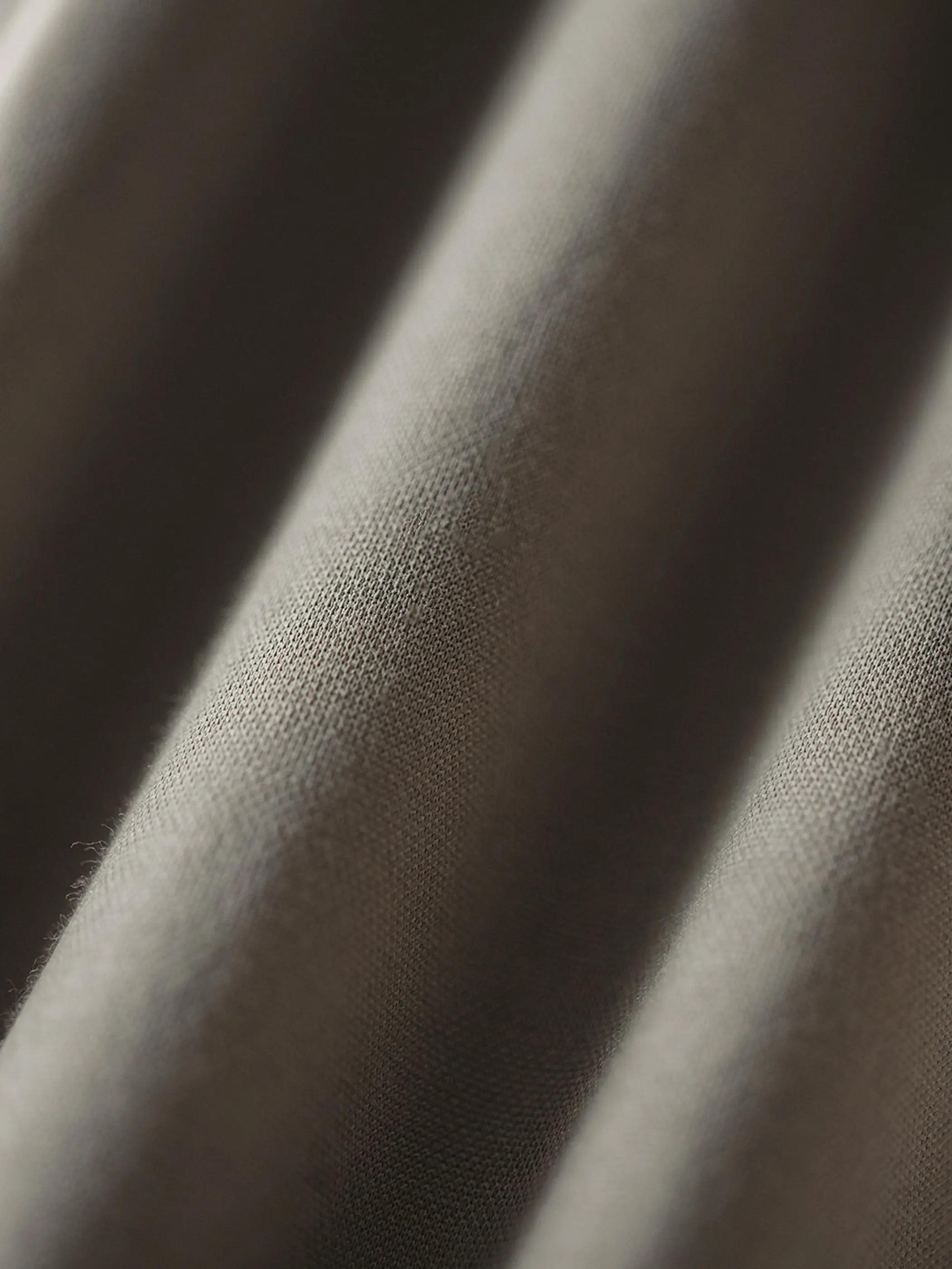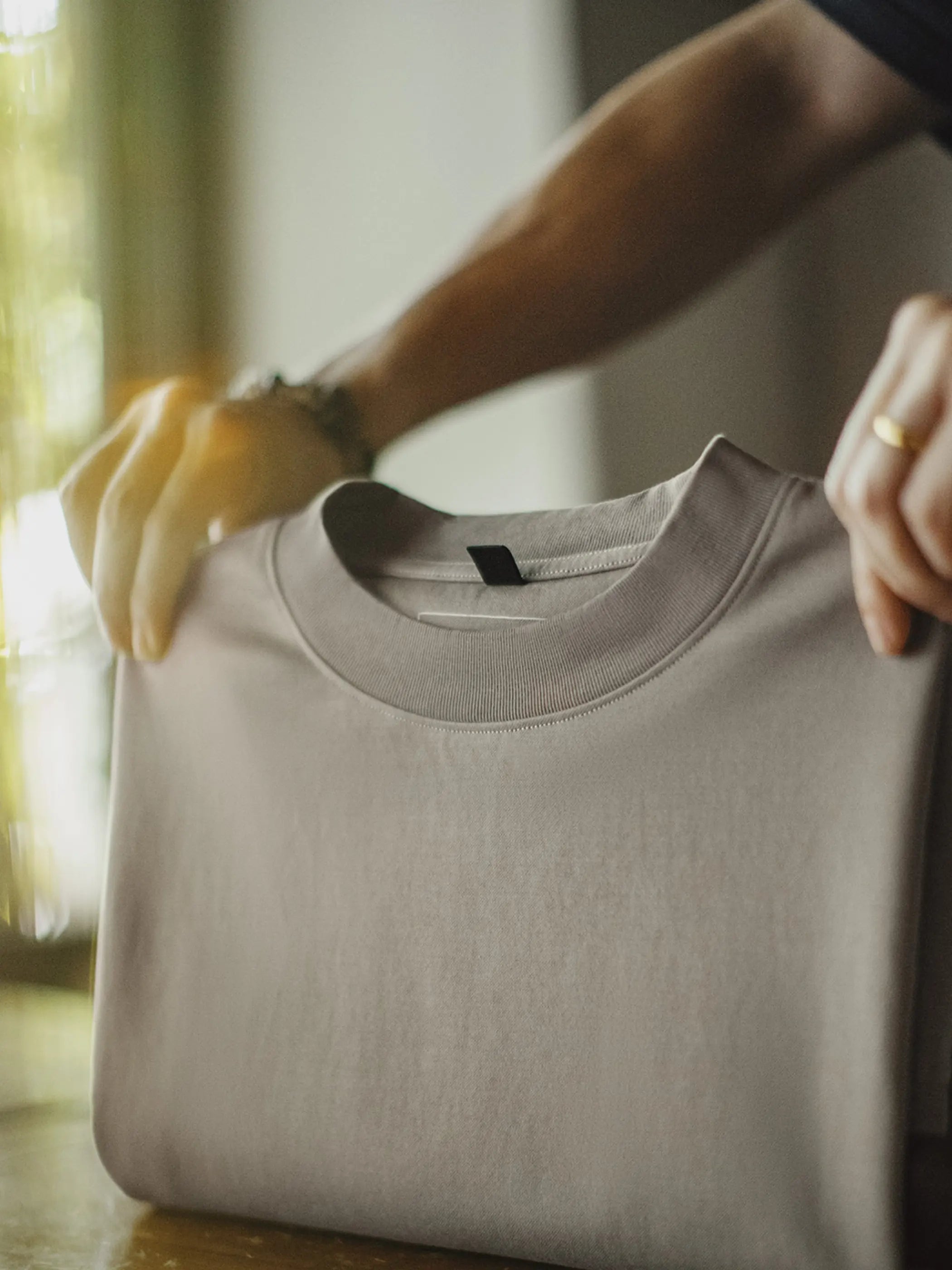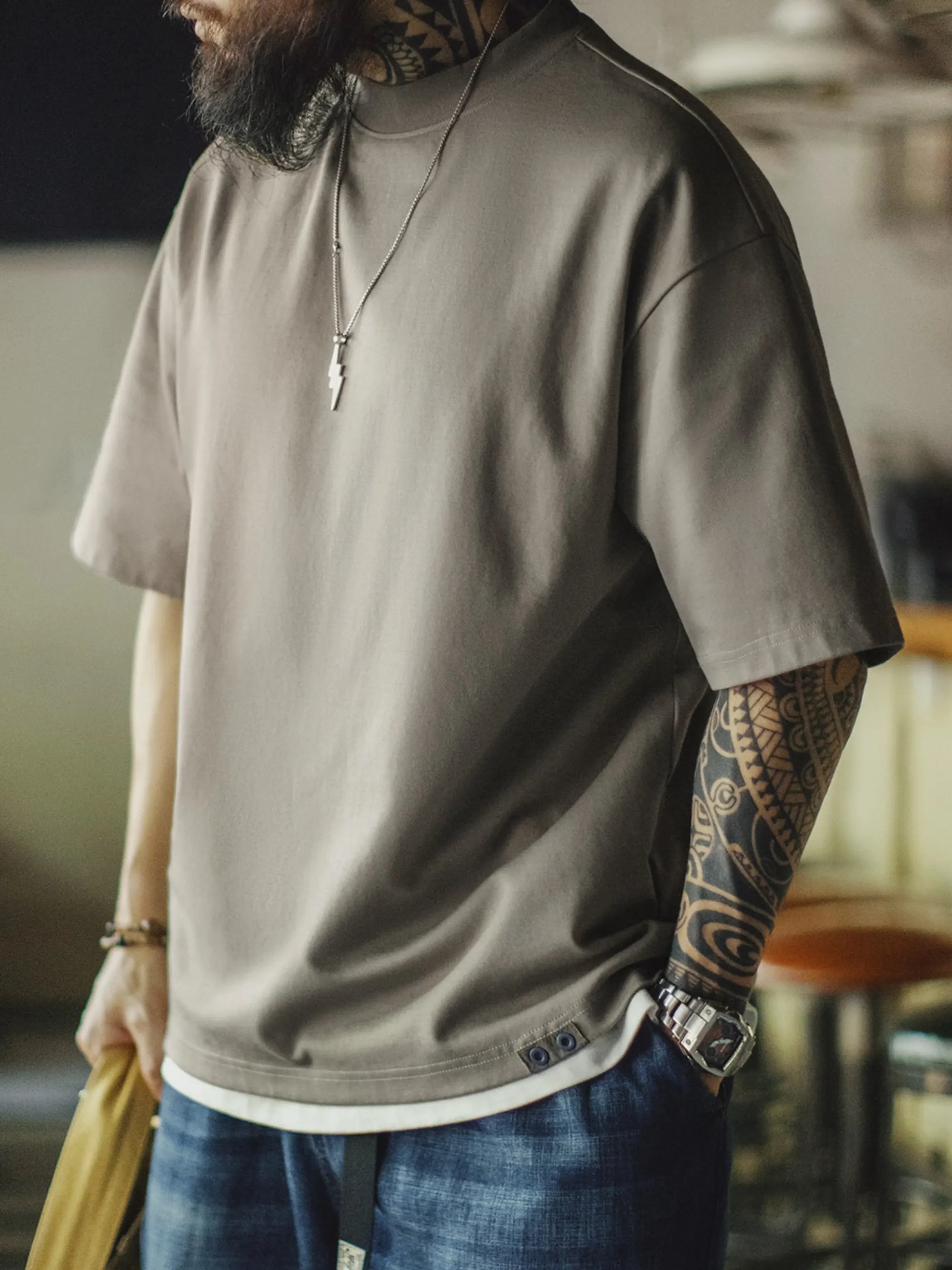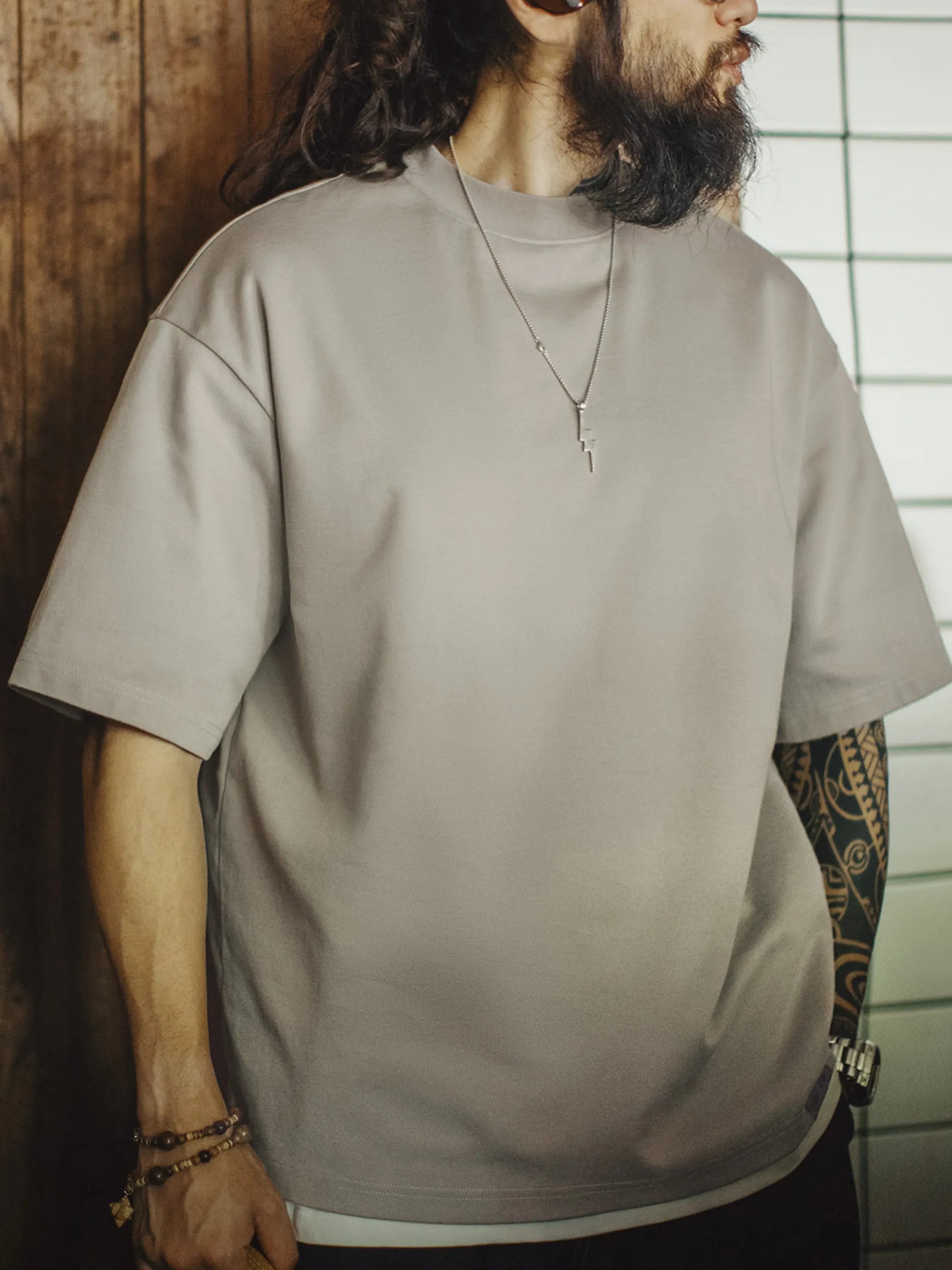 セーラーシャツの立ち襟を現代的に昇華させた小ぶりなハーフハイネックは、着るだけで潔いシルエットを構築。ドロップショルダーとワイドボディが自然な抜け感を演出しつつ、胸元の「MARINE」刺繍が程よいアクセントとなって後ろ姿に視線を集める。発色を抑えたグレイッシュカーキはどんなボトムスとも馴染みやすく、汗ばむ季節も重さを感じさせない63%超のコットン混紡生地が快適な肌触りをキープ。クラシックな海軍ユニフォームの要素を軽やかに取り入れた、一枚で洗練された夏コーデが完成する一着です。