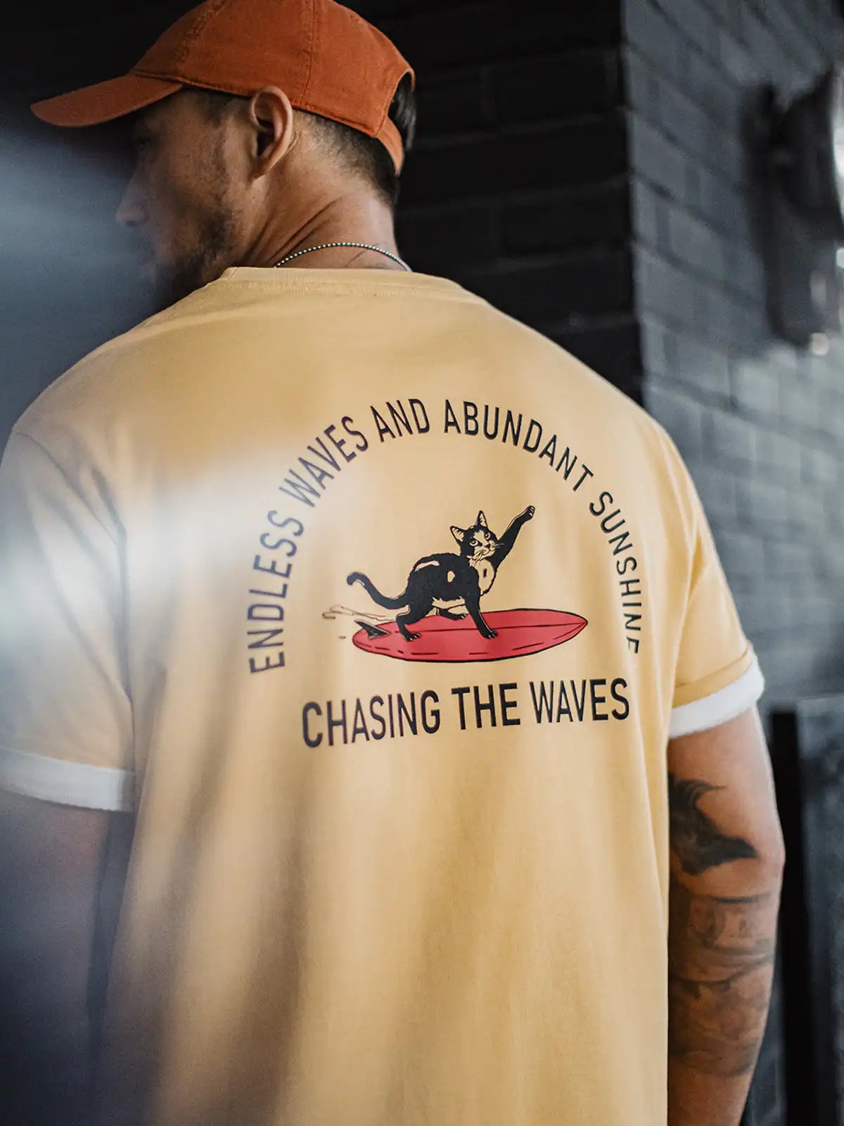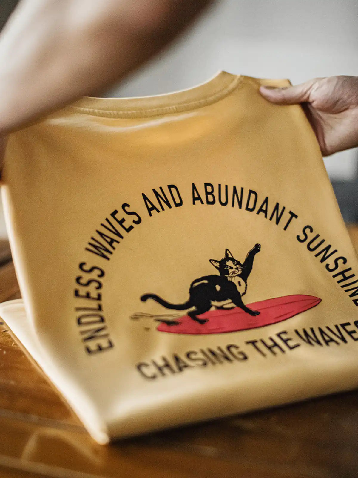 70年代サーフカルチャーを彷彿とさせる黒猫×赤サーフボードの立体発泡プリントが魅力の235gヘビーウェイトコットンTシャツ。