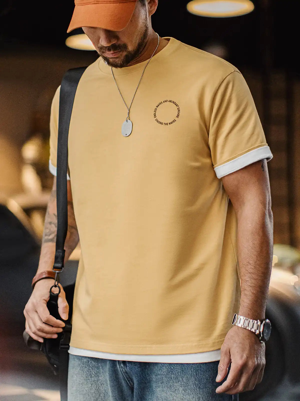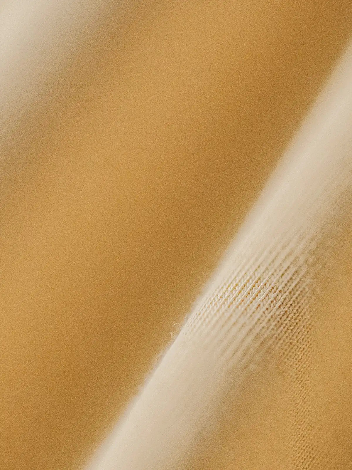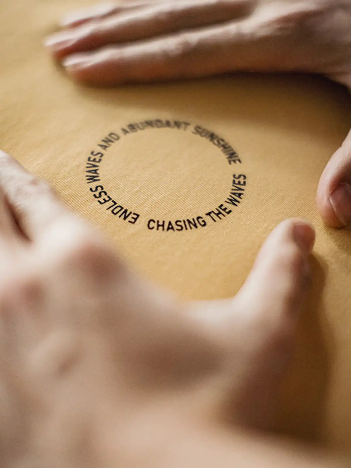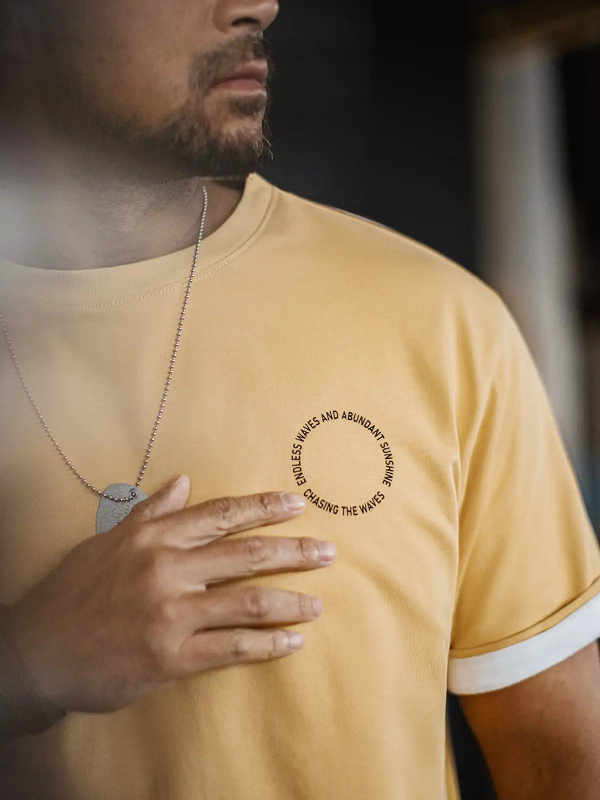 ヴィンテージサーフムーブメントへのオマージュとして、背面に「ENDLESS WAVES AND ABUNDANT SUNSHINE/CHASING THE WAVES」のメッセージとともに黒猫が赤サーフボードを駆けるデザインを立体発泡プリントで表現し、姜(ショウガ)イエローの厚手コットン生地が海辺の日差しとも相性抜群で、ショーツやデニムと合わせるだけで一気にサマー&ストリートのムードが高まる。