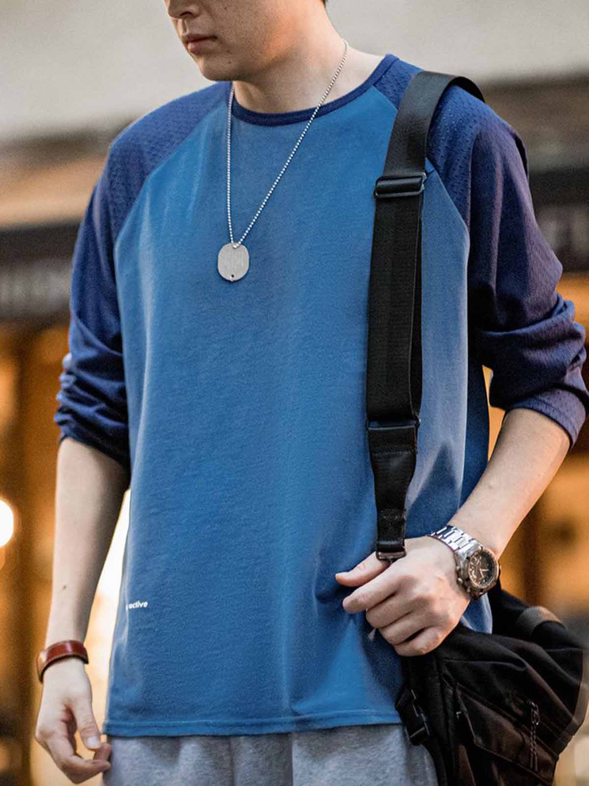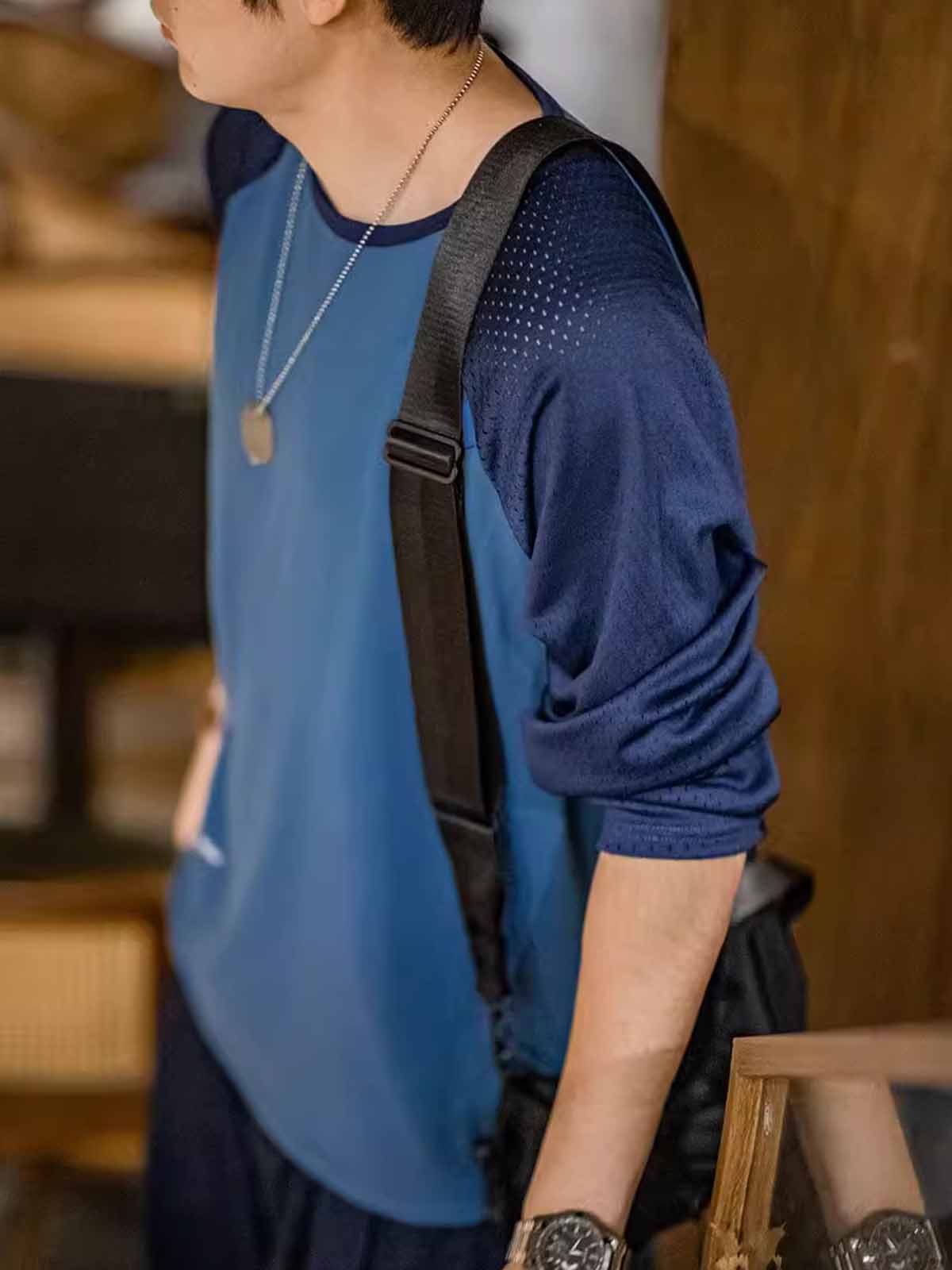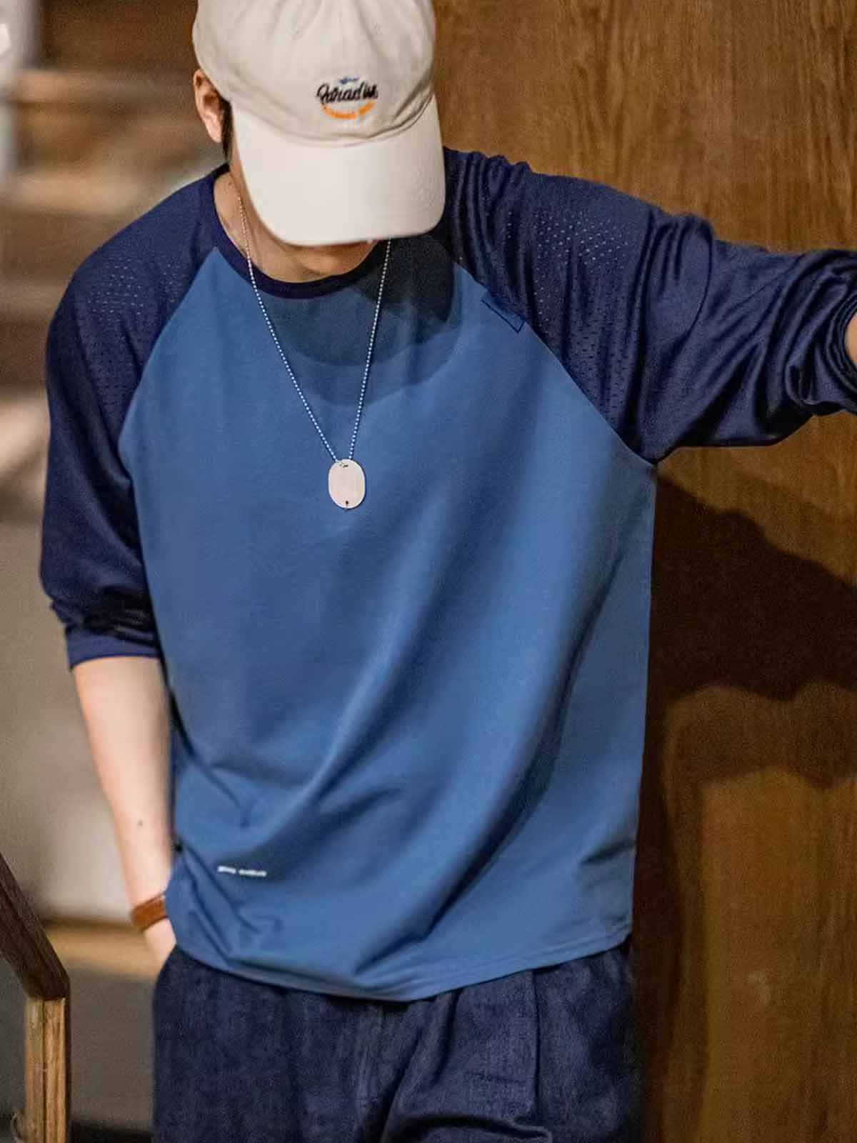 アメリカンカジュアル風に着想を得た、通気性メッシュと快適な綿生地を組み合わせた丸首長袖Tシャツです。