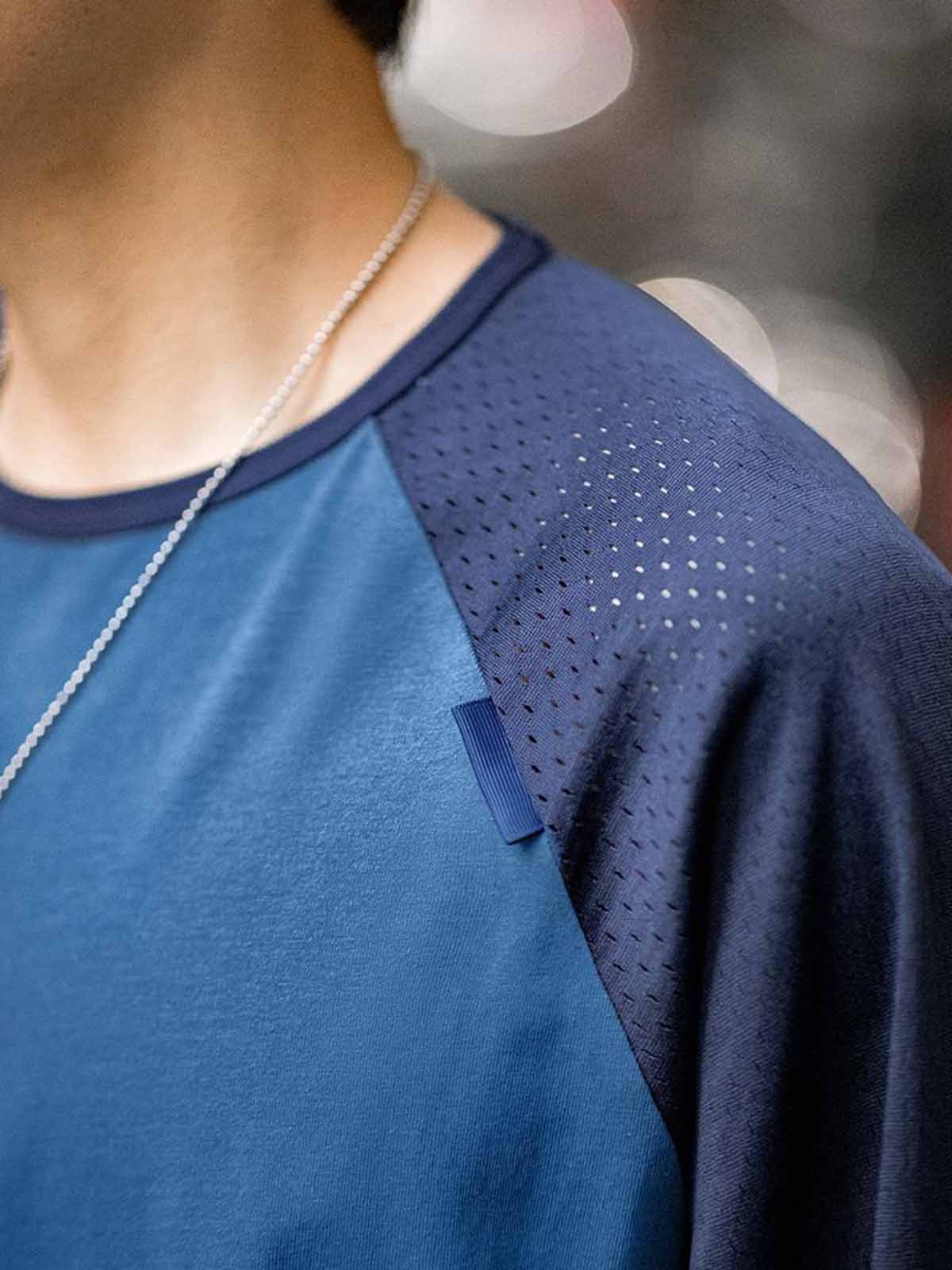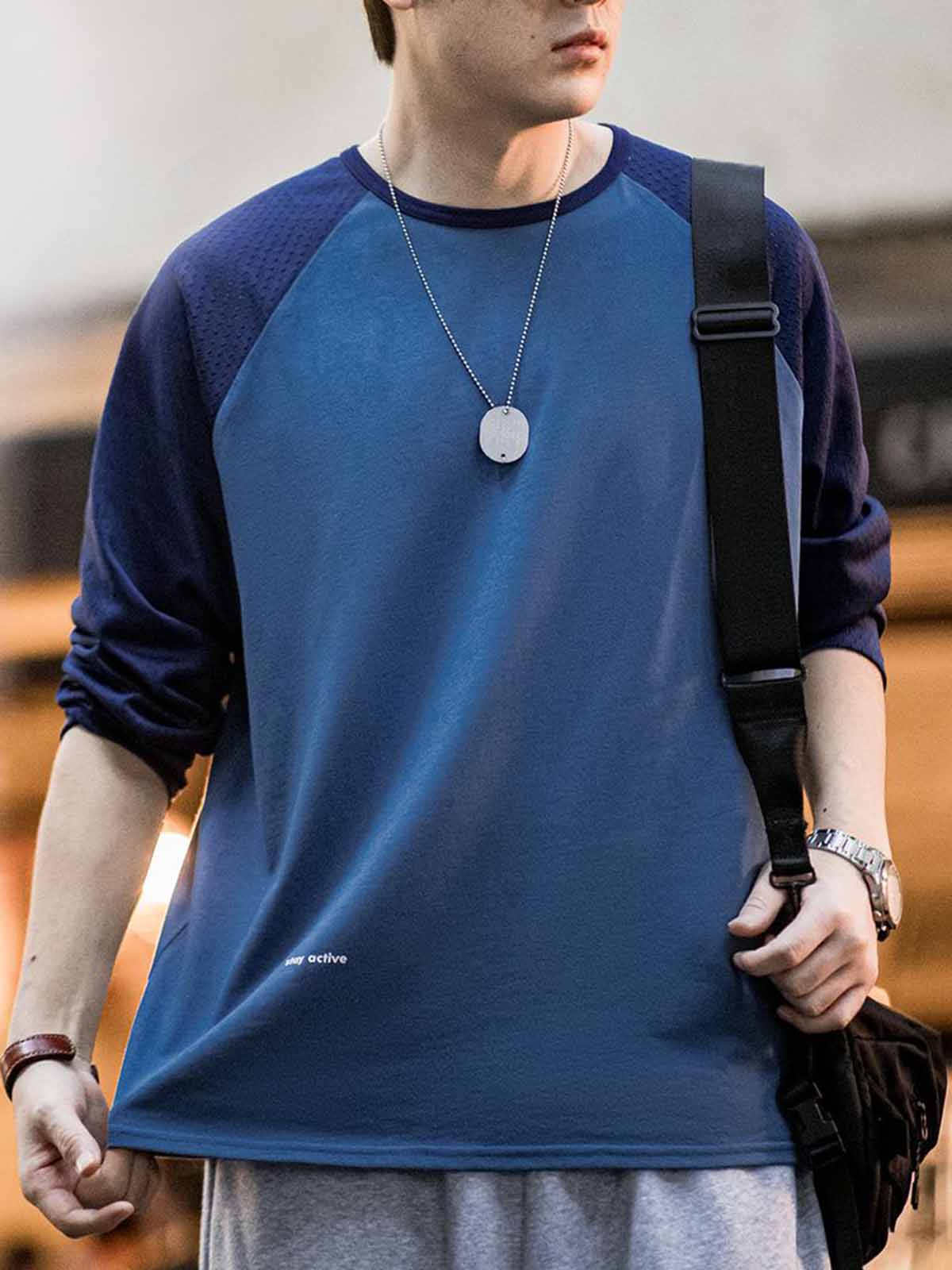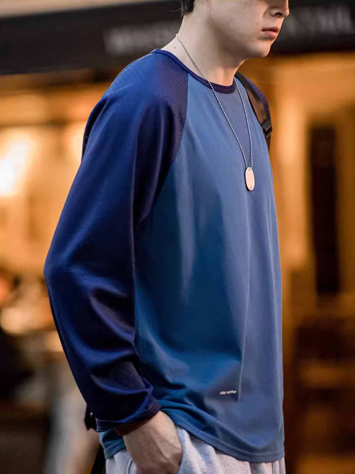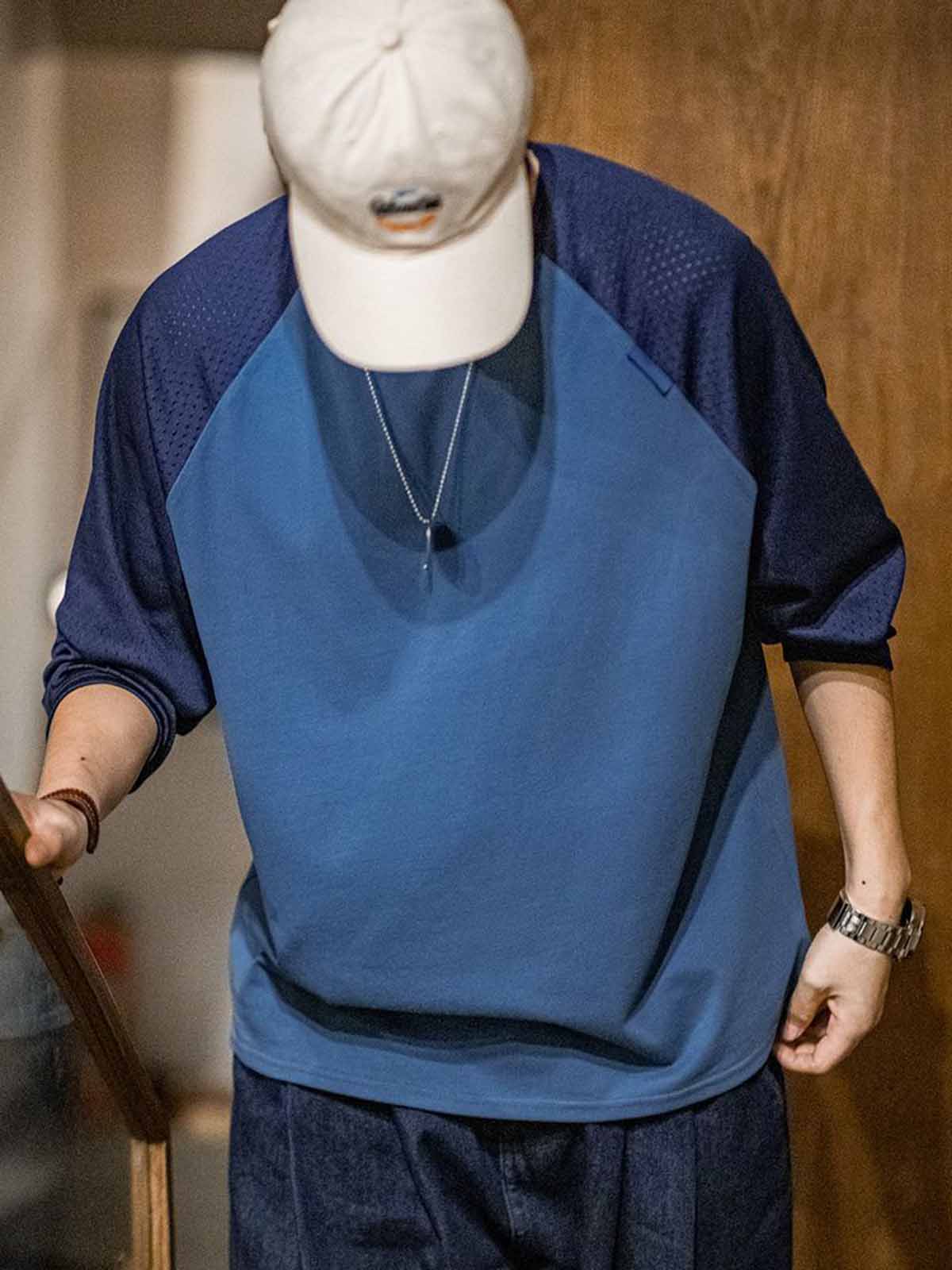 アメリカンカジュアル風に着想を得た、通気性メッシュと快適な綿生地を組み合わせた丸首長袖Tシャツです。