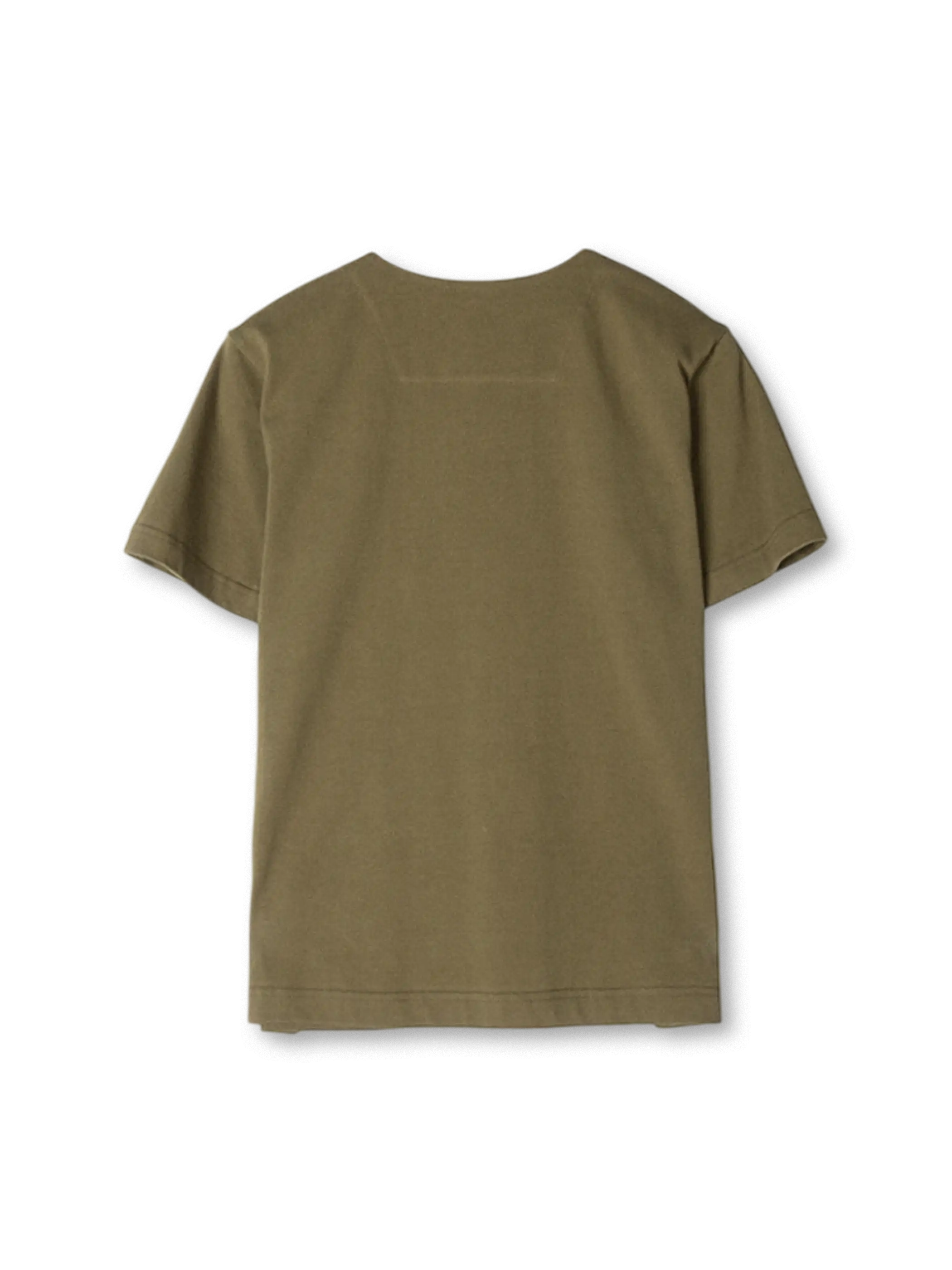 胸元にプラケット(前立て)をあしらった、レトロなアメリカンテイストの半袖Tシャツ。2種類の生地バリエーション(A・B)から選べる。