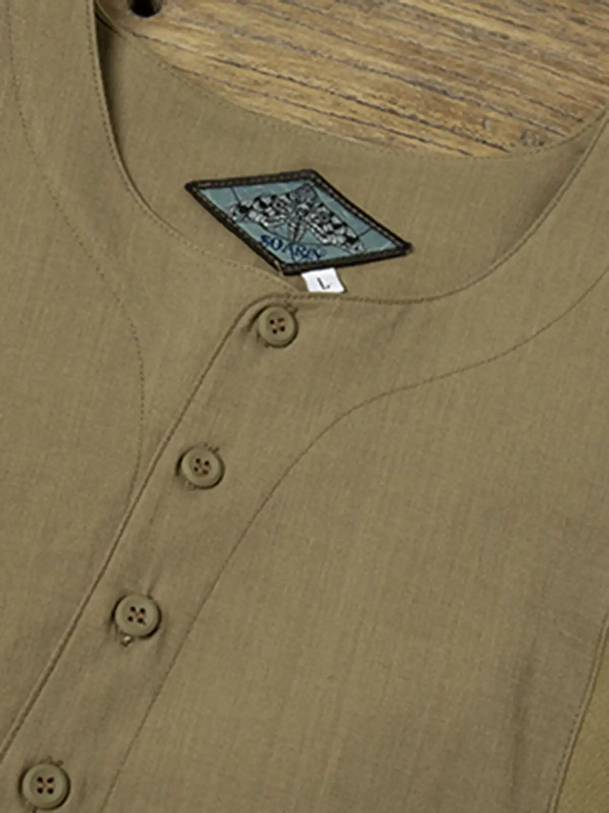 このTシャツは、胸元にプラケットをあしらったデザインが特徴で、伝統的なヘンリーネックスタイルが無骨なアメカジテイストを醸し出します。素材はAタイプがコットン100%、Bタイプがテンセル30%、リネン25%、コットン45%の混紡生地を使用しており、どちらも軽量ながらしっかりとした着心地と優れた通気性を実現しています。プラケットとボタンディテールがアクセントとなり、シンプルながら存在感のあるデザインは、単体で着用してもインナーとしても活躍し、デニムやワークパンツとの相性も抜群です。夏のカジュアルスタイルはもちろん、フェスやアウトドアシーンでも快適に着こなせる一着です。