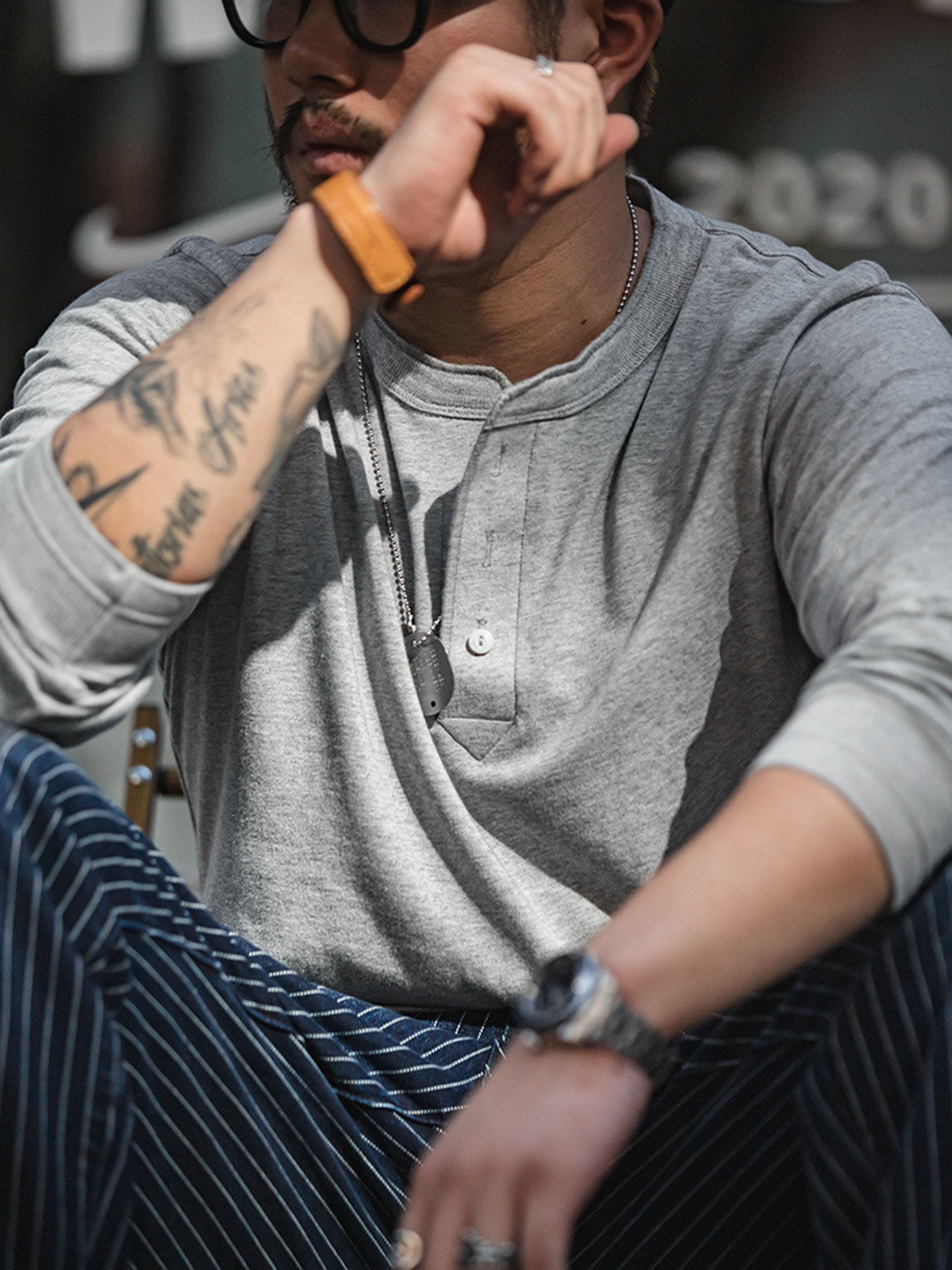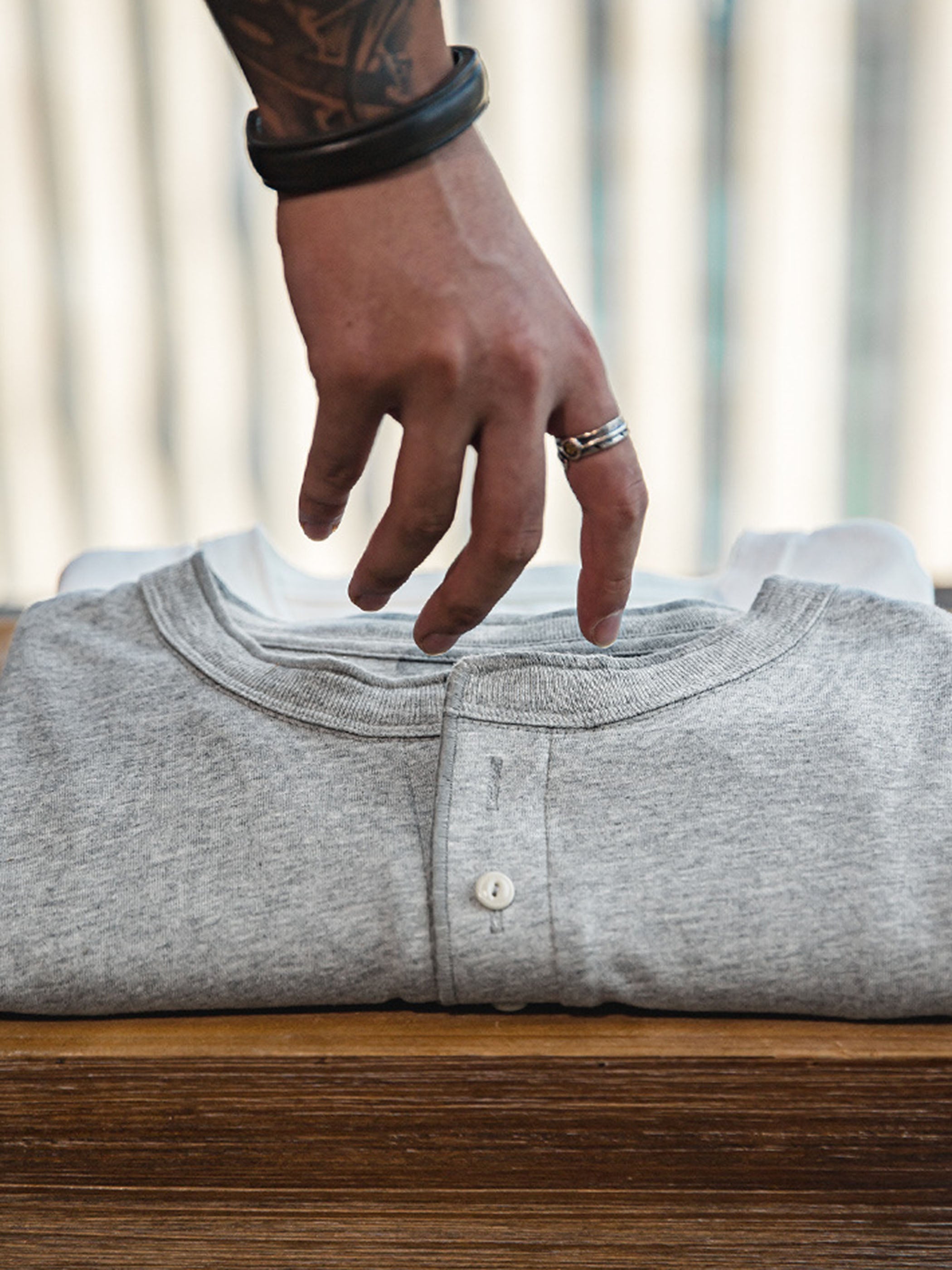 クラシックなヘンリーネックデザインとヘビーウェイトコットンが融合した、無骨なヴィンテージスタイルのTシャツ。