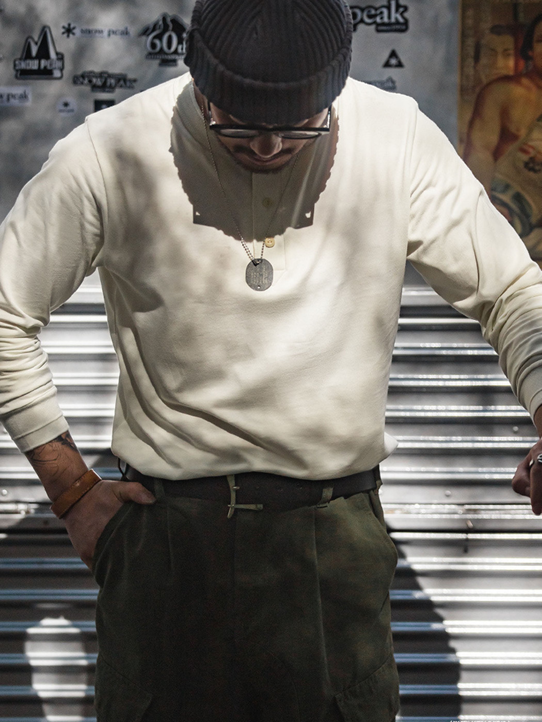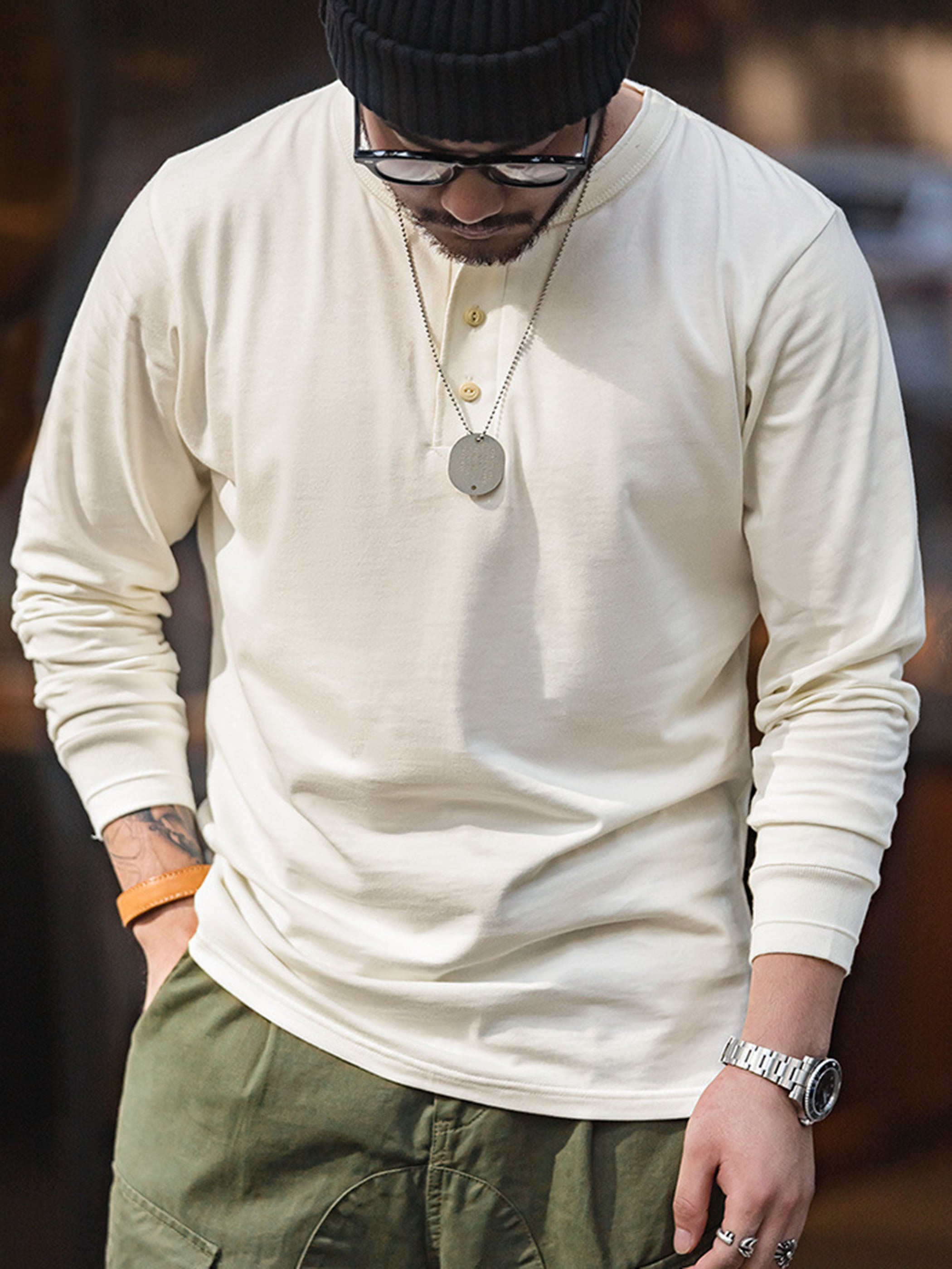ワークウェアの定番として長年愛されてきたヘンリーネックTシャツを、現代的なシルエットとヴィンテージの風合いで再現。厚みのあるヘビーウェイトコットンを使用し、耐久性に優れながらも柔らかく、肌触りの良い着心地を実現。二重仕立ての襟元が型崩れを防ぎ、長時間の着用でも快適さをキープ。