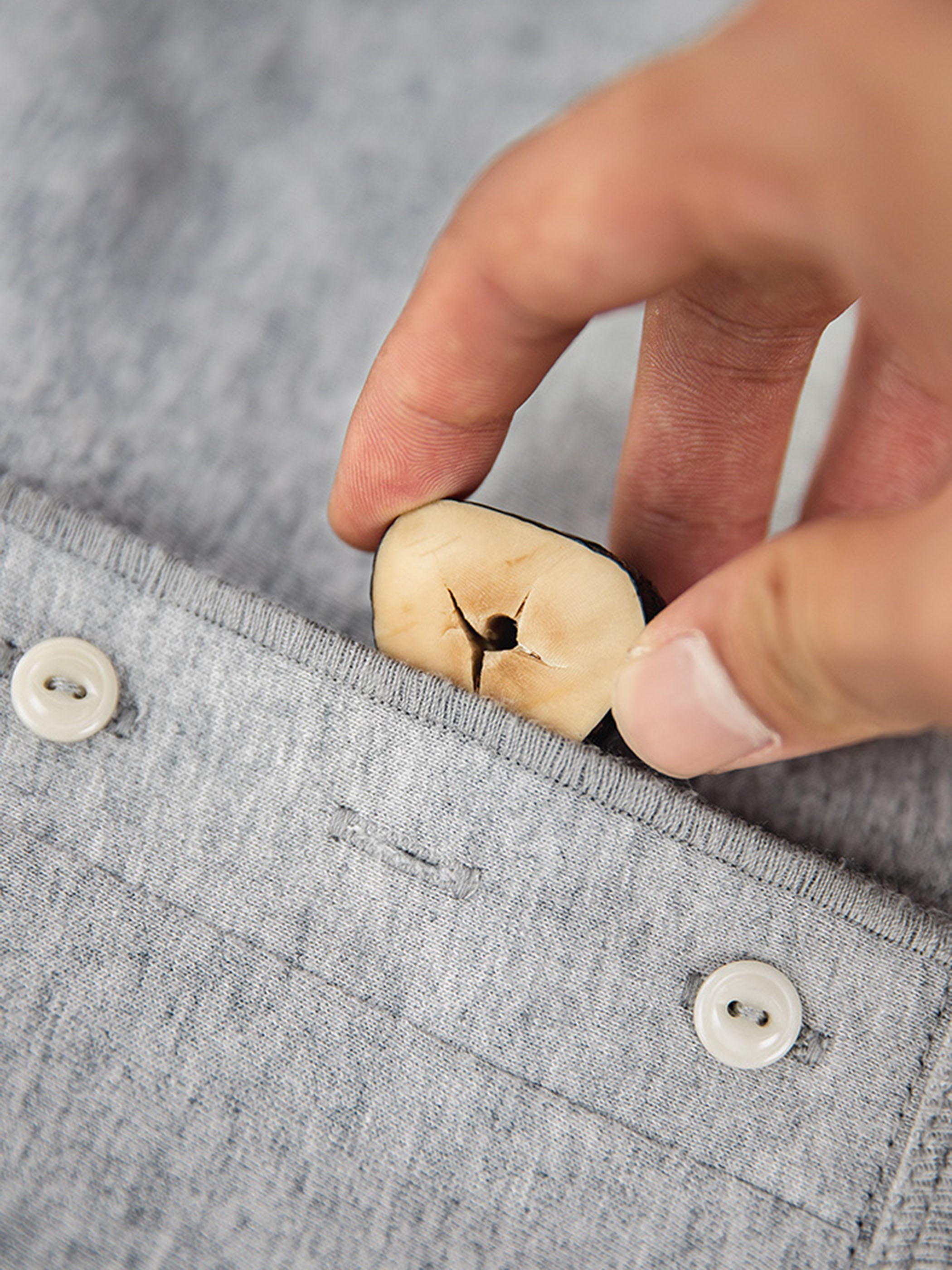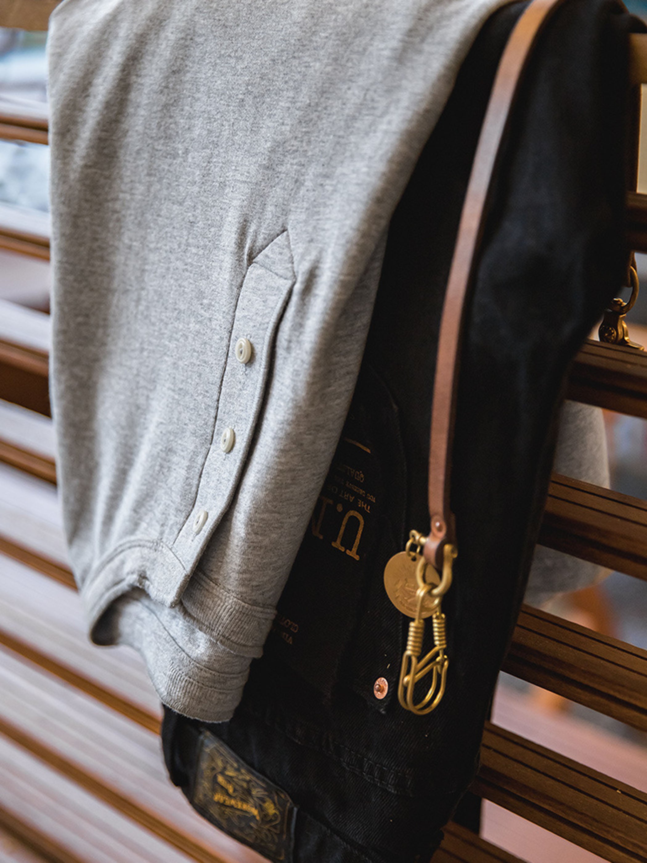 フロントにはアイボリーナットボタンを採用し、クラシックなディテールを強調。ワークパンツやデニムとの相性が抜群で、1枚で着ても存在感があり、ジャケットやシャツとのレイヤードにも対応する万能アイテム。オールシーズン着用できるベーシックながら個性的な一着。