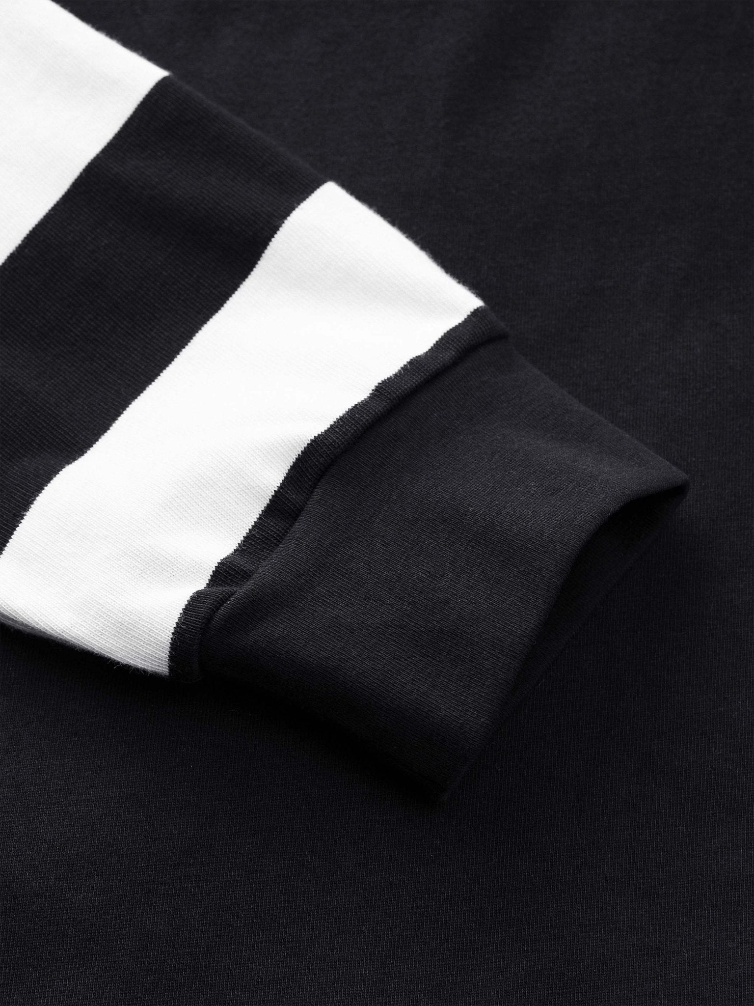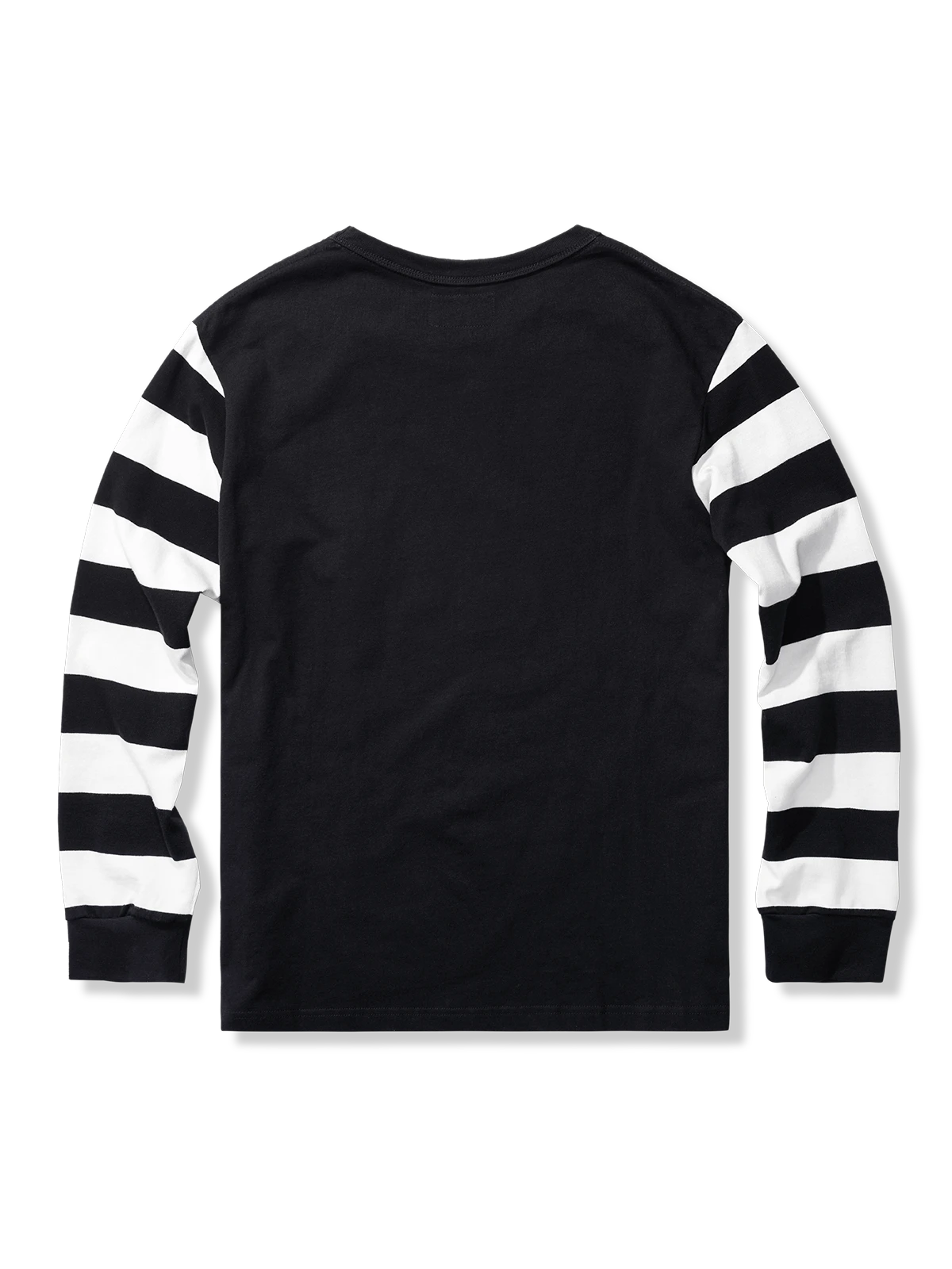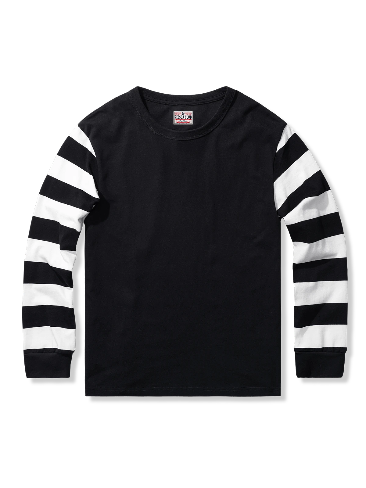 ストレートシルエットのバイカーTシャツをベースに、袖の部分をボーダー切替することで立体的なシルエットを出しています。