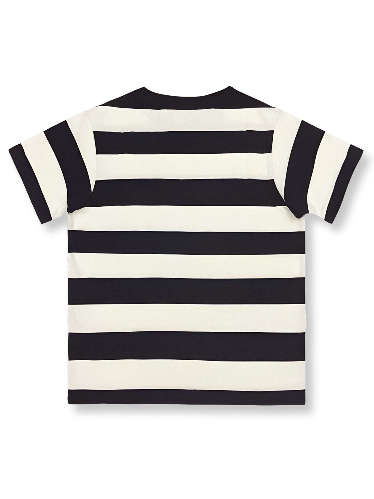 この半袖Tシャツはブラック&ホワイトの太いストライプ柄です。クラシックでシンプルでありながら、どんな場面やスタイルにも合うデザインです。