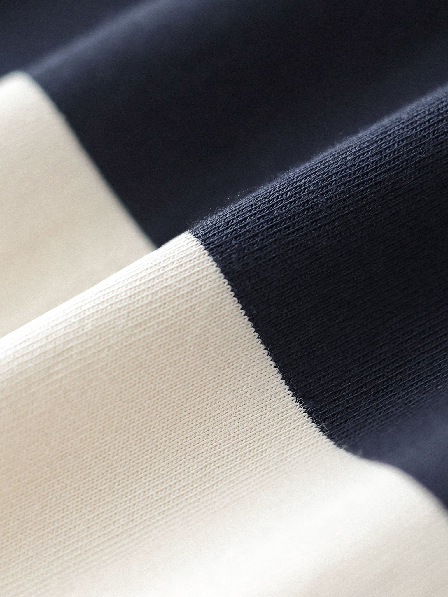 ロングリブの襟デザインは変形しにくく、襟の清潔さと形状を保ちます。また、サイドと袖口の三本針ステッチによる補強は、衣服の耐久性を高め、細部の洗練さと品質感を増します。