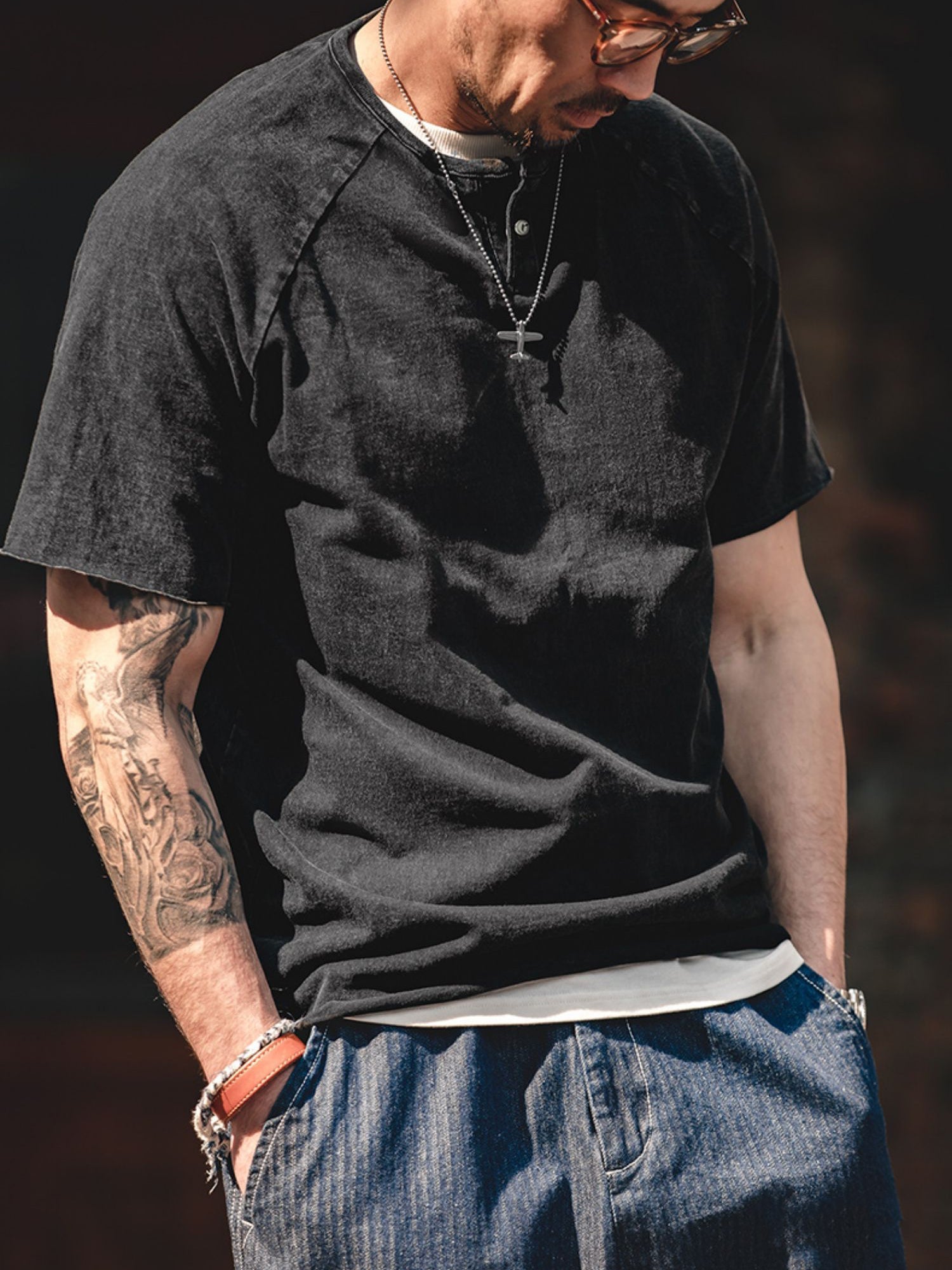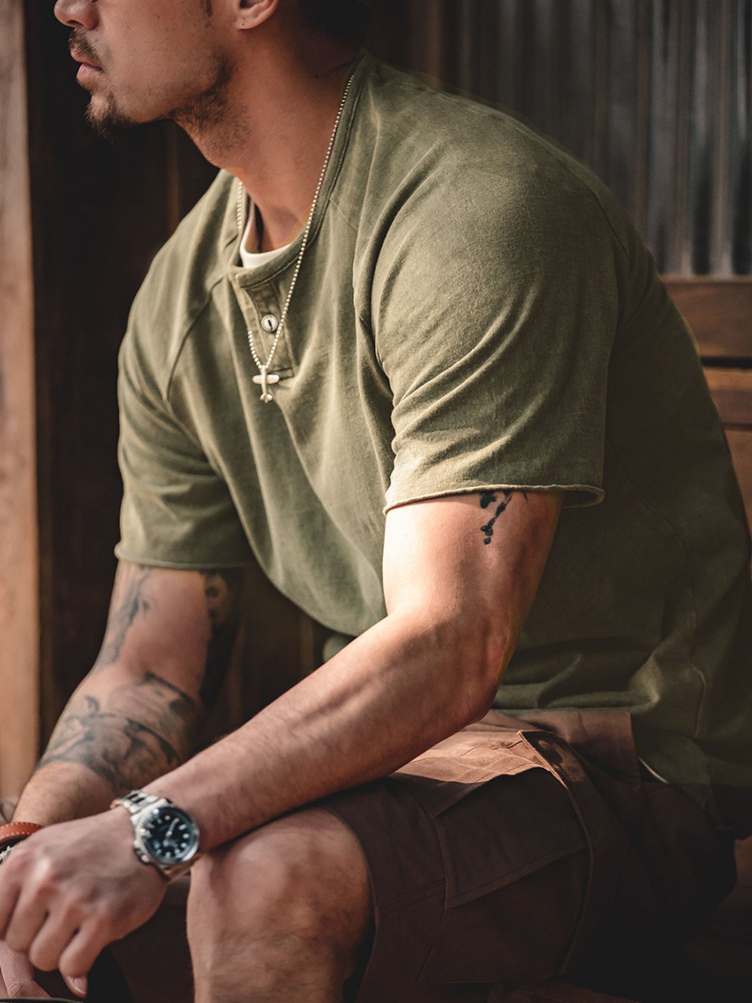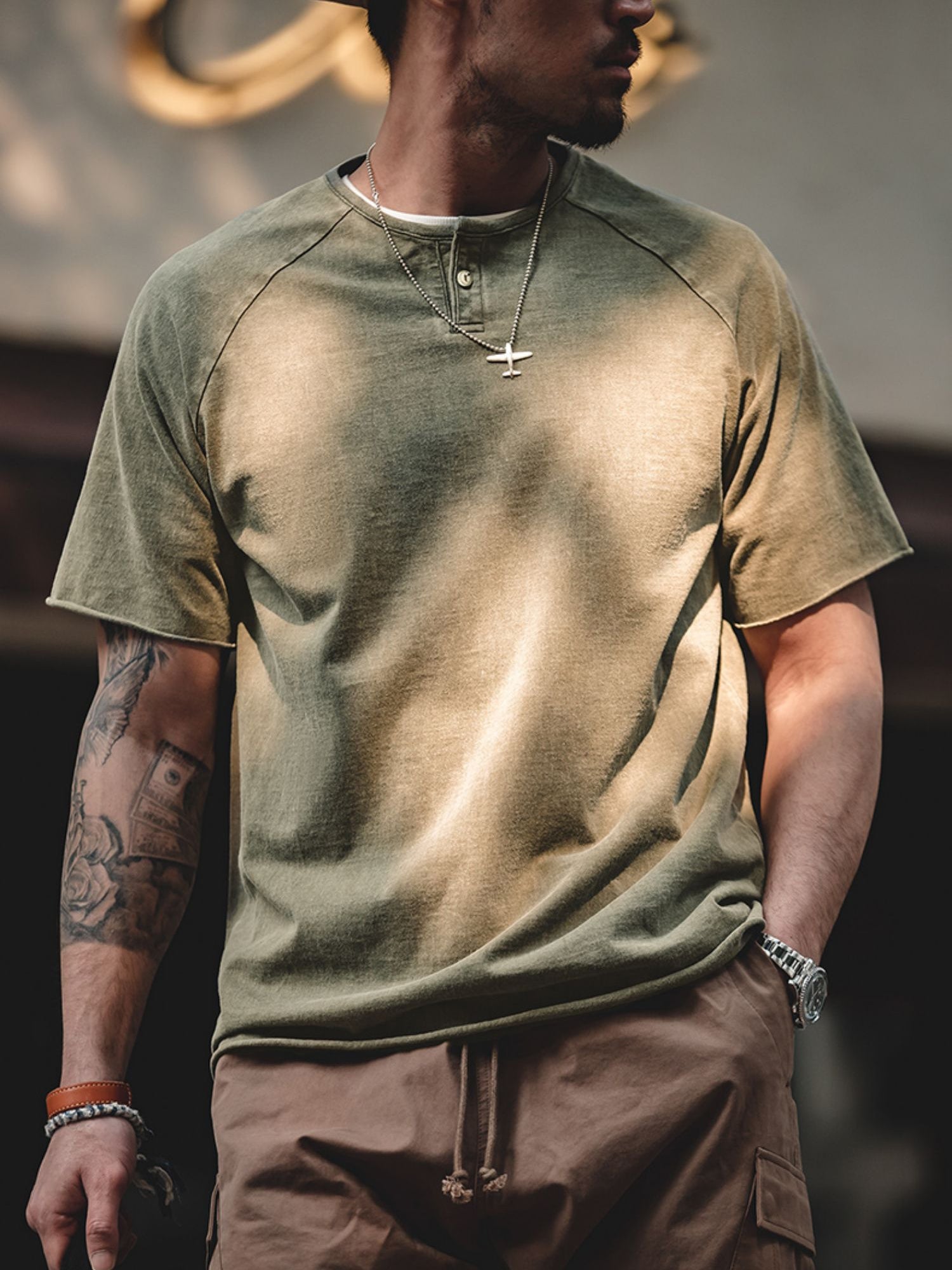 クルーネックをベースにしたヘンリーネックは、英国のボートレース「ヘンリー・ロイヤル・レガッタ」のユニフォームに由来しています。春夏のコーディネートにおいて、クルーネックTシャツにアクセントを加えるのに最適で、ワークやミリタリーテイストのアイテムとも相性抜群です。