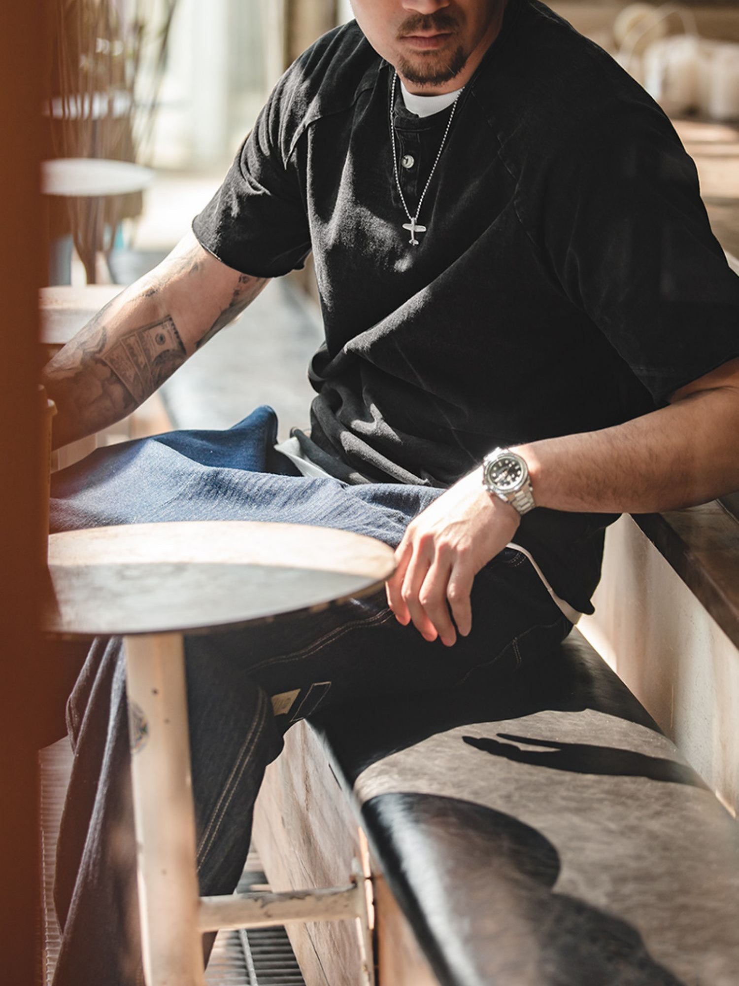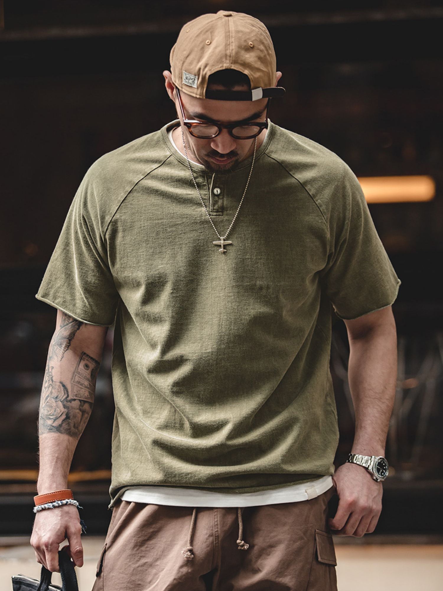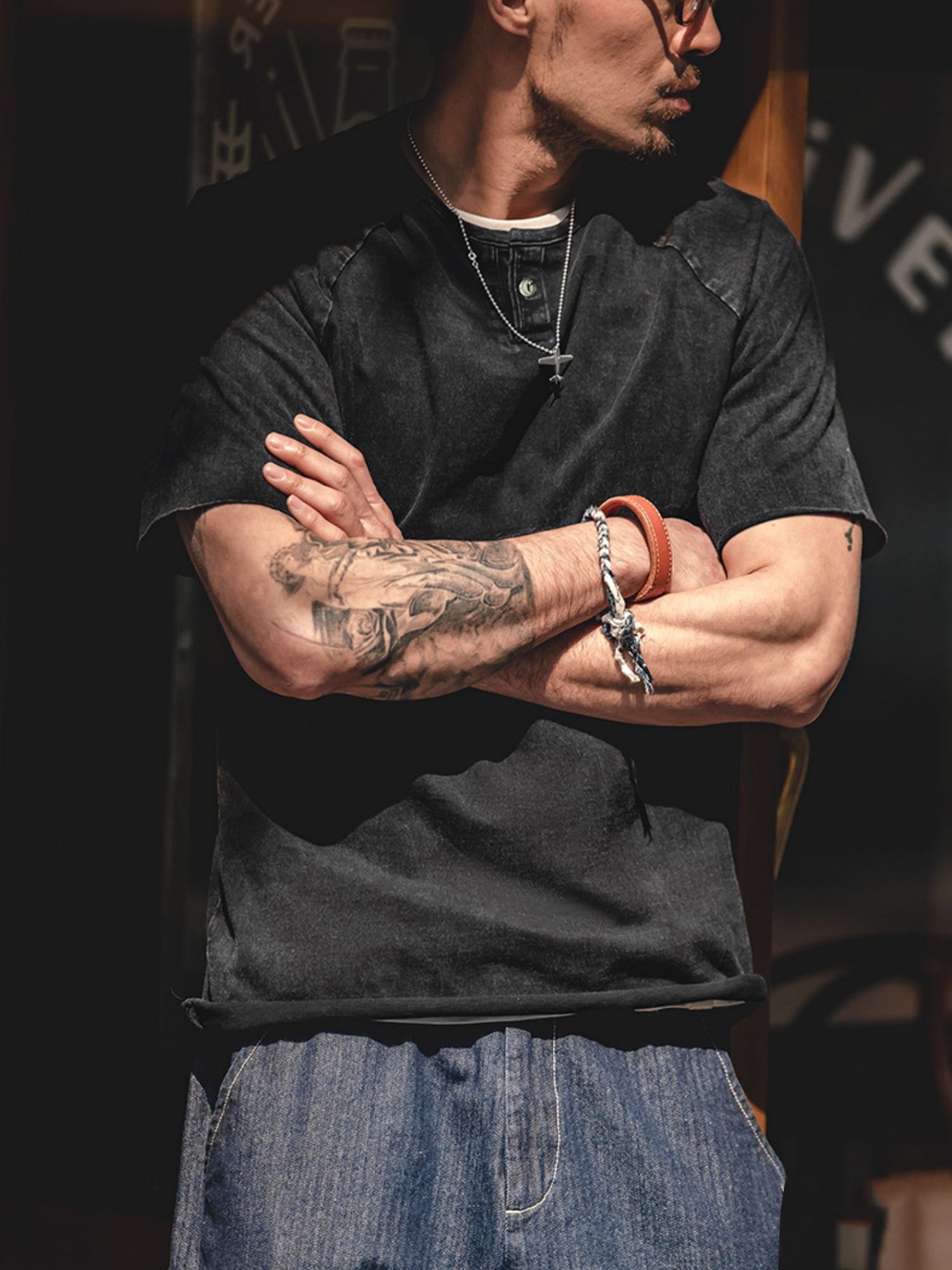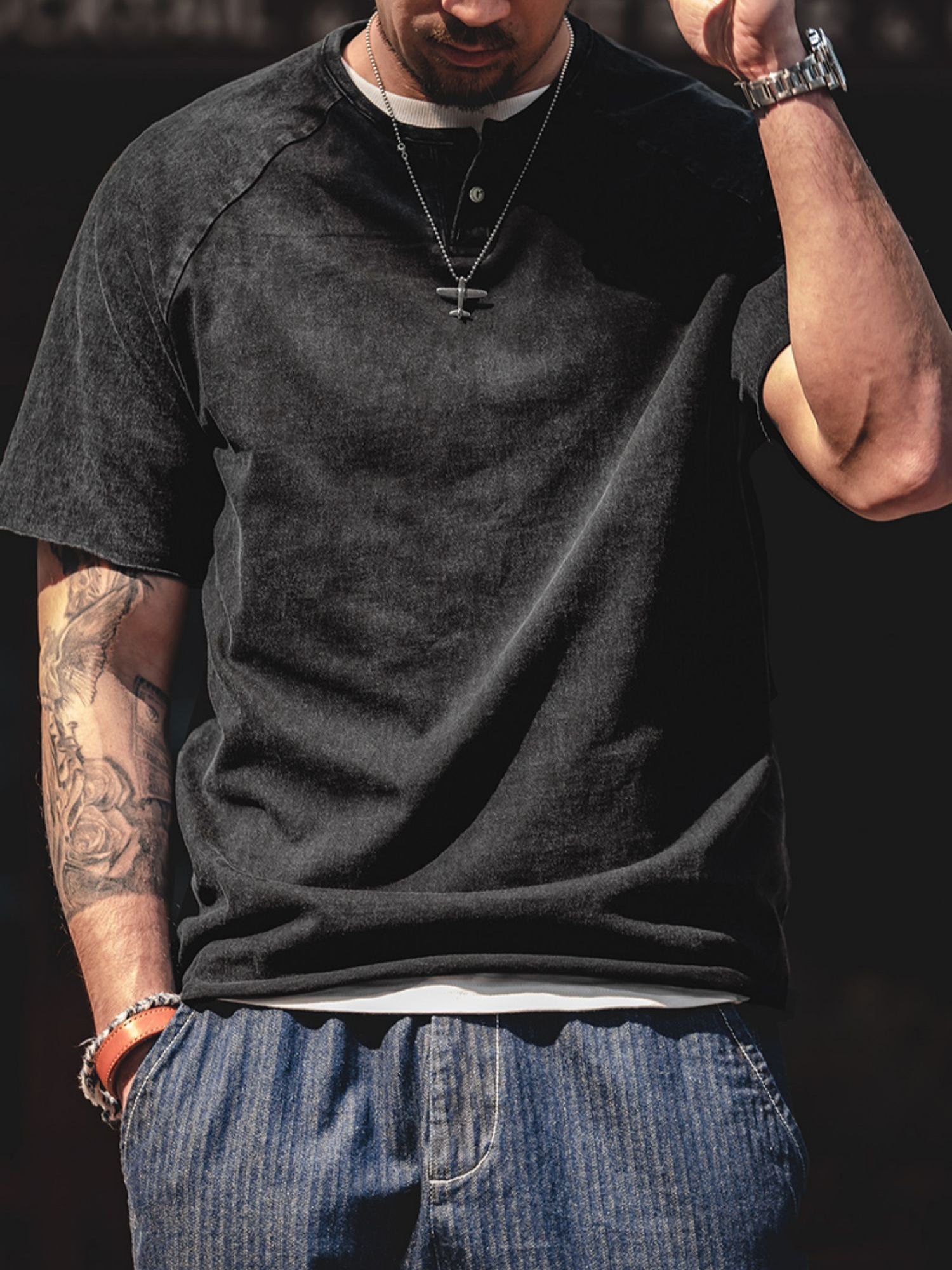 クルーネックをベースにしたヘンリーネックは、英国のボートレース「ヘンリー・ロイヤル・レガッタ」のユニフォームに由来しています。春夏のコーディネートにおいて、クルーネックTシャツにアクセントを加えるのに最適で、ワークやミリタリーテイストのアイテムとも相性抜群です。